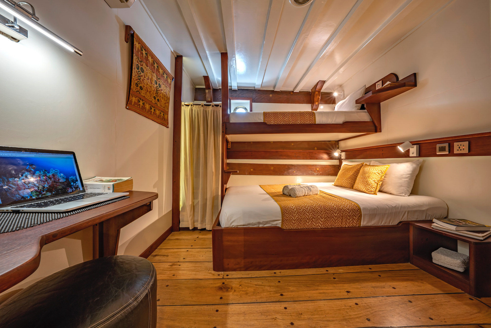 32米长的M/V Ambai潜水船宿一年四季为您安排潜水旅行,带您探访五个精彩的生物多样性区域:哈马黑拉(Halmahera)、崔顿湾(Triton Bay)、班达海(Banda Sea)、遗忘群岛(The Forgotten Islands)和拉贾安帕特(Raja Ampat)。经验丰富的16名船员将确保宾客在水上和水下的舒适以及满意。Ambai最多可容纳16位宾客,提供8间豪华客舱。每间客舱都配有独立调节的空调和带淋浴的私人浴室。宾客可以在空调休息室、阴凉甲板和日光甲板上放松,每种空间都提供时尚舒适的座椅和宁静的环境。