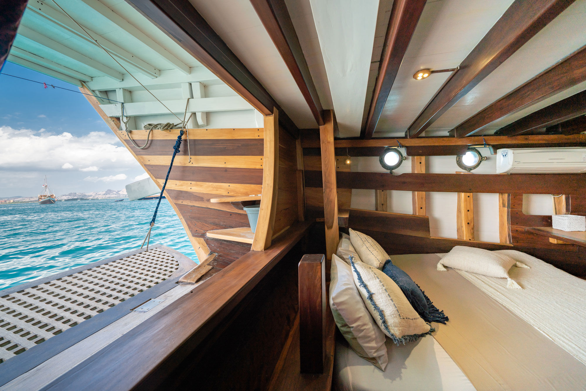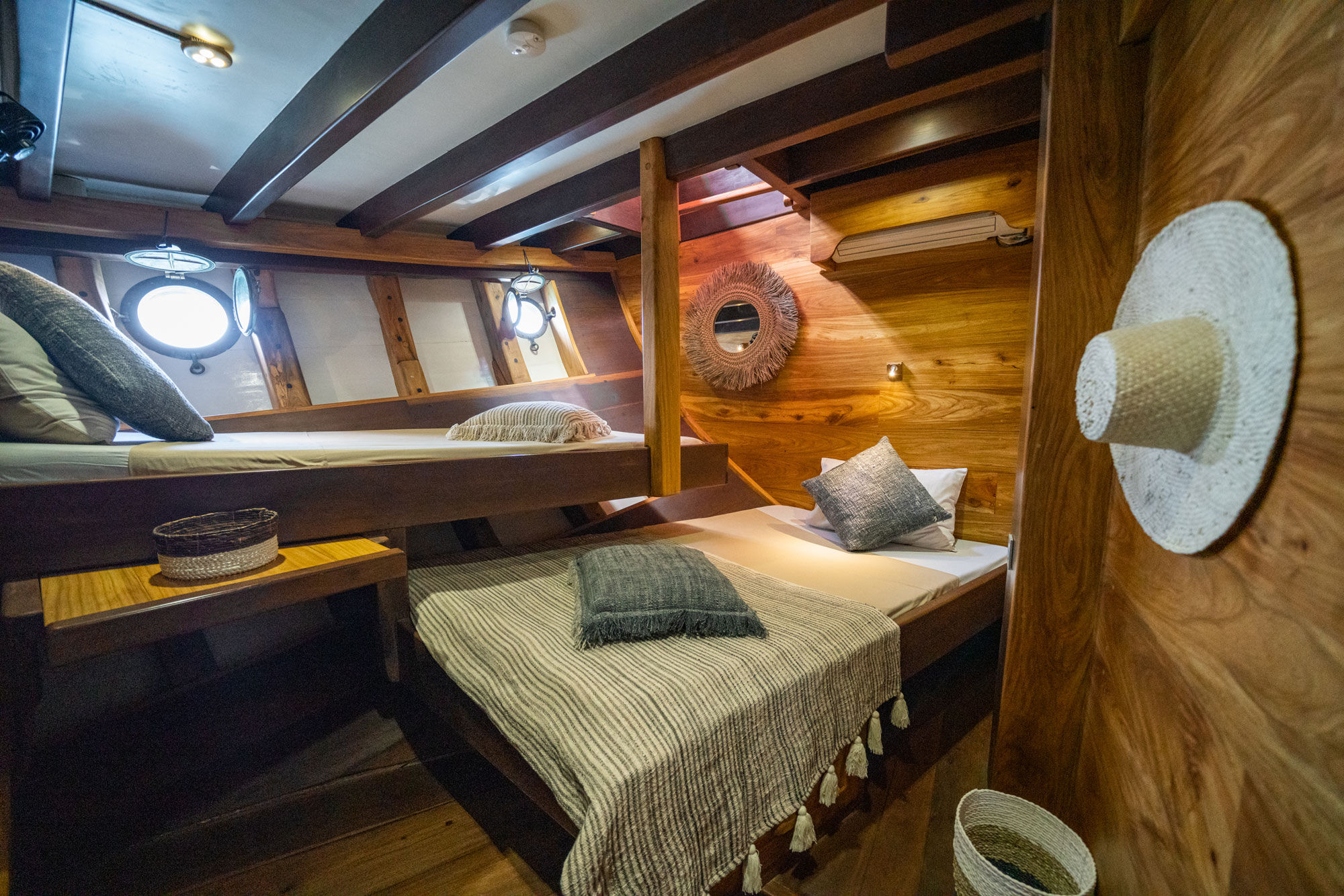 加入Jakaré phinisi潜水船,在印度尼西亚体验一次真正的潜水船宿之旅。Jakaré结合了传统印尼设计与现代西方舒适,是您完美的出门在外的家。船上提供五种不同类型的舱房,包括2间标准前舱,2间高级中央舱及1间位于船尾的大型尾舱。尾舱配有双人床,后方开放式设计,带有美丽的露台,可直接通向璀璨的绿松石色海水。每个舱房都配备独立控制的空调和私人套间浴室。