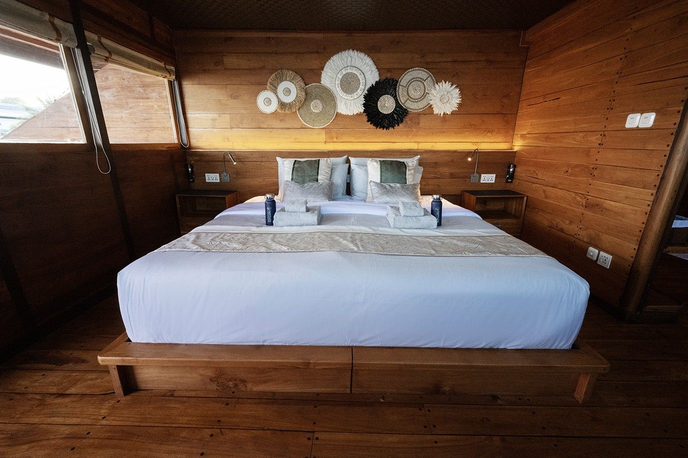 Neptune One是一艘豪华的38米/125英尺游船,可以容纳多达16名宾客,提供8间精美装饰的客舱,其中包括4间豪华套房、2间豪华海景客舱和2间带阳台的豪华海景客舱。所有客舱都配备空调,并设有带热水淋浴的独立浴室。在主甲板上,您可以找到宽敞的客厅和餐厅,同时还有宽敞的潜水甲板。在日光甲板上,您可以一边晒太阳或观星,一边欣赏海洋和天空的壮丽景色。两艘潜水小艇随主船一起运行,随时准备带潜水员前往印度尼西亚最顶级的潜水点。