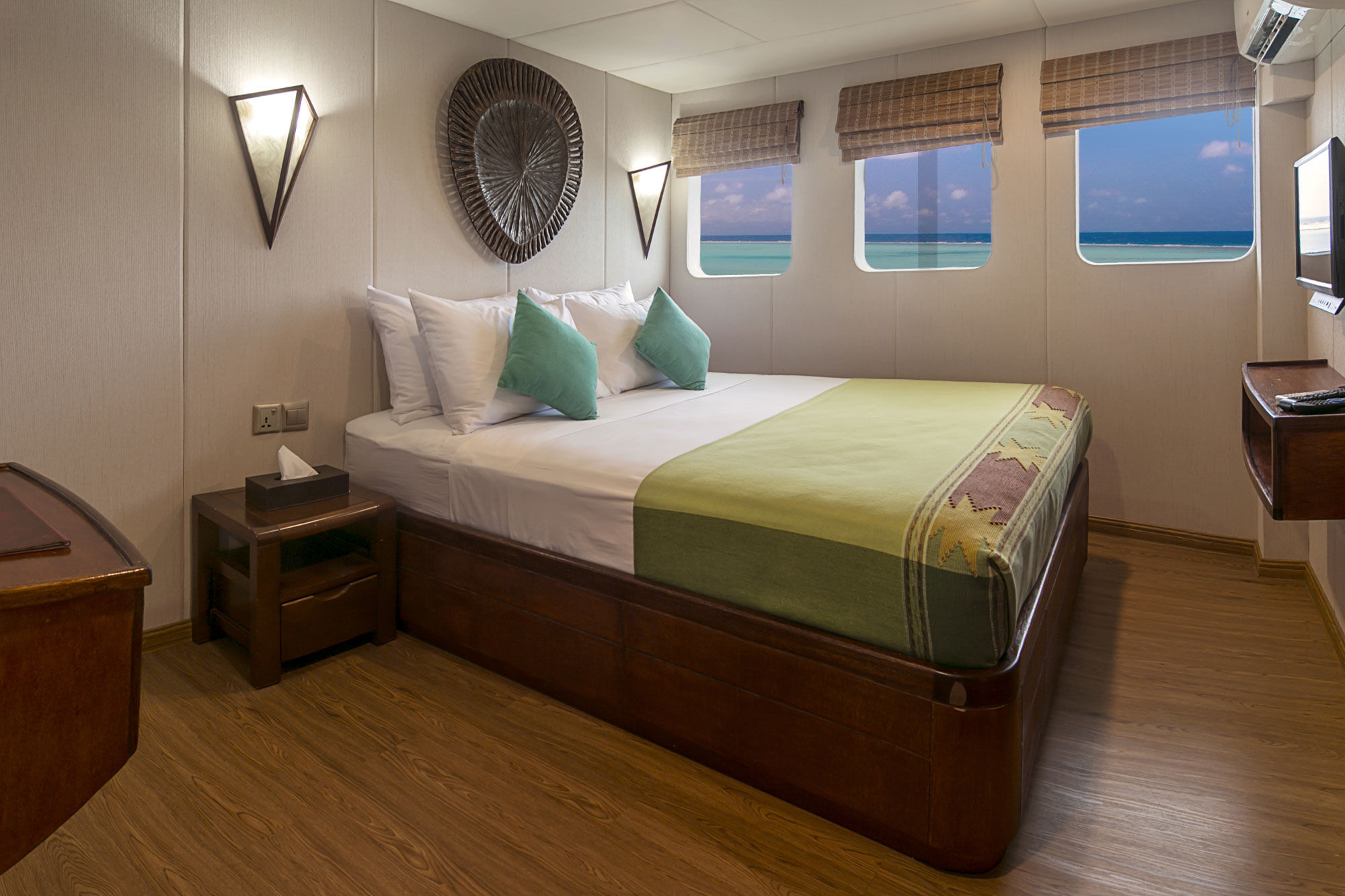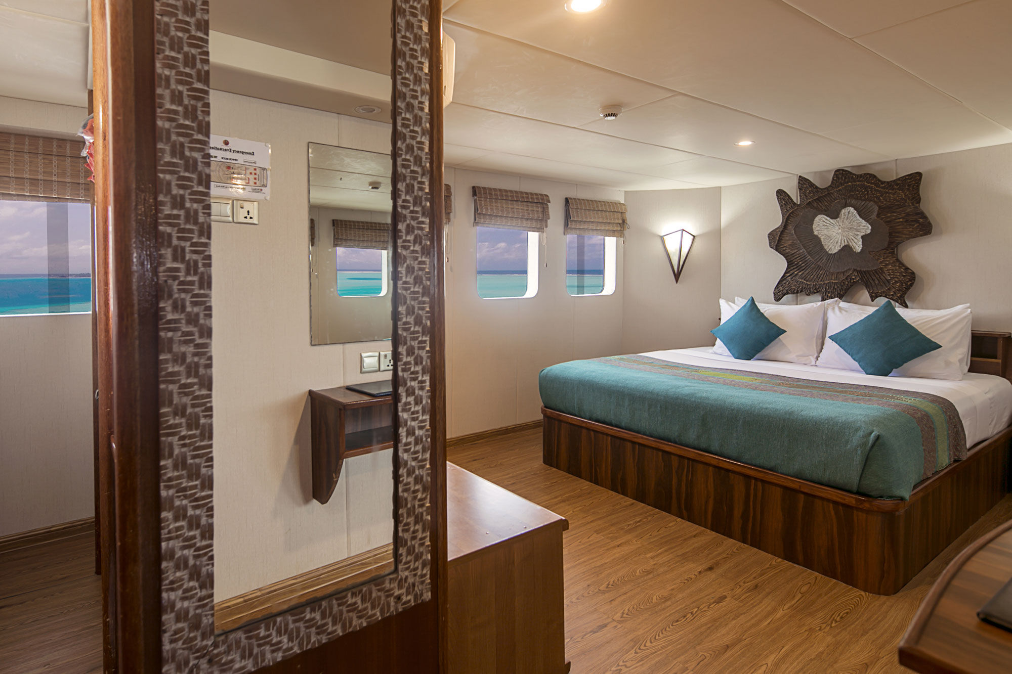 Carpe Diem潜水船以其卓越的服务和高质量著称。船上共有10个客舱,分布于三个甲板,各种标准的客舱可供选择,每个客舱都配有独立浴室和空调。在下层甲板上有6个标准客舱,其中4个有两张单人床,可以转换成双人床,另外2个各有一张单人床和一张半上下铺床。在主甲板上有两个配有大床的双人客舱,上层甲板有一个配有大床的豪华客舱和一个配有特大床的套房。所有主甲板和上层甲板的客舱都配备智能电视,并可欣赏到壮丽的海景。社交区分布在三个甲板上,包括一个室内沙龙、户外露台和用餐区,以及配有舒适躺椅的日光甲板。