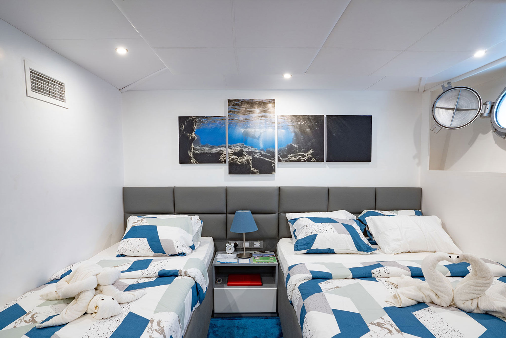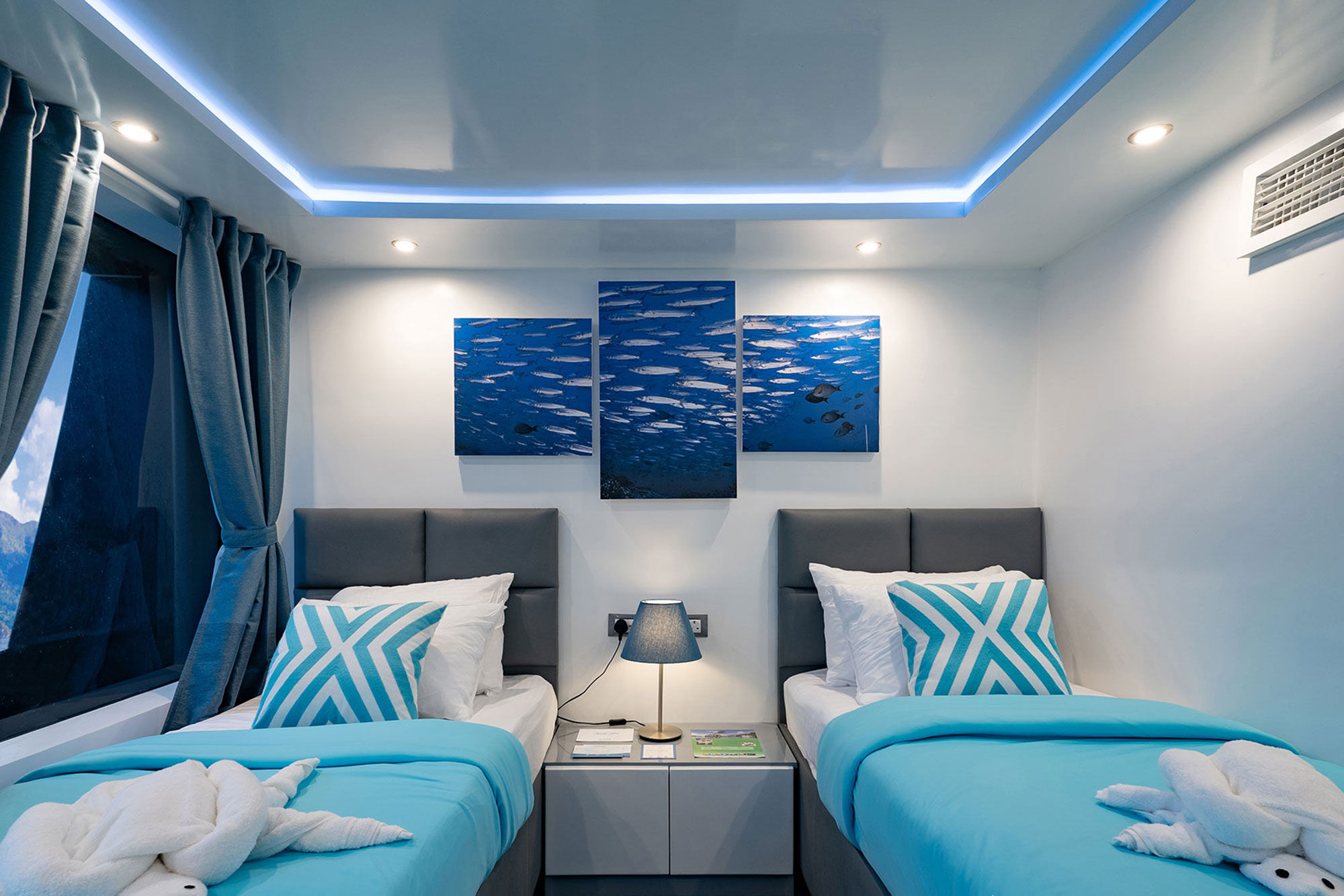 2021年加入Aggressor舰队的菲律宾Aggressor游艇专为舒适和安全而建造。她拥有明亮、现代和时尚的设计,为您的菲律宾船宿潜水之旅提供了一个完美的家外之家。船上共有12间双人或双床舱房,分布于两个甲板上,提供不同标准以适应所有预算,包括Deluxe Lower、Deluxe Main和Balcony suite。每间舱房均设有私人浴室、独立控制空调、电视显示器附带媒体播放器和吹风机。上层甲板上设有宽敞的室内休息室,配有舒适的沙发、一台平板电视和一个酒吧,并通往室外露台,非常适合在一天结束时享用鸡尾酒。用餐区位于主甲板,设有大型全景窗,是享用美式菜肴、本地美食和烧烤的地方。包含免费饮料及有限选择的本地啤酒和葡萄酒。