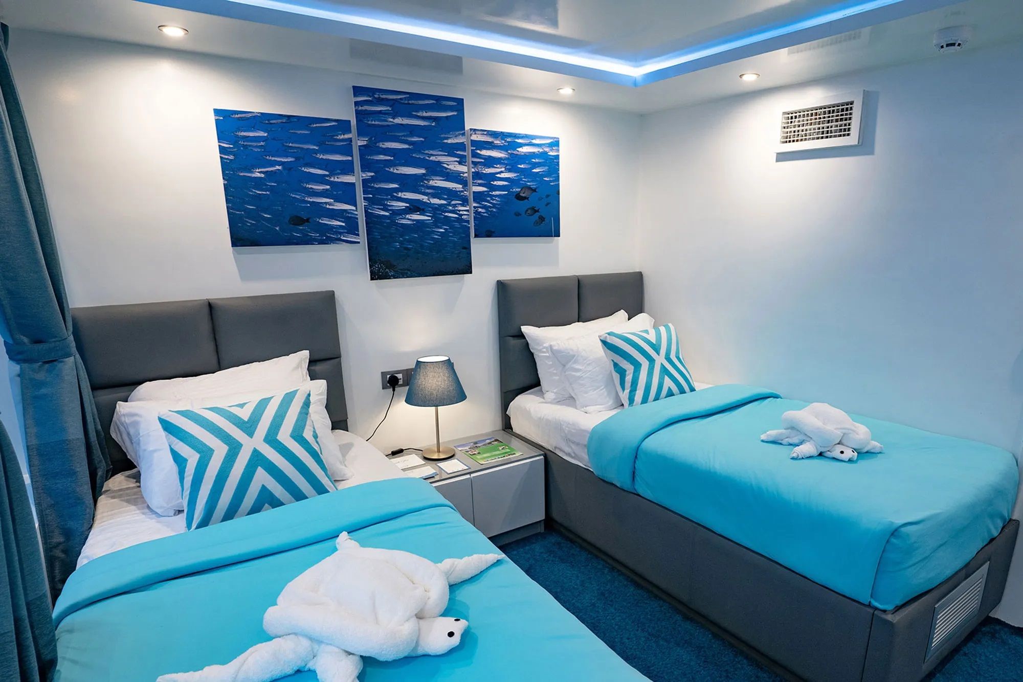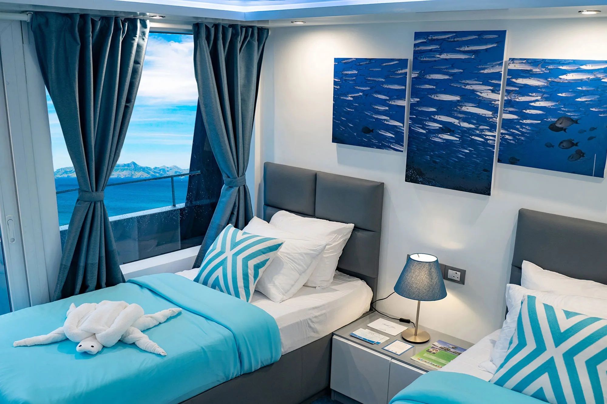 2021年加入Aggressor舰队的菲律宾Aggressor游艇专为舒适和安全而建造。她拥有明亮、现代和时尚的设计,为您的菲律宾船宿潜水之旅提供了一个完美的家外之家。船上共有12间双人或双床舱房,分布于两个甲板上,提供不同标准以适应所有预算,包括Deluxe Lower、Deluxe Main和Balcony suite。每间舱房均设有私人浴室、独立控制空调、电视显示器附带媒体播放器和吹风机。上层甲板上设有宽敞的室内休息室,配有舒适的沙发、一台平板电视和一个酒吧,并通往室外露台,非常适合在一天结束时享用鸡尾酒。用餐区位于主甲板,设有大型全景窗,是享用美式菜肴、本地美食和烧烤的地方。包含免费饮料及有限选择的本地啤酒和葡萄酒。