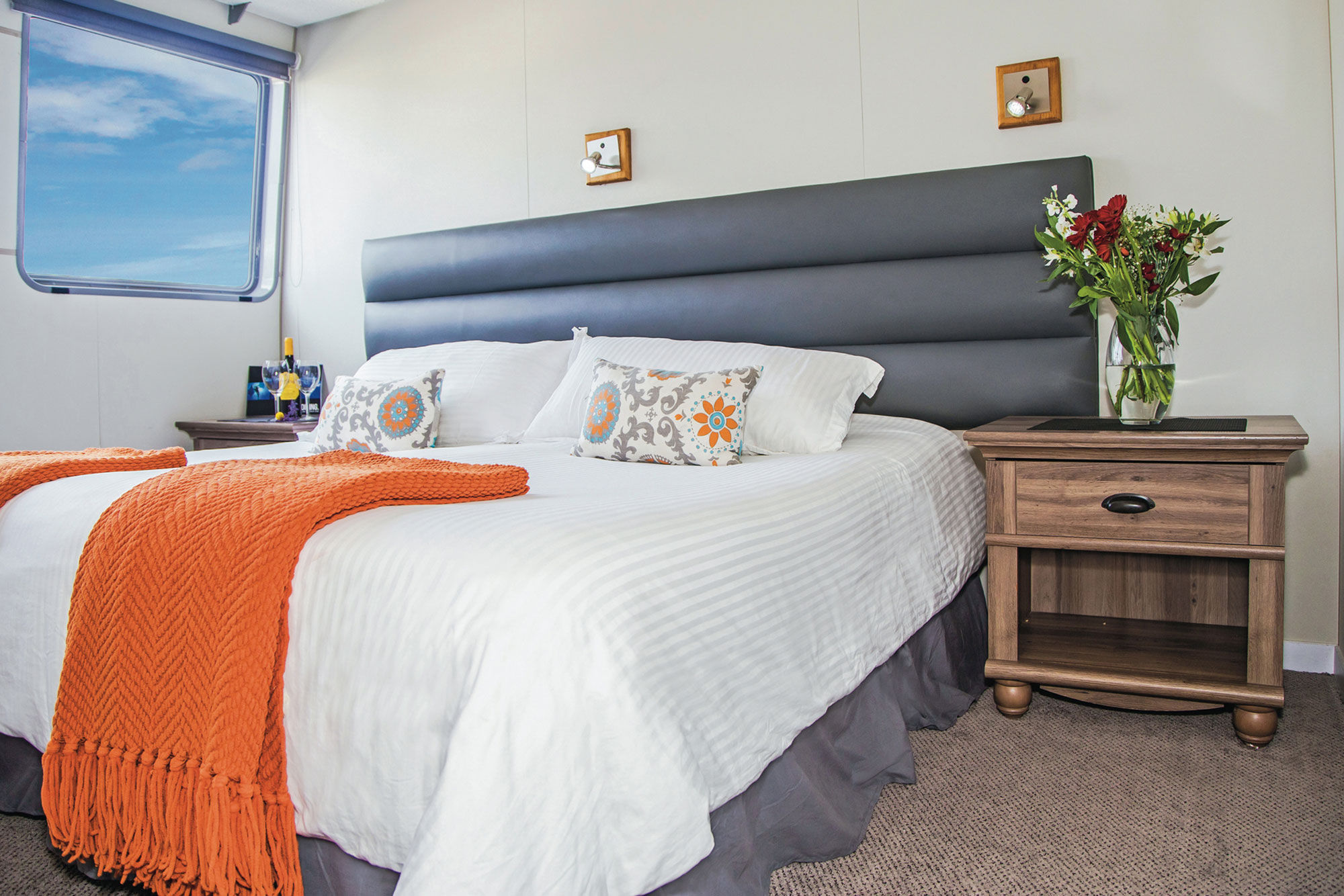 主甲板上设有一个大型的休息室和餐饮区域,提供融合墨西哥和北美西海岸风味的美食。可提前满足所有饮食要求,包括素食、纯素食、无麸质、食物过敏选项和近犹太洁食的需求。早餐、午餐和小吃为自助餐形式提供,晚餐则是板式自助或家庭风格。船上有两个库存丰富的大型酒吧,包括单一麦芽威士忌、精酿啤酒和种类繁多的葡萄酒。宽阔的日光浴甲板为每个人提供充足的空间享受阳光,还设有一个热水浴池,可在潜水间隙或潜水后与饮品和小吃一同享用。