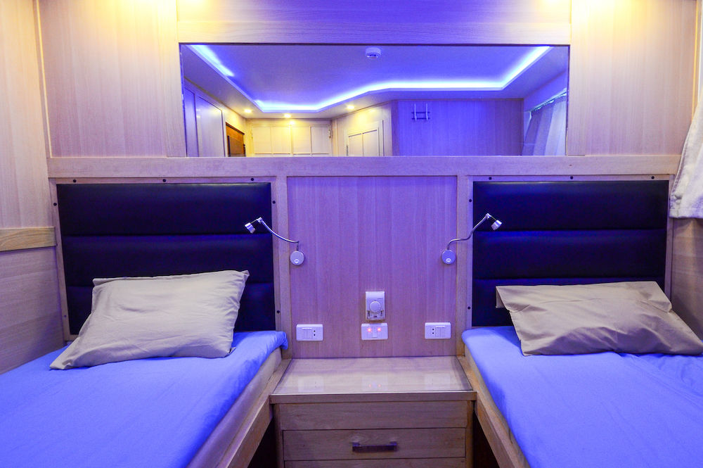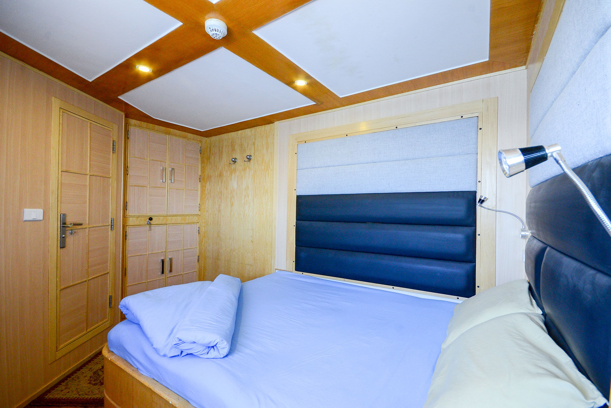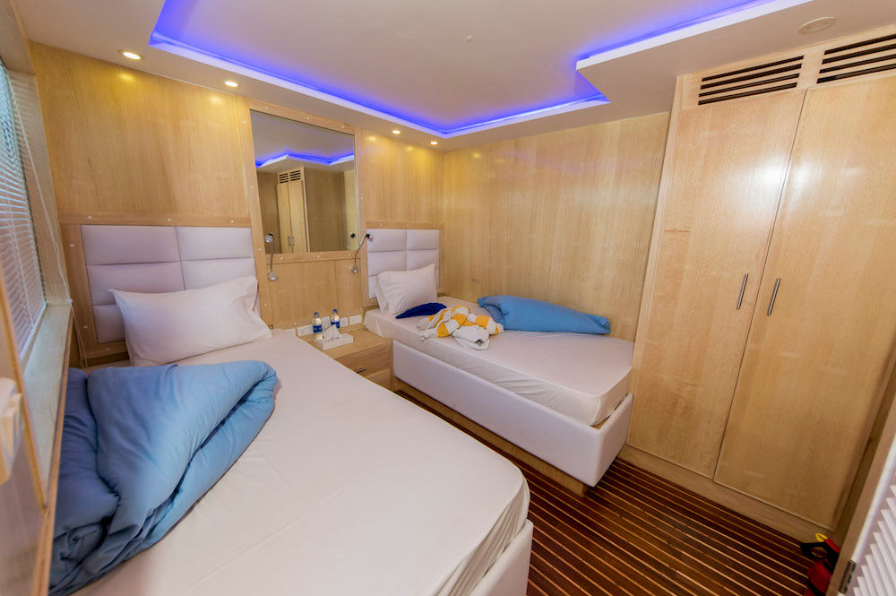 MY Blue Seas 是一艘以舒适和优雅著称的潜水船宿,提供红海最优质的潜水行程。船体宽敞,可容纳24位客人在12间客舱中,提供不同类别的选择以满足不同的预算和需求。在下层甲板,有7间标准客舱,配有双床和舷窗,还有一间带双人床的主客舱。上层甲板有4间海景客舱,提供双人床或双床选择。所有客舱都设有独立浴室、可独立控制的空调、阅读灯和储物空间。主甲板设有室内沙龙和餐厅,宽大的窗户营造出明亮现代的感觉,并提供令人惊叹的海景。船上设有提供豆袋的户外休息区,供客人放松和休憩,还有两个部分遮阳的大型日光甲板配有躺椅。