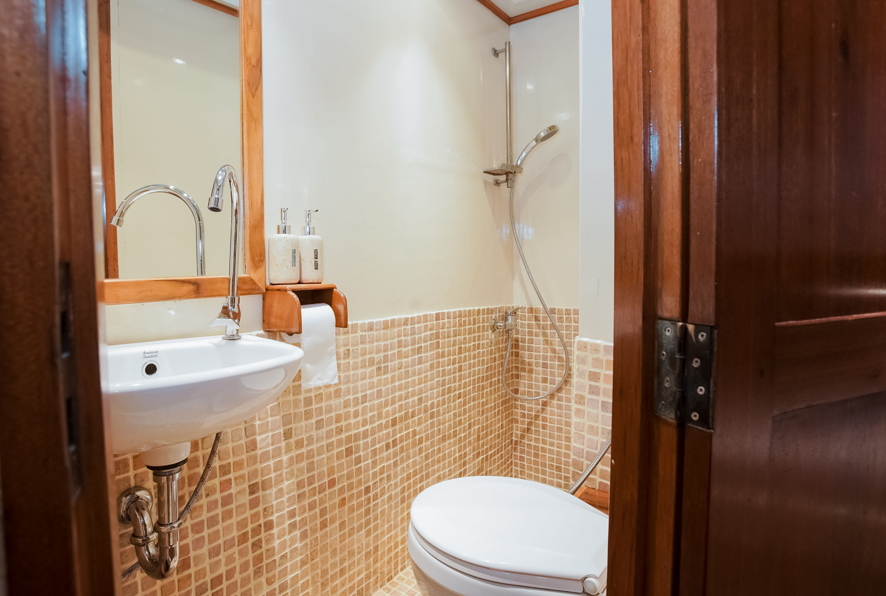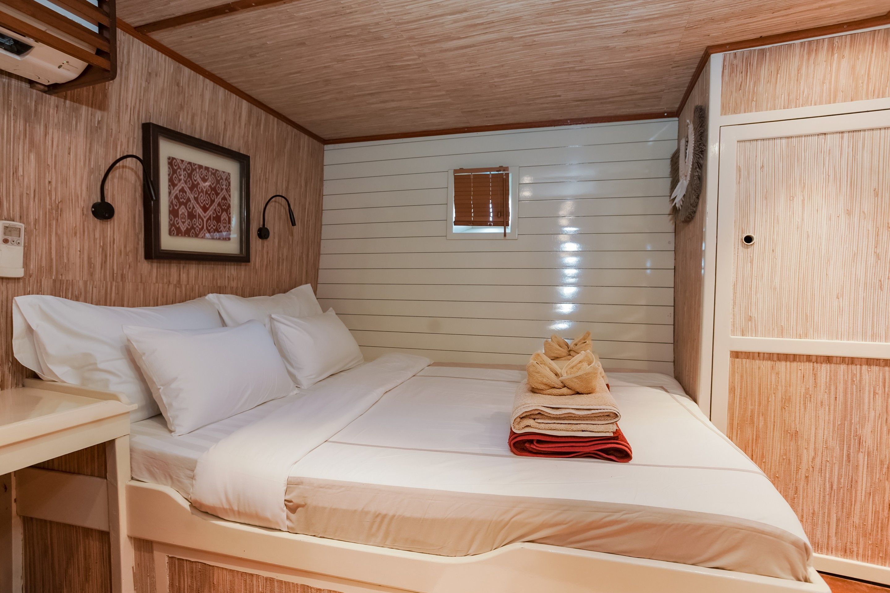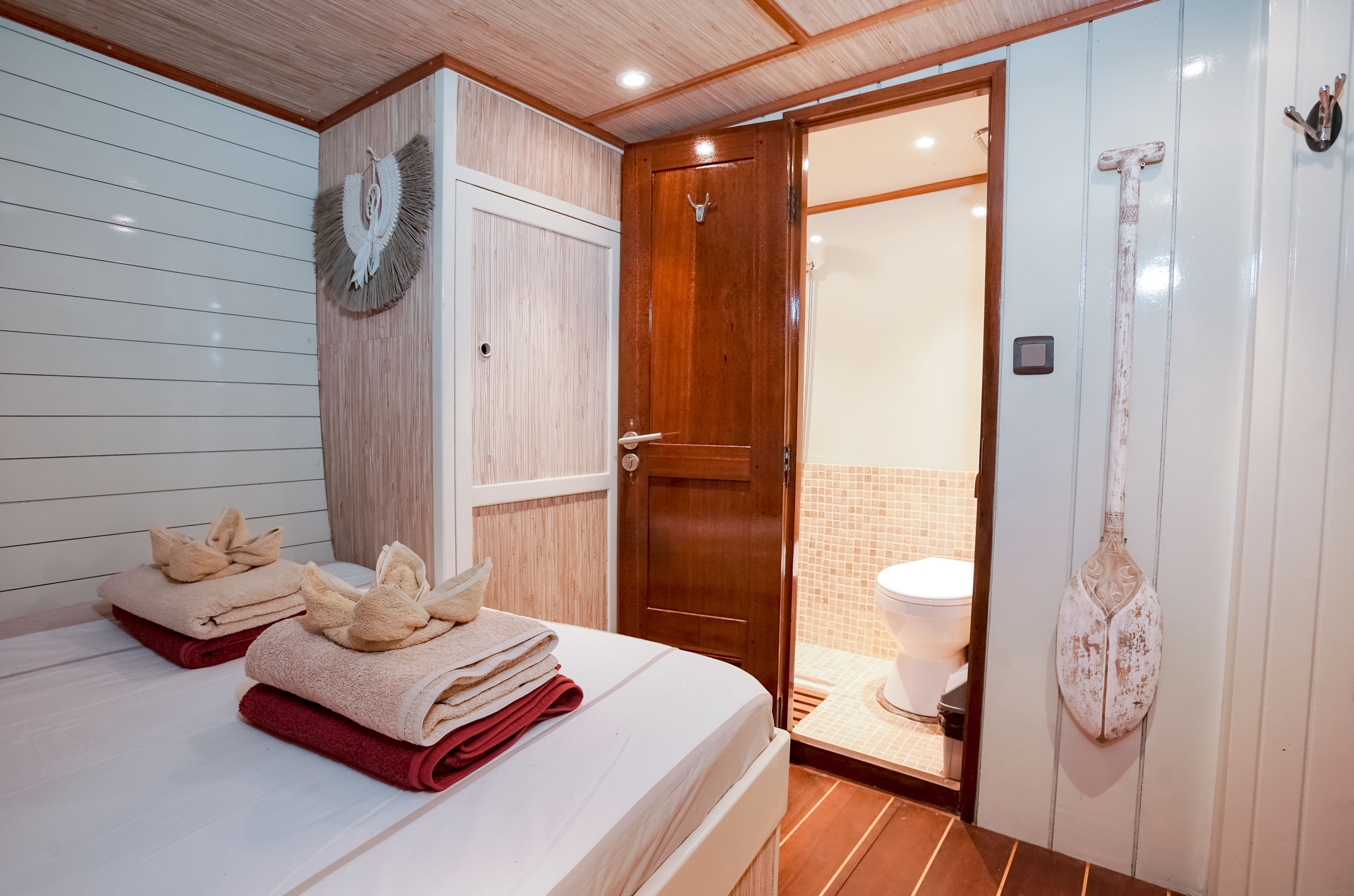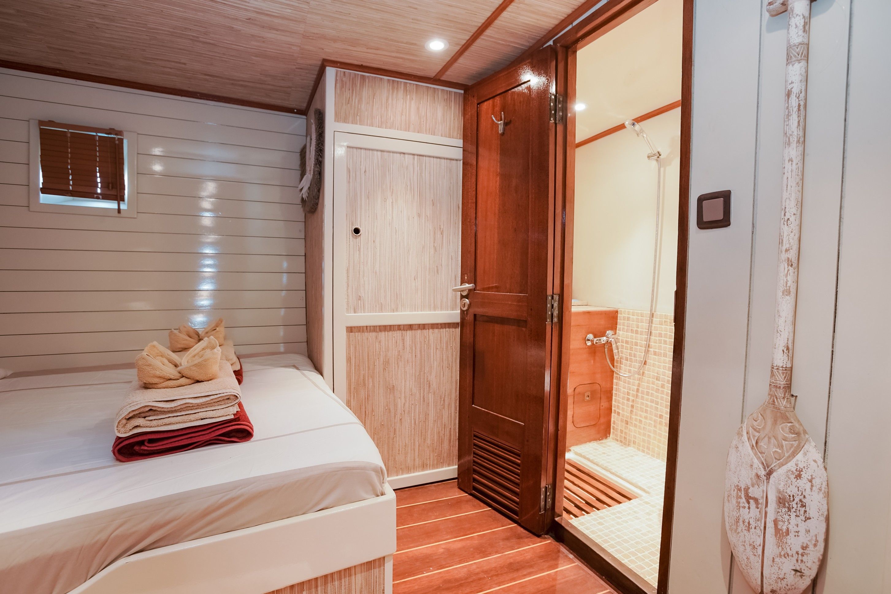 在水面上,Emperor Raja Laut潜水船是一艘传统的印尼phinisi,采用热带硬木建造,在印尼水域航行时散发出皇家气息。船上仅设有6间带独立浴室的客舱,可容纳12名宾客。有3间双床房和3间双人房,每间均配有迷你保险箱、储物空间、独立浴室和可独立控制的空调。社交区域包括全面空调的休息室,内有49英寸电视、图书馆、游戏、电影和迷你吧,全部位于与客舱同一层甲板。日光甲板位于上层甲板,配有日光和阴凉躺椅,还有一个餐桌,餐桌位于凉棚下,可提供露天用餐,同时欣赏迷人的印尼风光。