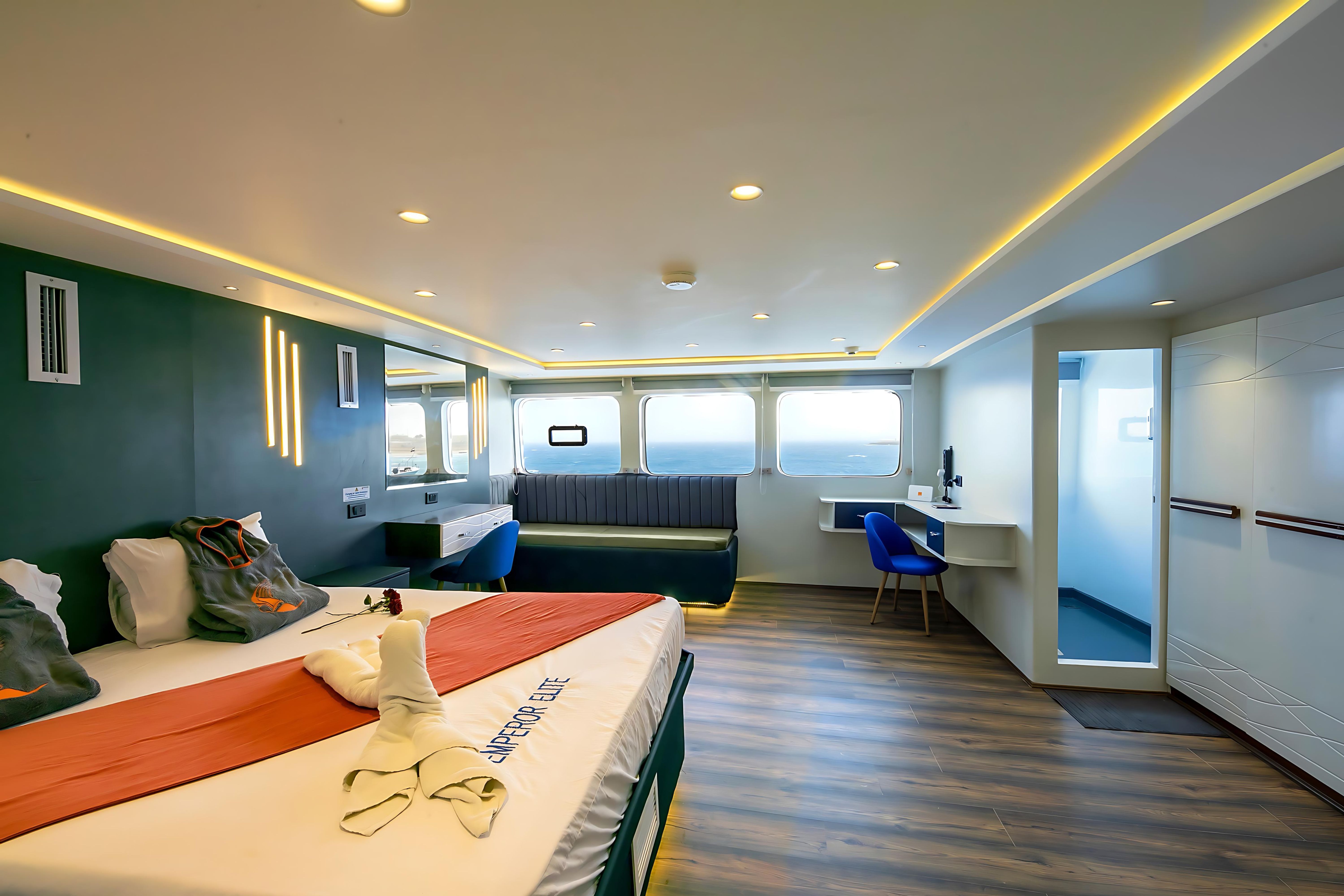 M/Y Emperor Elite 位于埃及,是一艘38米长的定制船宿潜水船,全年为红海的一些最佳潜水点提供服务。她可容纳多达26位客人,并有10名船员随时为客人提供满意的服务。Emperor Elite 强调舒适性,船上有13间客舱,配备独立空调和独立浴室。下层甲板有8间标准客舱,各层甲板有3间高级双人客舱,上层甲板设有1间高级行政套房和1间双人初级套房。Emperor Elite 设有两个空调沙龙,内有酒吧和TV/Video/DVD/CD,还有一个大型遮阳日光浴甲板供休闲娱乐。Emperor Elite 是 Emperor Fleet 的一部分,该舰队在埃及、马尔代夫和印度尼西亚运营船宿潜水船。