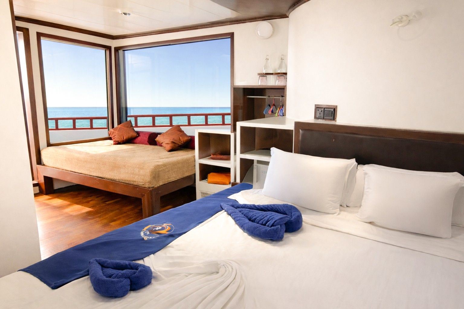 The Dune Theia offers a beautiful outdoor dining area with stunning ocean views, where your meals will be served either plated or buffet-style, and the ‘Sky Bar’ is the perfect place to relax and unwind after a day of diving. The air-conditioned salon also offers a TV and entertainment system for further relaxation.