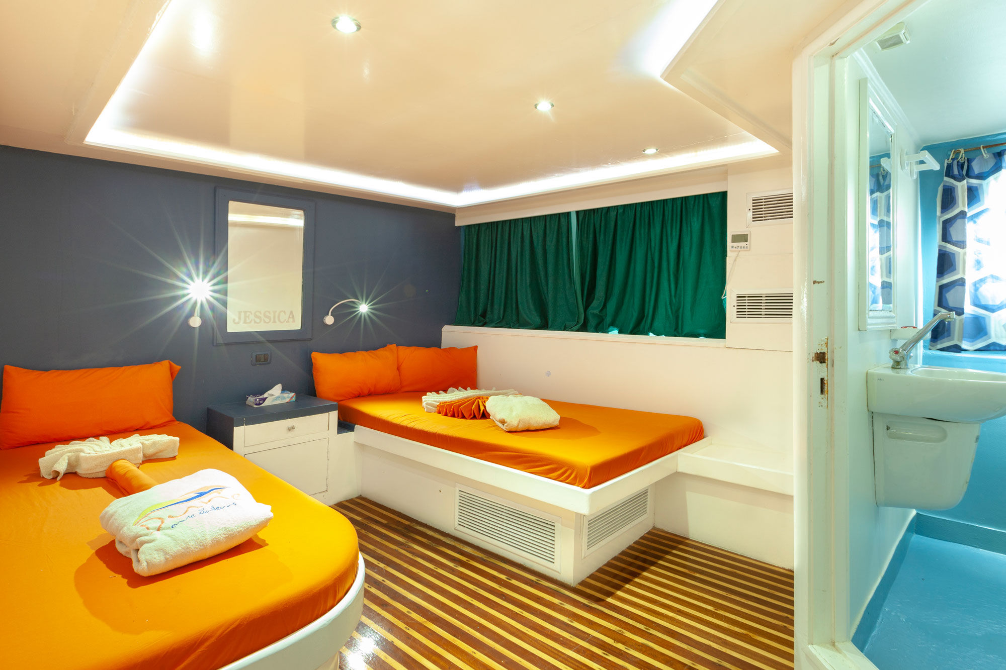 在甲板上,Titan可容纳30位客人,拥有15间带独立浴室的客舱。提供多种房型选择,包括下层甲板的8间双床房和1间大床房,主甲板有4间房,每间房配有一个小双人床和一张单人床,上层甲板则有2间双床房。每间客舱都配有独立的浴室和空调。餐厅位于主甲板,将以自助餐形式提供新鲜准备的地方和国际美食。社交区域包括一个室内休息室,通向上层甲板的户外休息室,并有楼梯通向大型日光浴甲板。