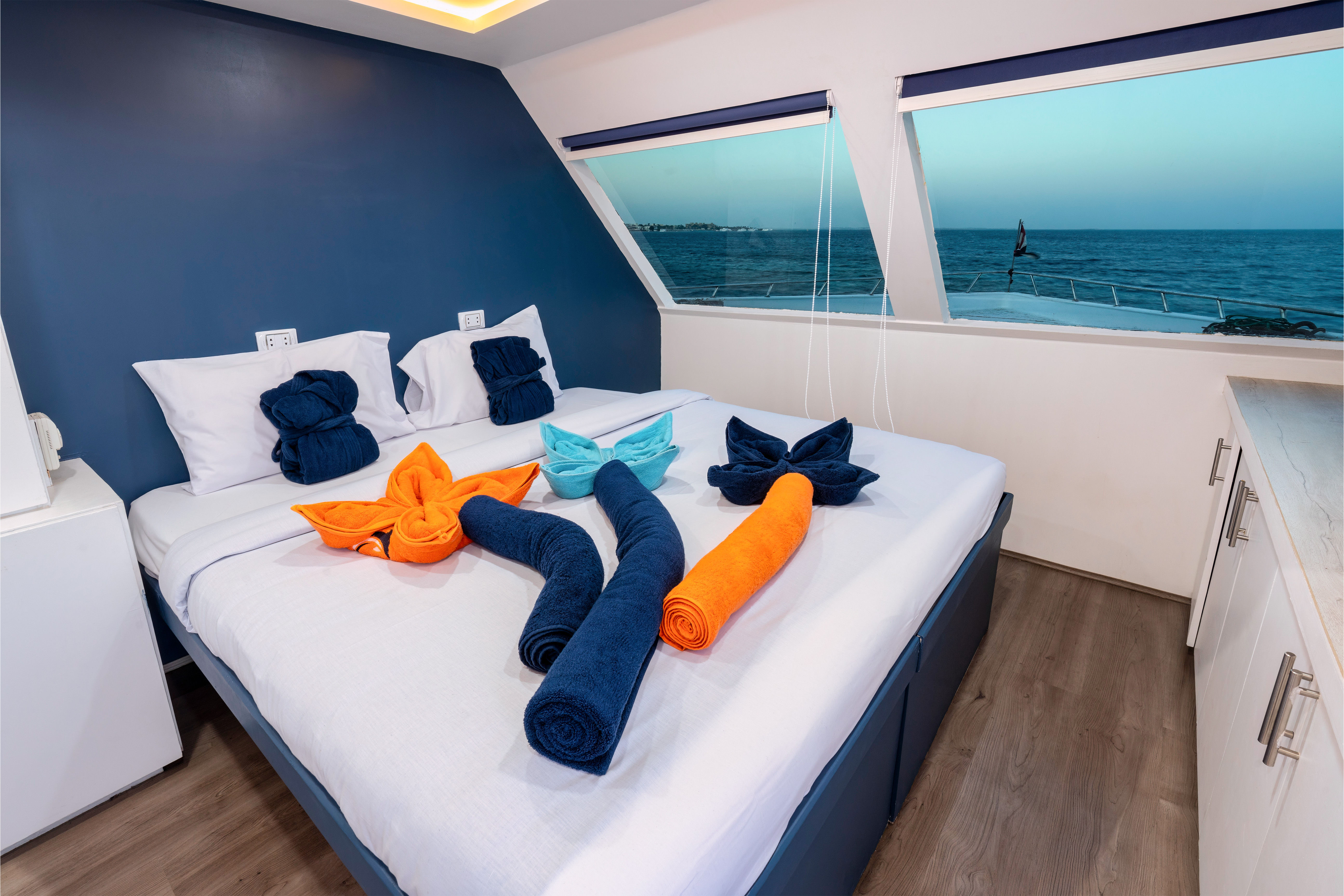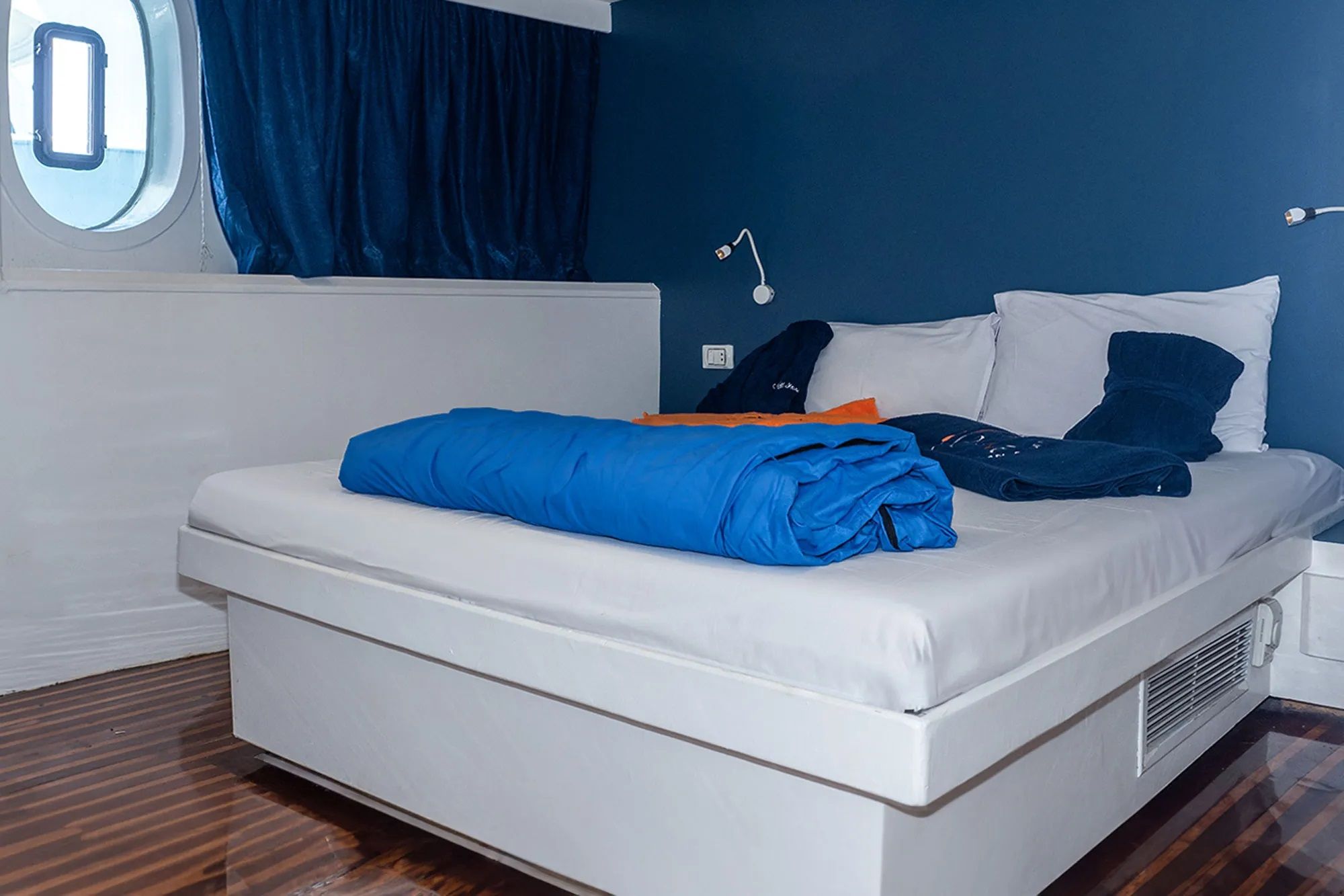The Dune Titan offers budget-friendly Red Sea dive safaris year-round. Topside, the Dune Titan caters to 30 guests in 15 en-suite cabins. A choice of rooms is available, including 8 twins and 1 queen on the lower deck, 4 cabins with a small double bed and one single bed each on the main deck, and 2 twin cabins on the upper deck. Each cabin has an en-suite bathroom and AC.