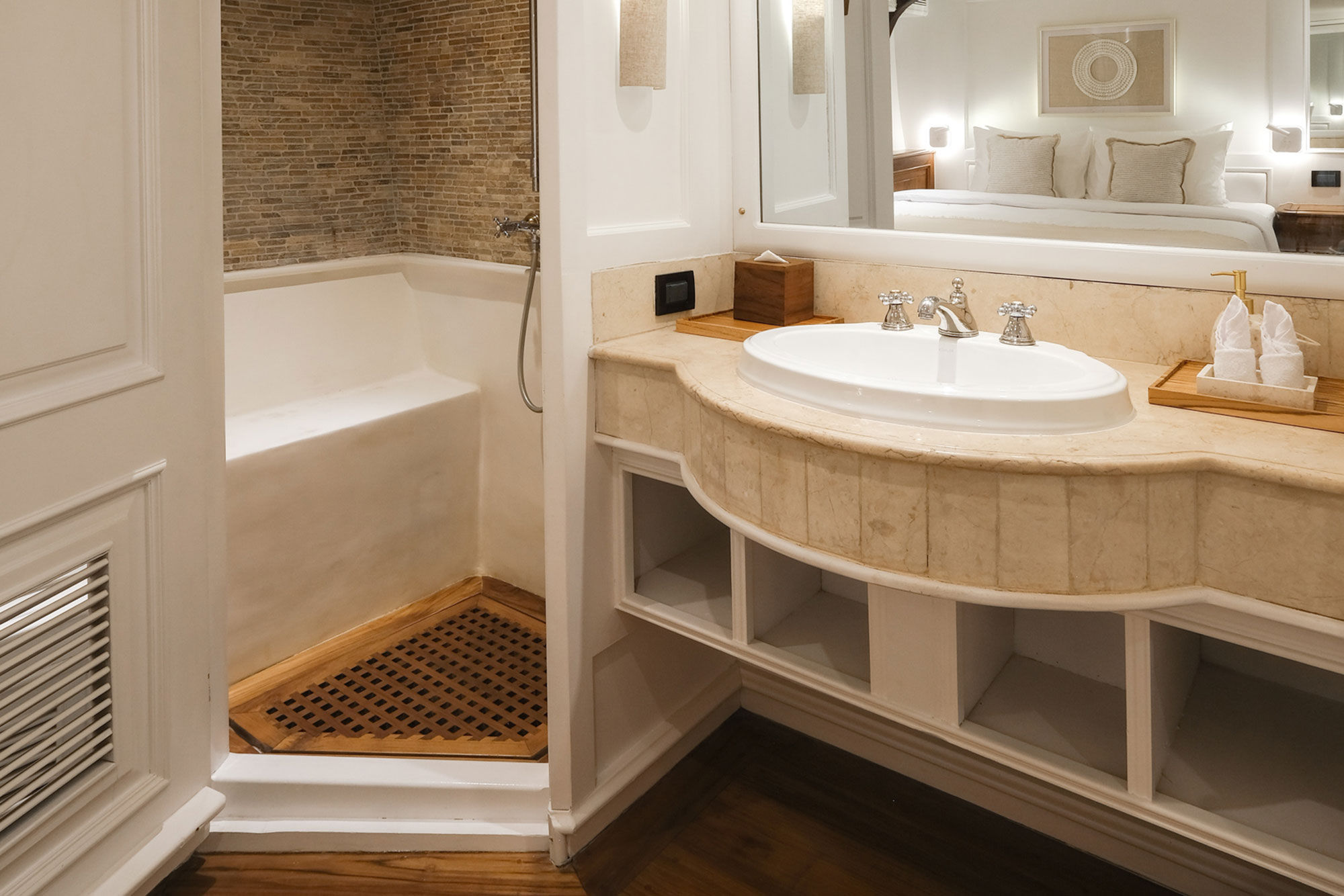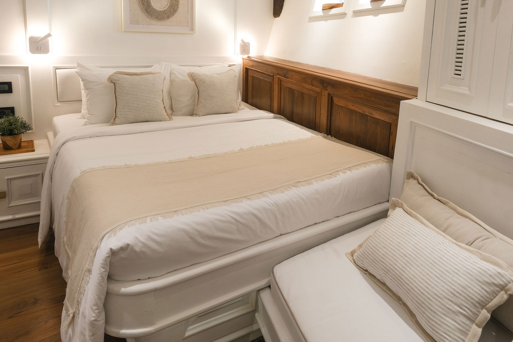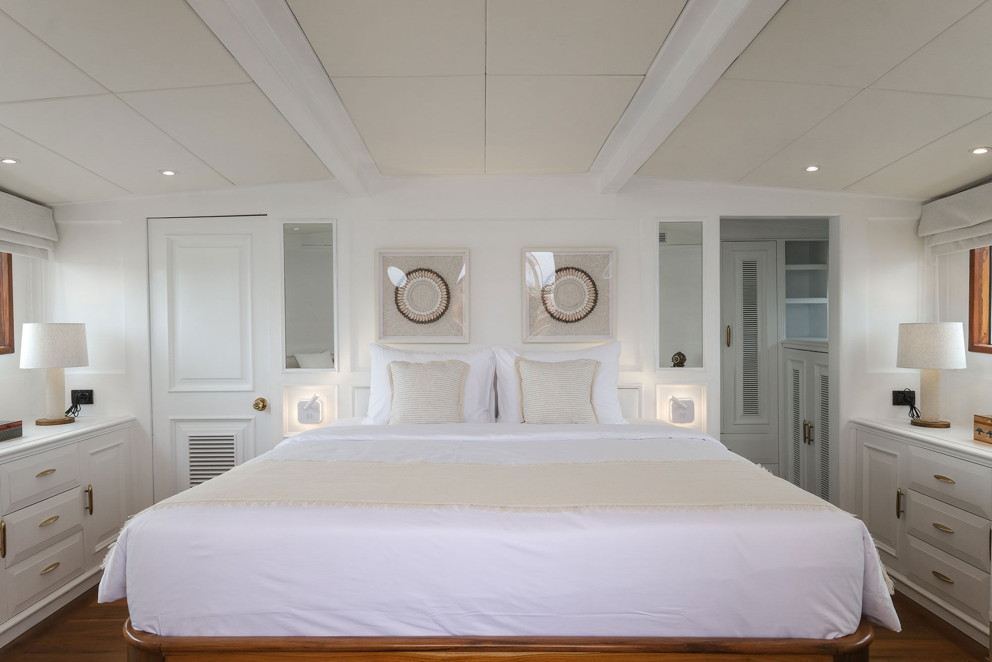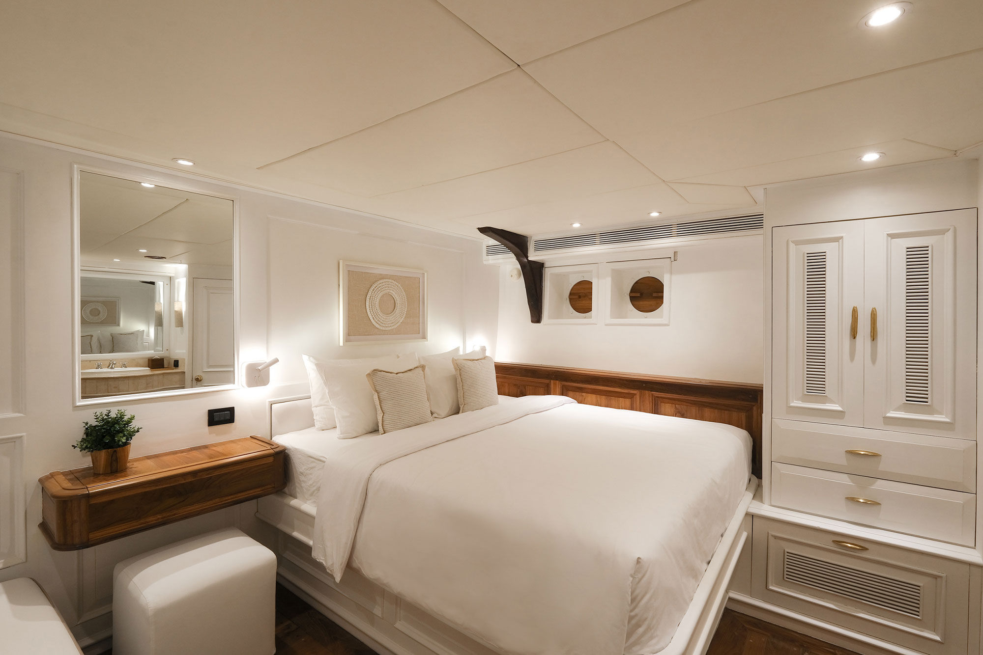 优雅的Mutiara Laut是一艘独特的46米长、9米宽的潜水船宿,设计灵感来自传统的英国双桅纵帆船,并结合了印度尼西亚“phinisi”的元素。这艘经典的46米木制游艇专为航行于辽阔群岛的远方而打造,Mutiara Laut经历了一次广泛的翻新和重塑,以焕然一新的姿态提升了经典的印度尼西亚航行体验。Mutiara Laut为客人呈现了一种轻松的奢华优雅,结合了自然的色调、玻璃和现代的印度尼西亚风格,同时注重空间、最佳舒适度和隐私保护。