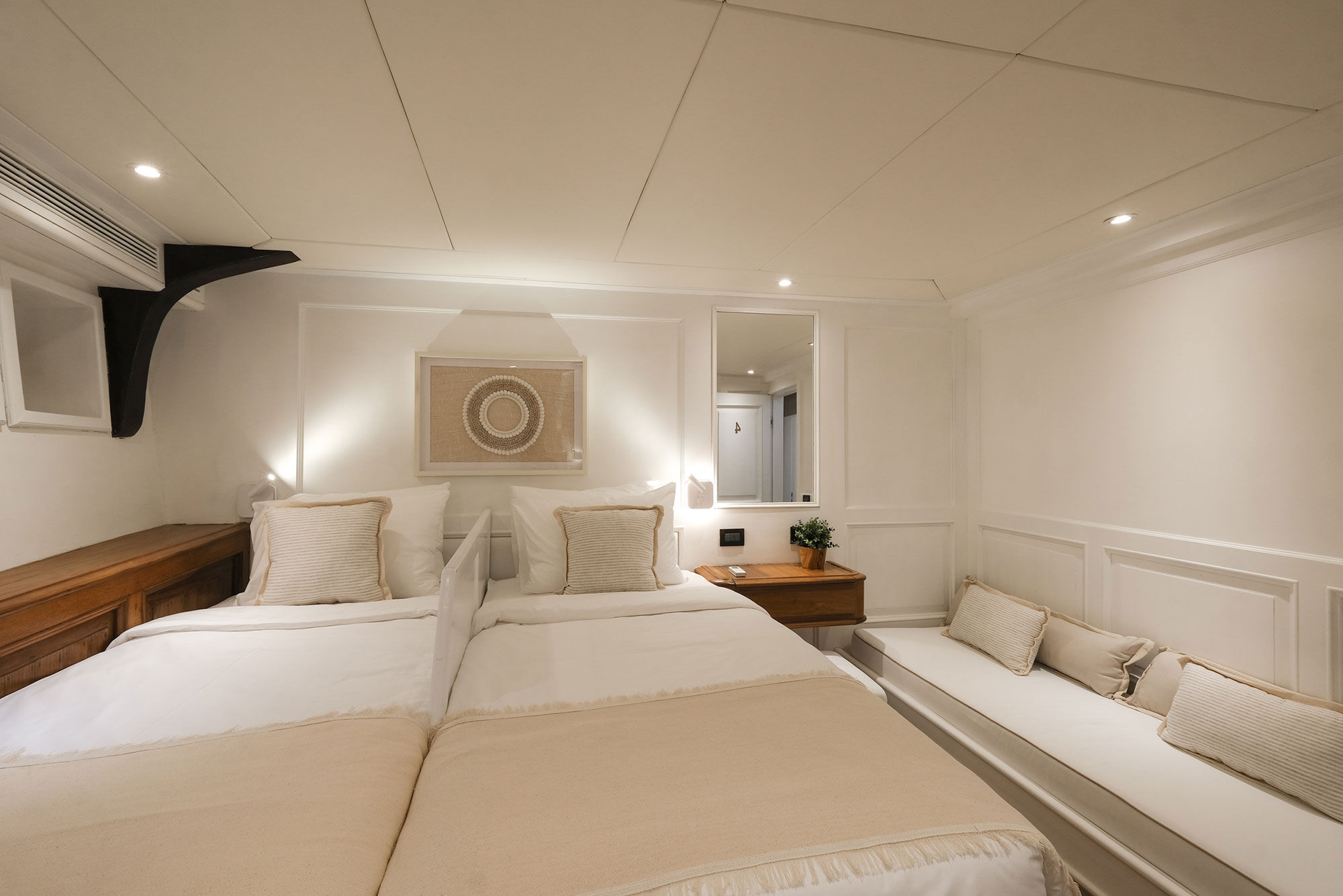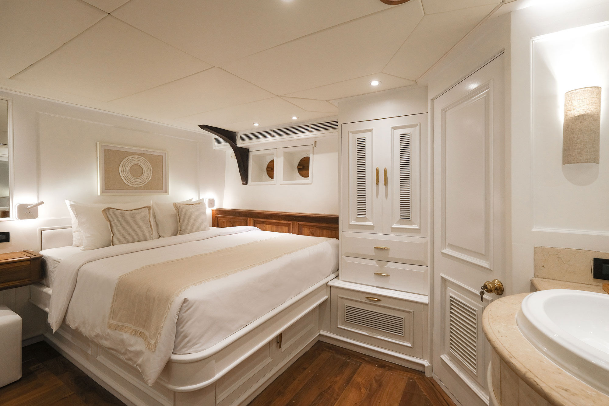 Mutiara Laut在印尼语中意为“海洋之珠”。这艘船精心打造的基础是经典的18世纪北大西洋双桅纵帆船,并结合了独特的印尼风格。看到它的两个桅杆全帆张开是一种壮观的景象,让人终身难忘。它的经典设计包括7间设施齐全的客舱,船内外广泛使用温暖的柚木,提供充足的室内/室外空间供客人放松和享受印度尼西亚的异国之美。