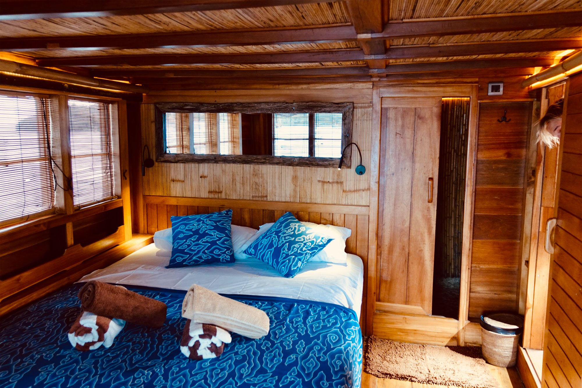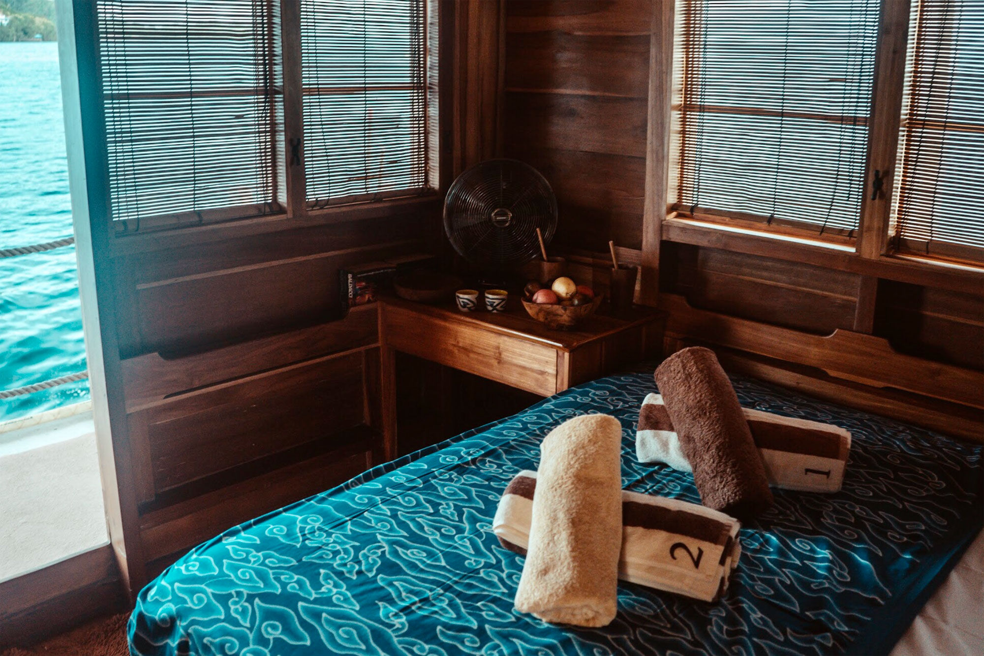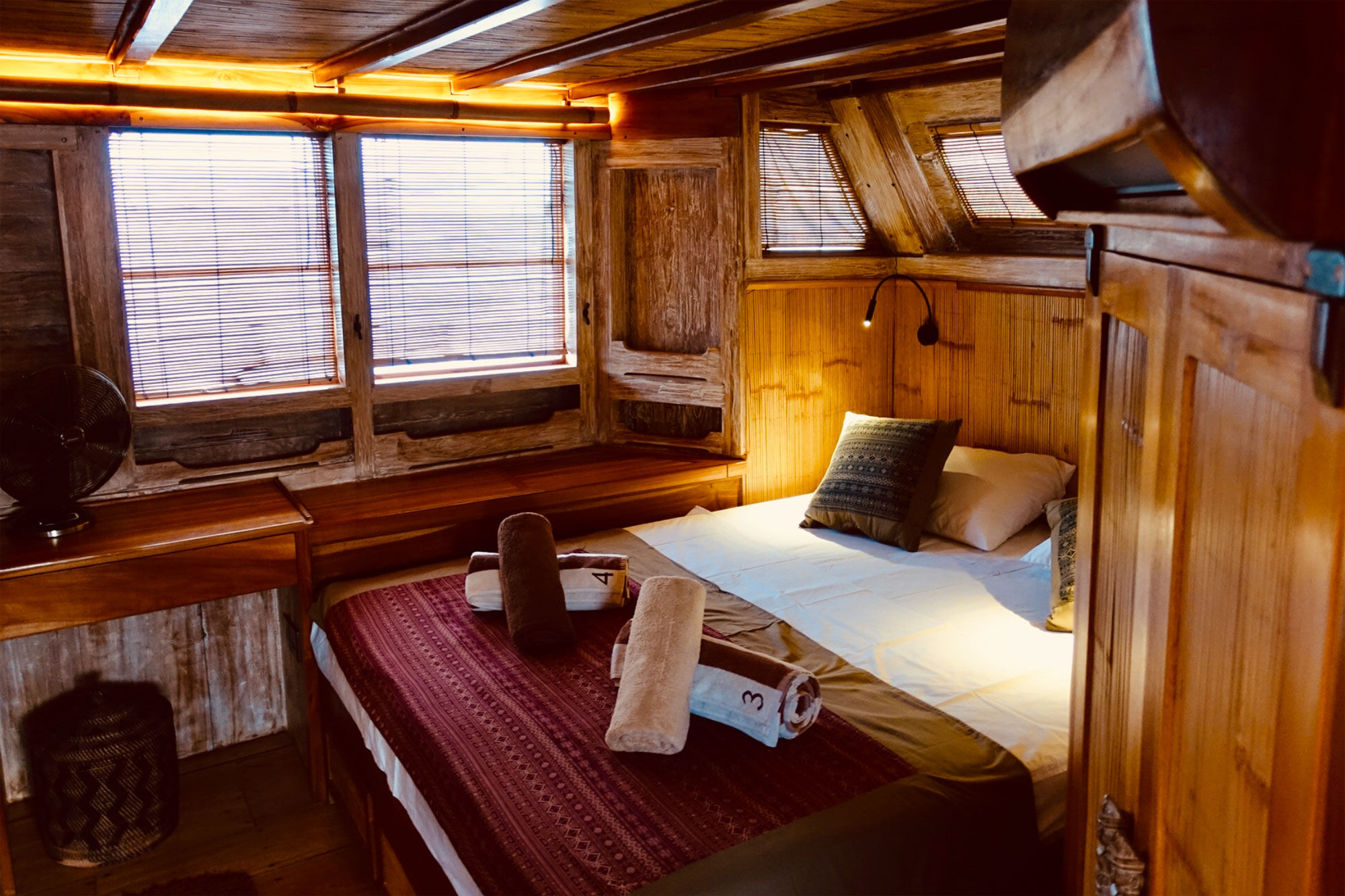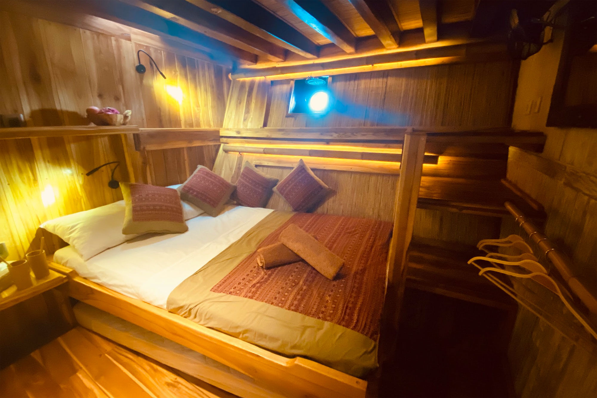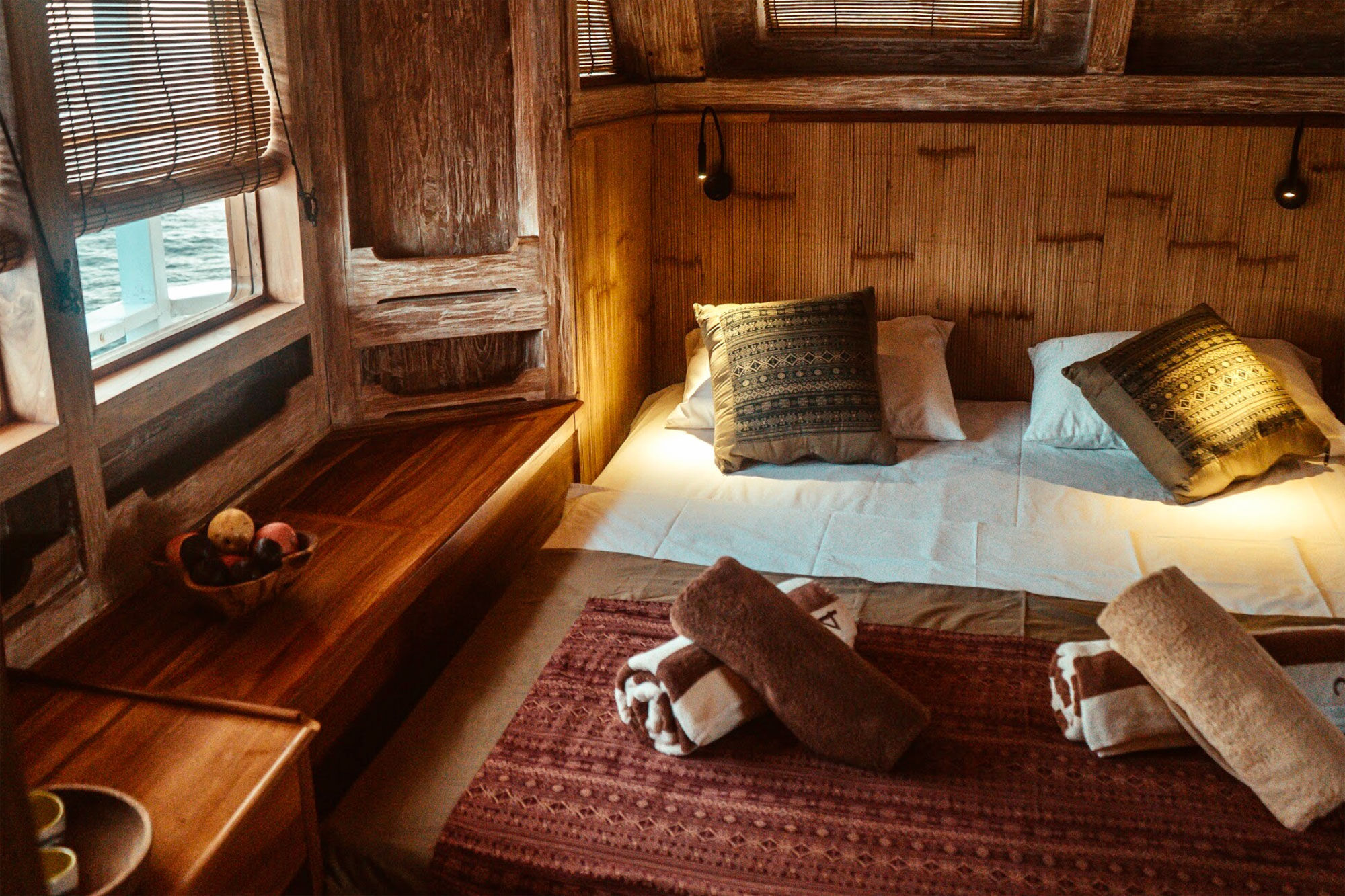 赤足奢华是Mikumba Dua(失落天堂租船公司)的主题,这是一艘经过精心翻新的印度尼西亚船宿潜水船,为传统的木制精品风格的phinisi增添了现代风格。Mikumba Dua在同级别船只中拥有最大的户外空间,横跨4层甲板,客人可以在星空下享用户外餐饮的同时,享受自己喜爱的饮品,或者参与日出/日落瑜伽,或只是躺在豆袋上读一本书。船的主要区域是美丽的室内沙龙,里面提供餐饮、电影院、图书馆、棋盘游戏,或者只是一个放松的空间。上层甲板有两个主卧舱,都带有私人浴室和私人阳台,底层甲板还有三个双人/双床舱,共享两个浴室。所有舱室都宽敞且独立设计,采用传统的本地材料和织物。