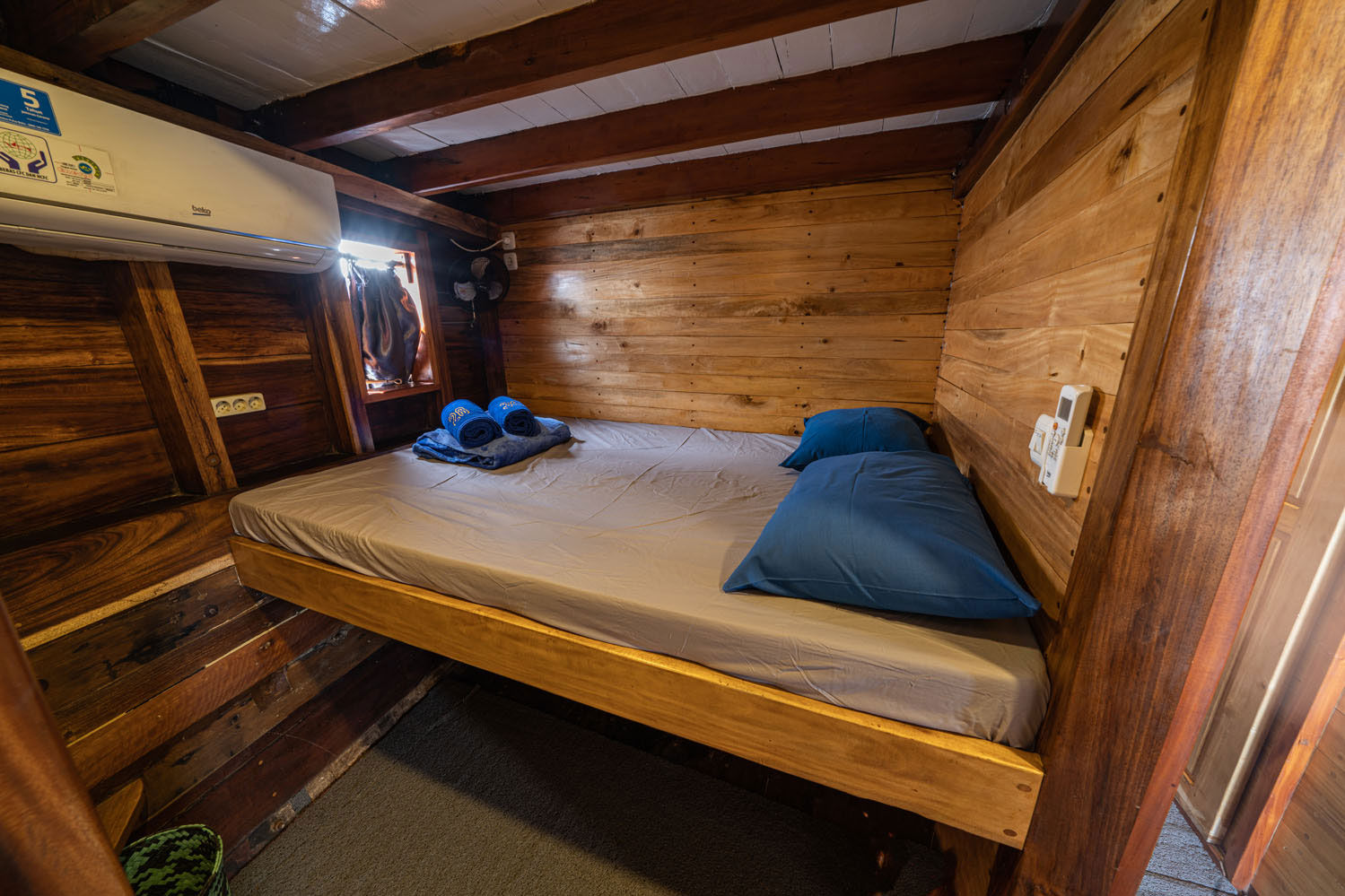 23米长的Jaya号可容纳14位客人,设有7间位于下层甲板的船舱。这里提供4间双床舱,配备2间共用浴室,2间带独立浴室的双人舱,以及1间带独立浴室的双人舱,所有舱室都设有空调、充电插座、新鲜毛巾和床上用品。双床舱为男女混住(性别中立)。上层甲板设有遮阳空间,供潜水间隙休息和欣赏拉贾安帕(Raja Ampat)美景,阳光甲板则配备有懒人沙发。