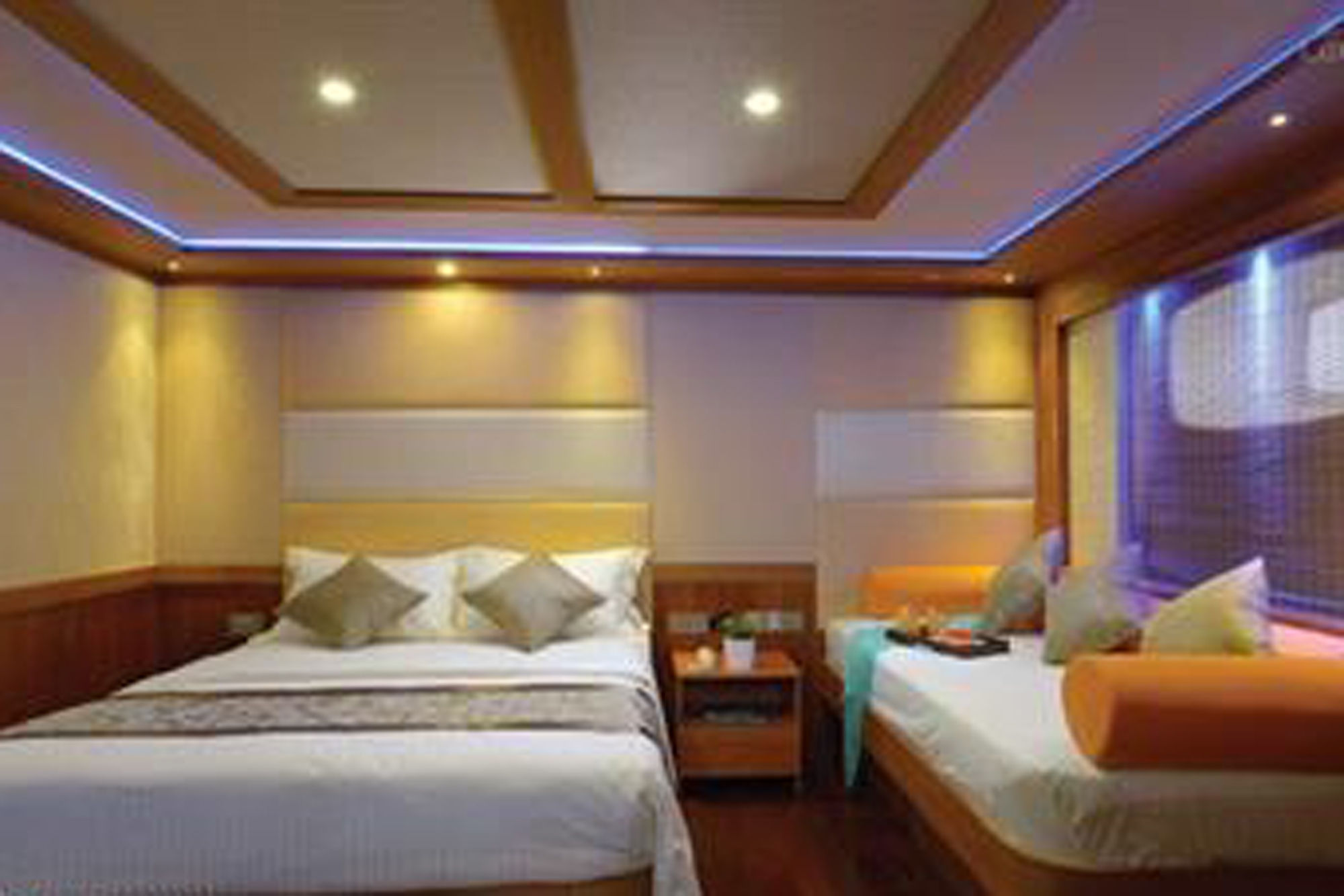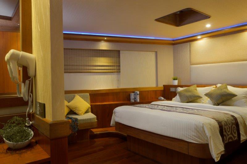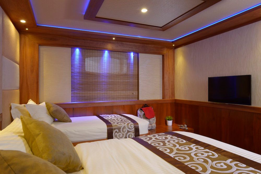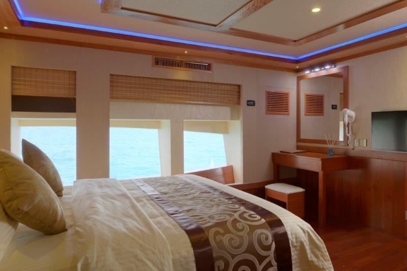 豪华的Blue Force One游艇全年在马尔代夫壮观的珊瑚礁上提供潜水船宿之旅。M/V Blue Force One专门为潜水爱好者设计,拥有10间现代化客舱,包括一间小型套房、主舱和豪华套房。每个客舱都设有独立控制的空调、独立浴室、吹风机、电视和保险箱,最多可容纳20位客人。社交区域包括两个室外按摩浴缸、三个日光甲板、上层甲板酒吧、一个配有大扶手椅和65英寸电视的客厅以及一个舞蹈房。客人还可以在空闲时间使用立桨冲浪板、冲浪板和皮划艇。