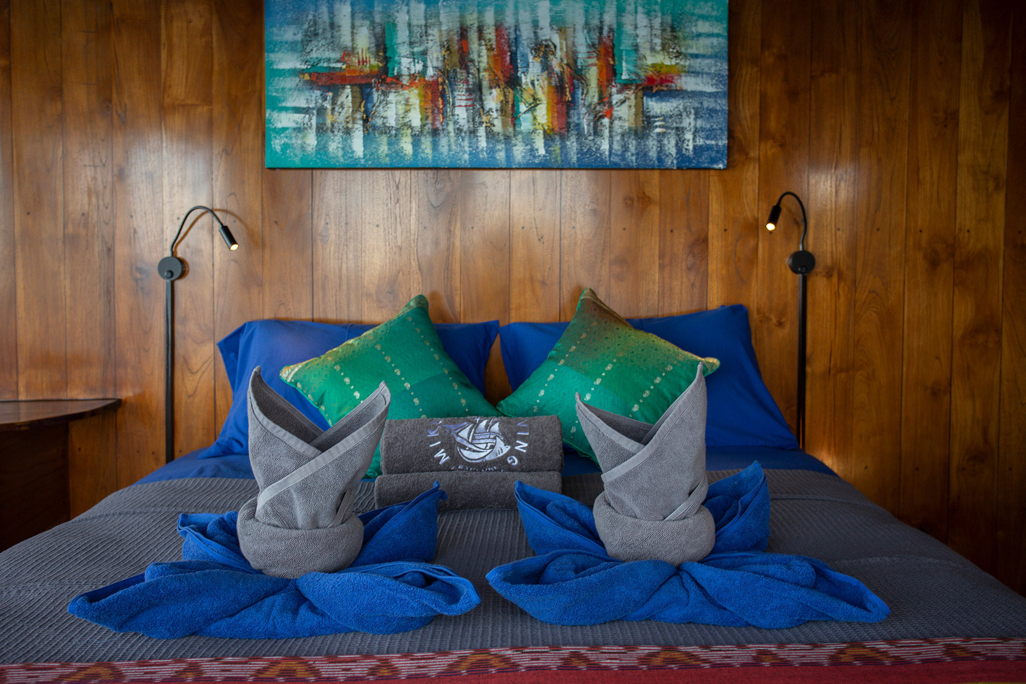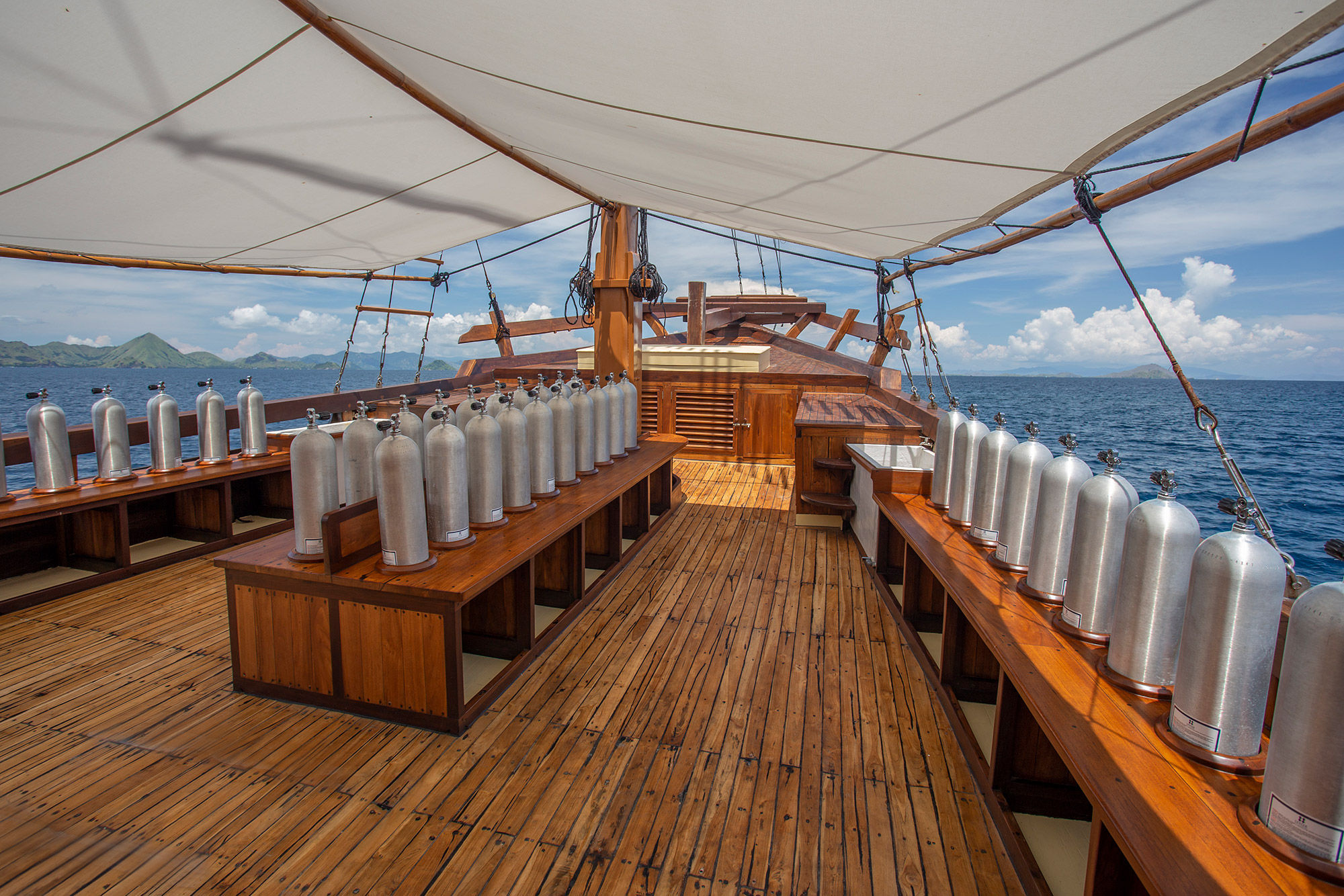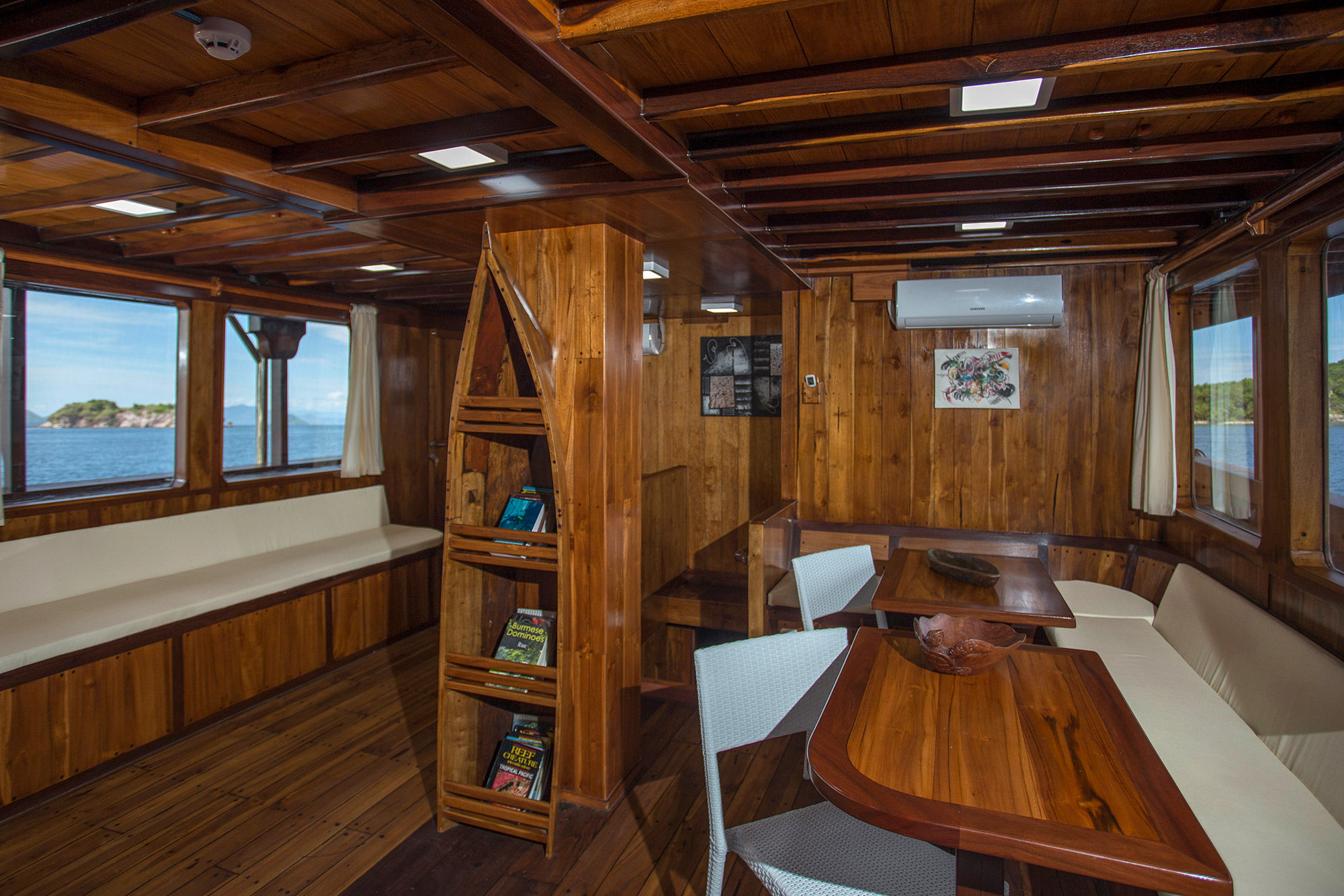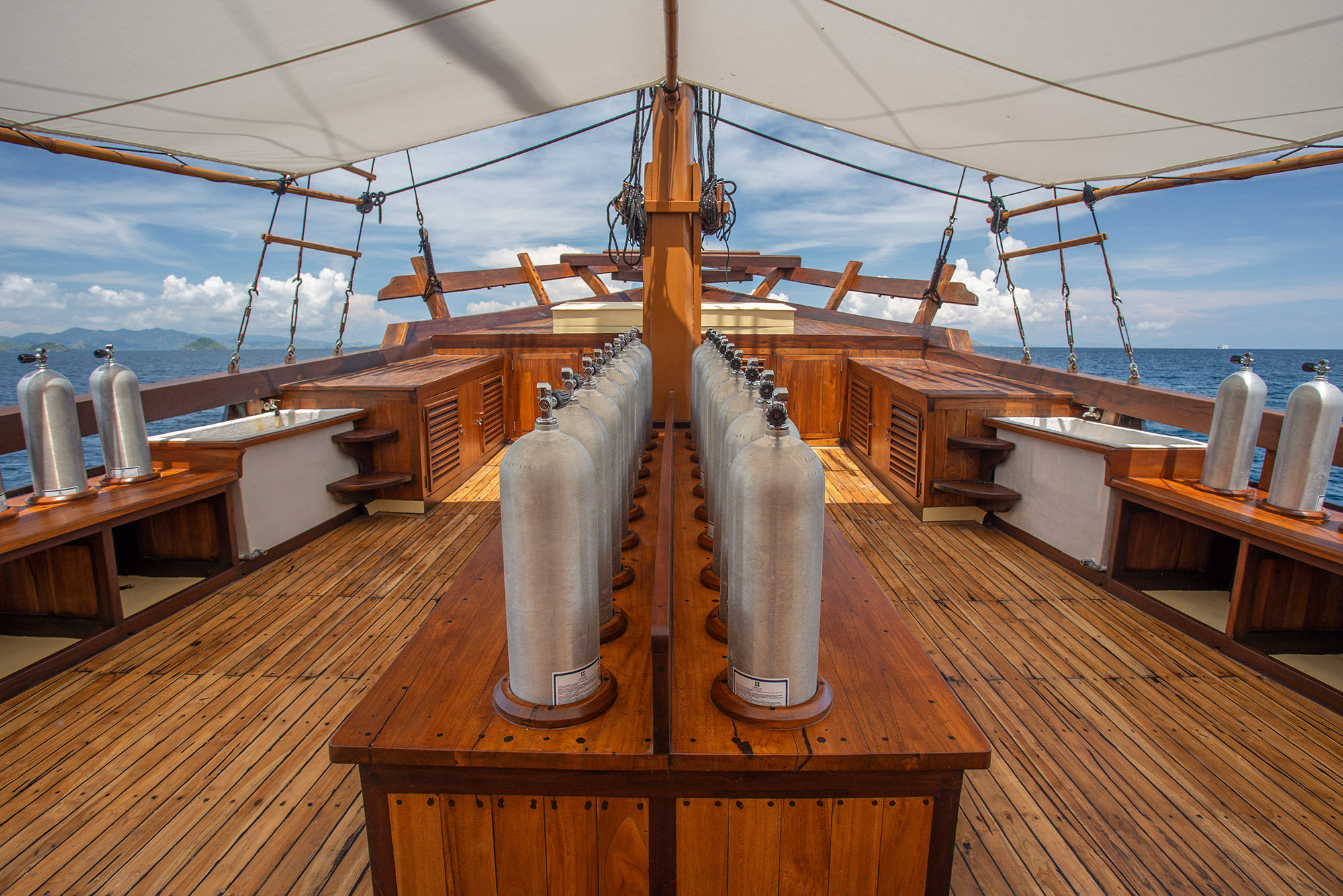 Built in Sulawesi, considered the “boatyard” of Indonesia, Jelajahi Laut is a beautiful phinisi boat constructed in 2021 with local teak wood and ironwood, ready to take you to the hottest dive spots in Indonesia. Jelajahi Laut means “Explore the Sea,” which she delivers with expeditions to Komodo, Raja Ampat, Banda Islands, Alor, and Ambon, to name a few. This traditional phinisi was designed by divers, optimizing the comforts for diver guests with a spacious equipment area and camera station, where you can gear up and prepare for your underwater adventure.