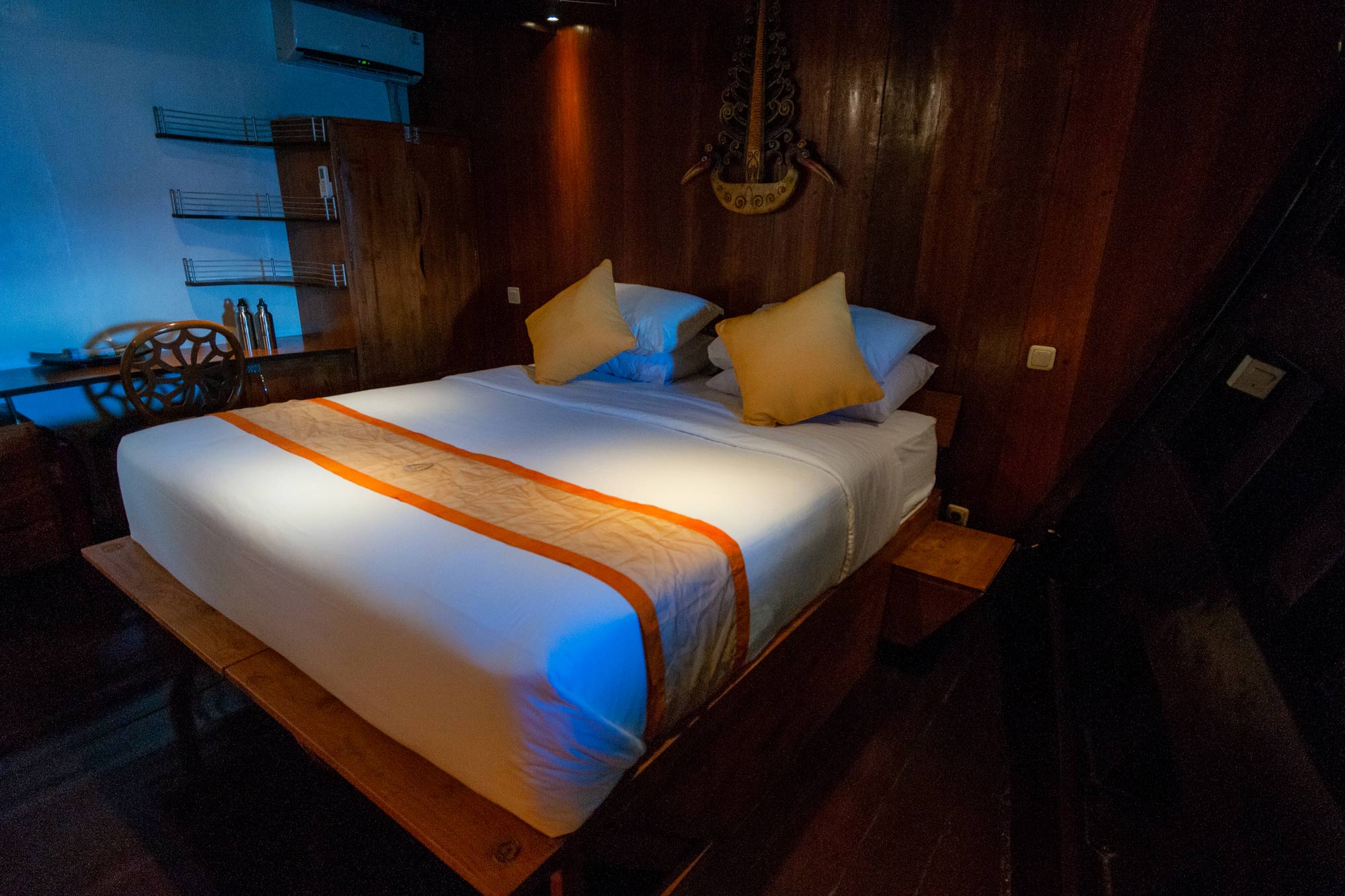 除了在房间内放松,客人还可以利用驾驶舱前巨大的日光甲板,那里有舒适的休闲家具,或前往船头的日光甲板,躺在两个吊床之一里放松。船上有一个大的潜水甲板和户外餐饮区,还有一个休息室和室内用餐区。Dewi Nusantara还配备了两艘7米长的玻璃纤维小艇,以方便潜水员前往印度尼西亚的最佳潜水点。