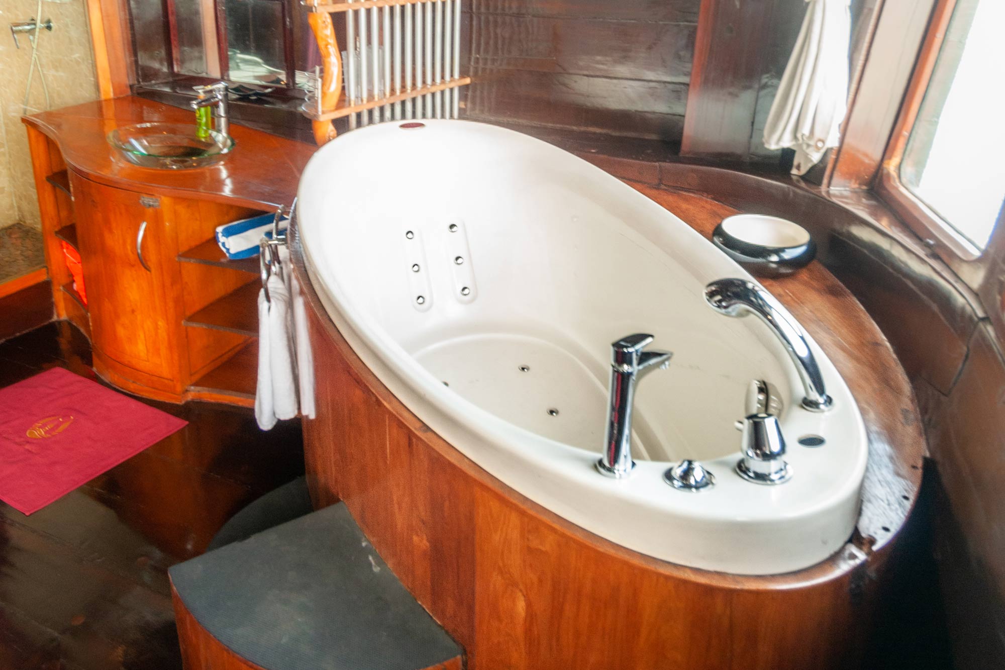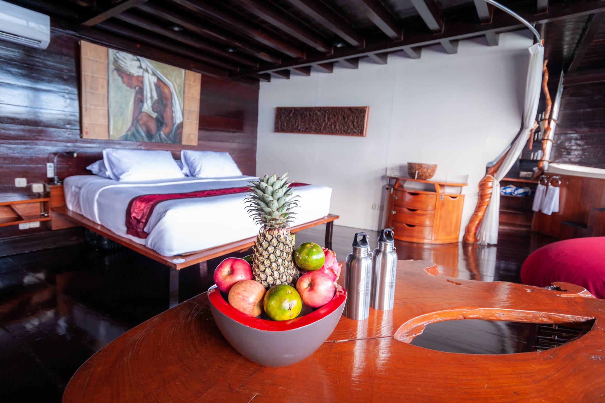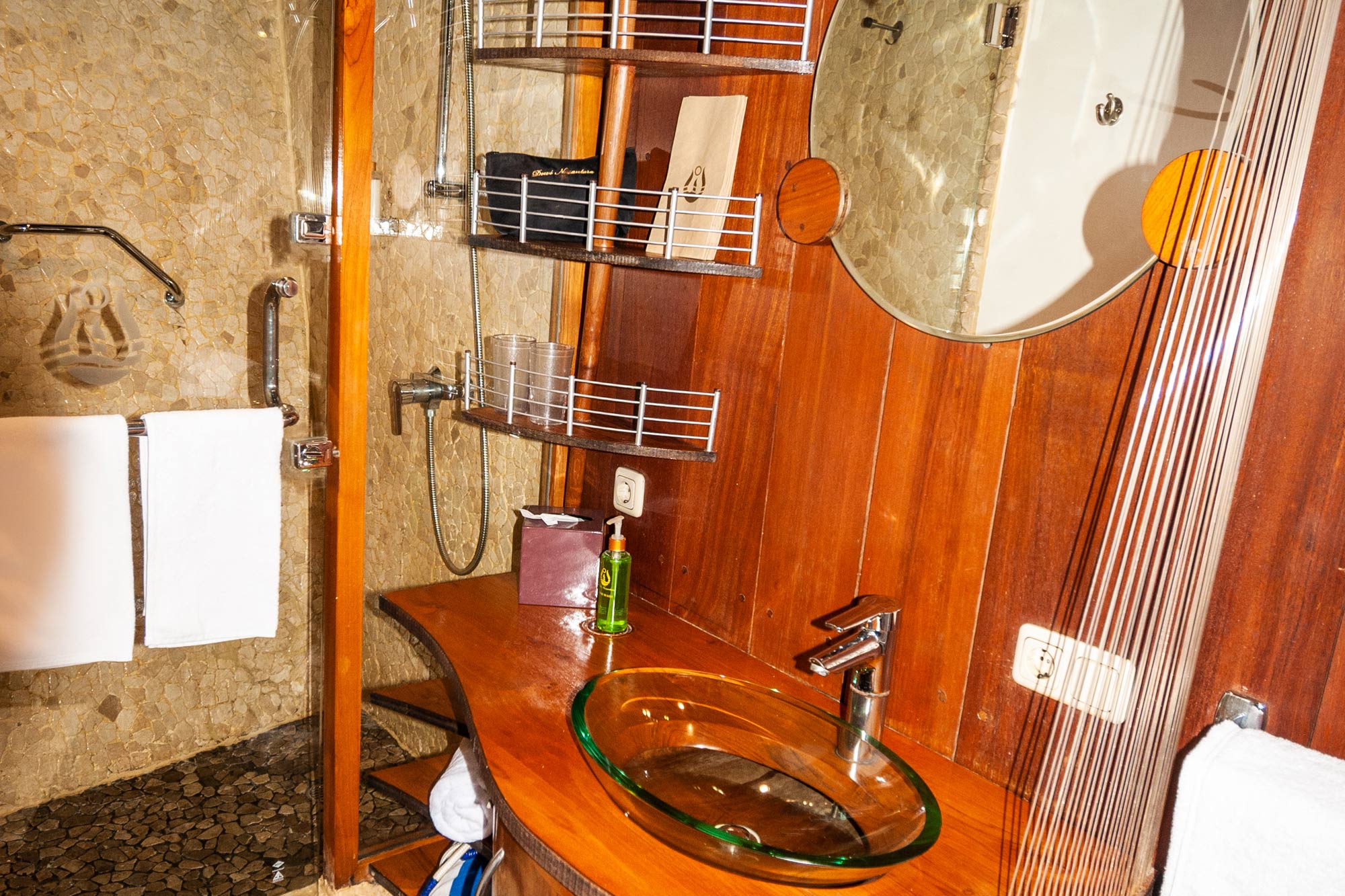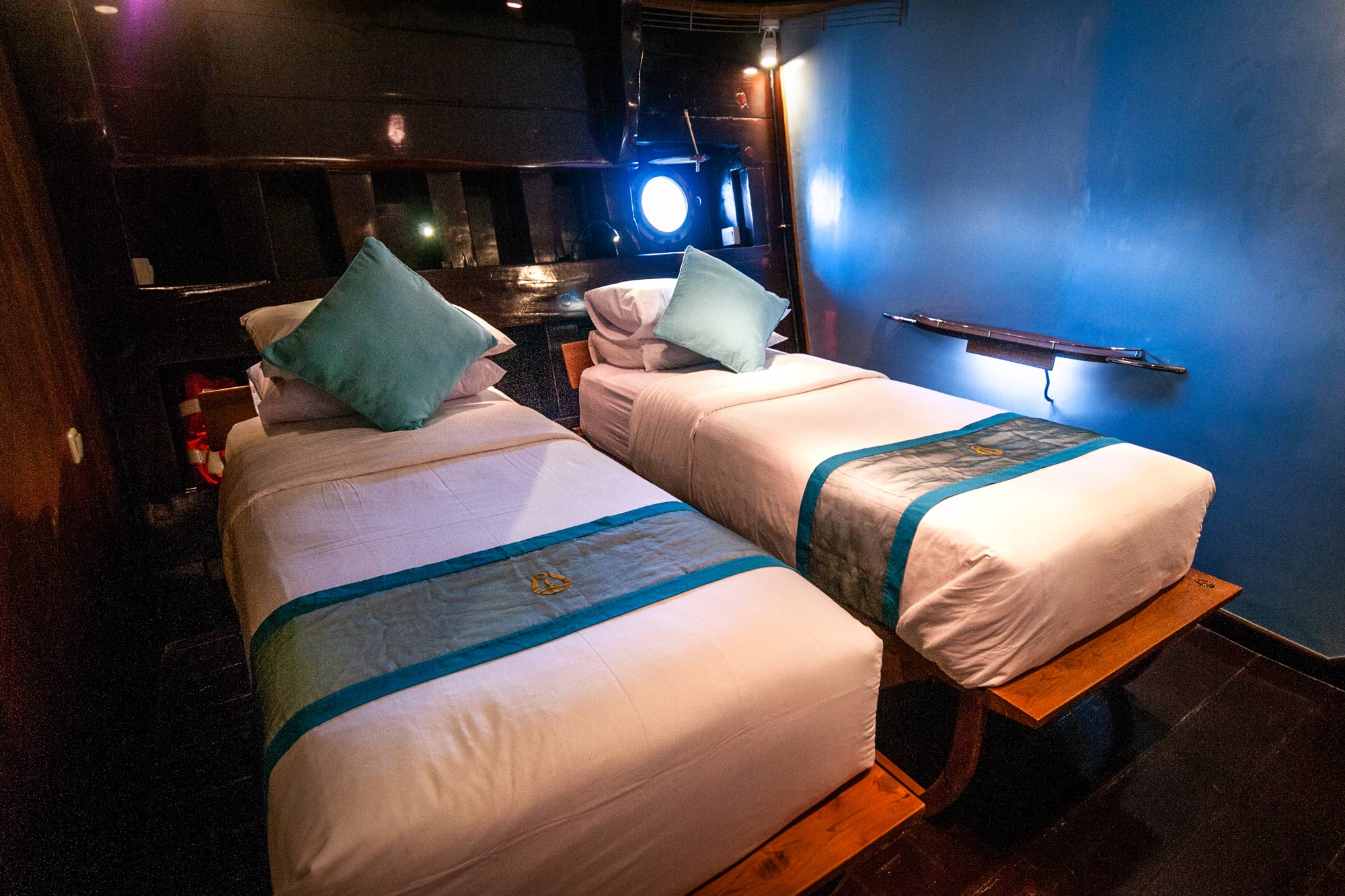 除了在房间内放松,客人还可以利用驾驶舱前巨大的日光甲板,那里有舒适的休闲家具,或前往船头的日光甲板,躺在两个吊床之一里放松。船上有一个大的潜水甲板和户外餐饮区,还有一个休息室和室内用餐区。Dewi Nusantara还配备了两艘7米长的玻璃纤维小艇,以方便潜水员前往印度尼西亚的最佳潜水点。