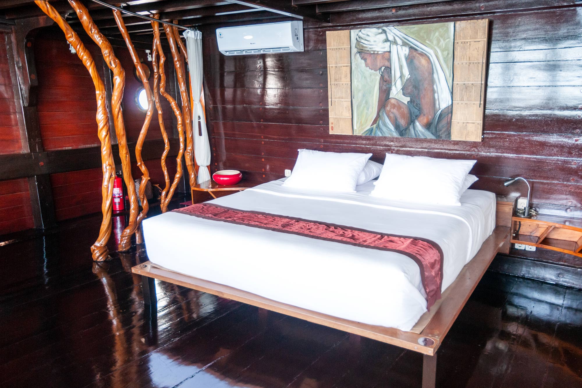 介绍Dewi Nusantara,一种通过印度尼西亚群岛的豪华船宿潜水体验。这艘长57米/180英尺的三桅木制双桅帆船可容纳18位乘客,提供宽敞的空调客房,均可选择双人床或双床入住。 46平方米的主人套房提供的全景视野令人叹为观止,每间客舱均配有独立浴室、桌椅以及足够的储物空间来存放个人物品。