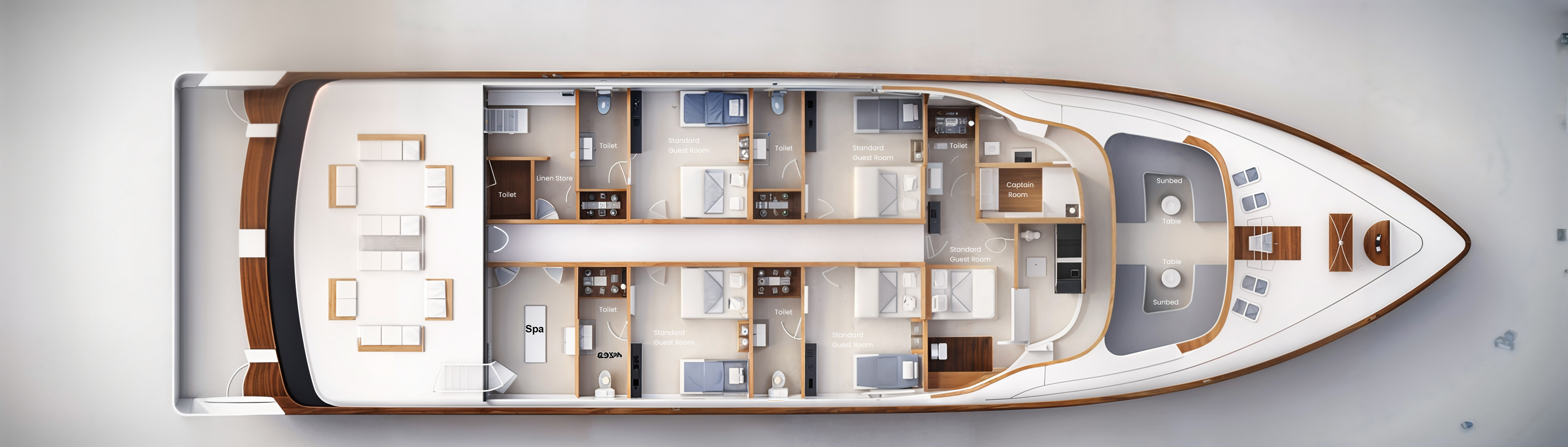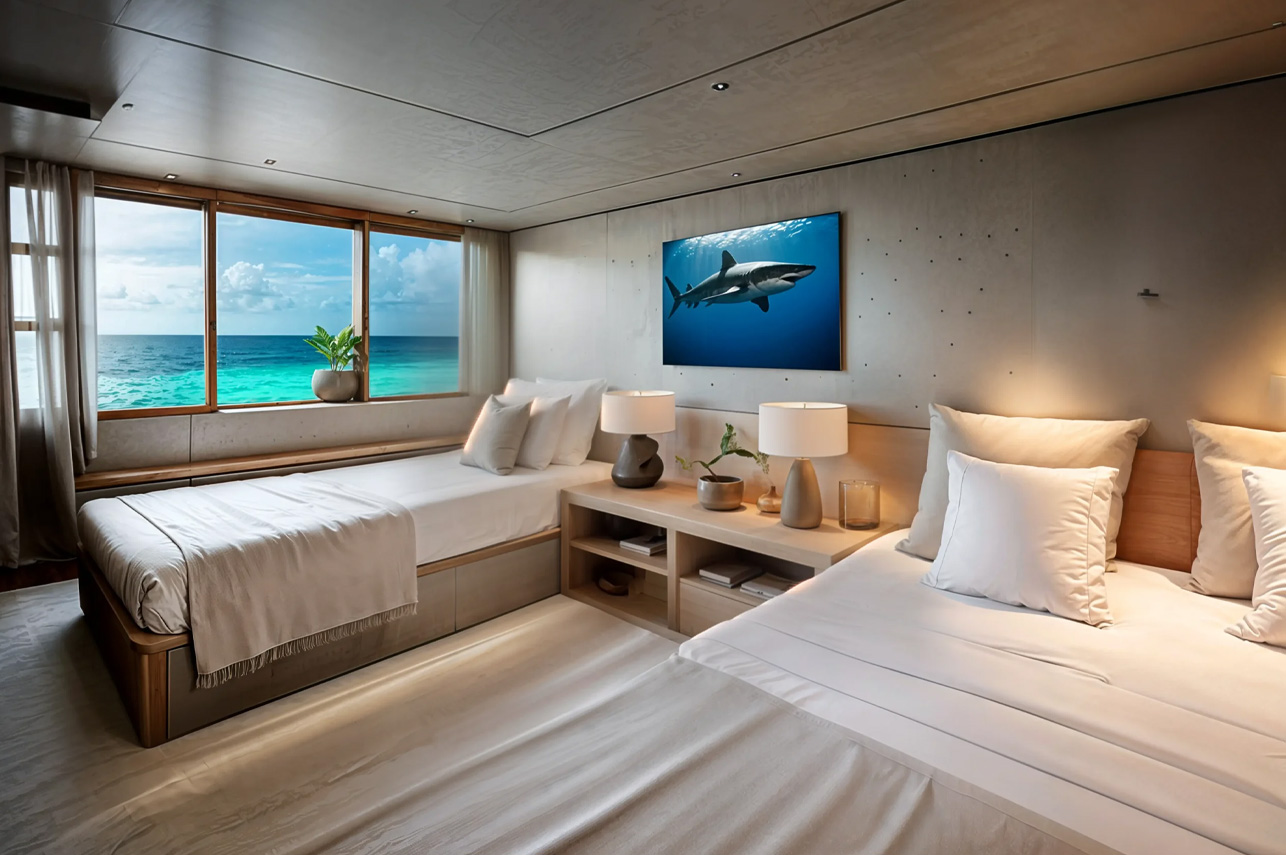 包含费用: 增值税, 机场接送, 饮用水, 茶和咖啡, 欢迎鸡尾酒, 全餐膳食计划(所有餐点), 零食, 潜水套餐, 钓鱼, 皮划艇, 陆地游览, 沙滩毛巾, 客舱毛巾, 甲板毛巾。