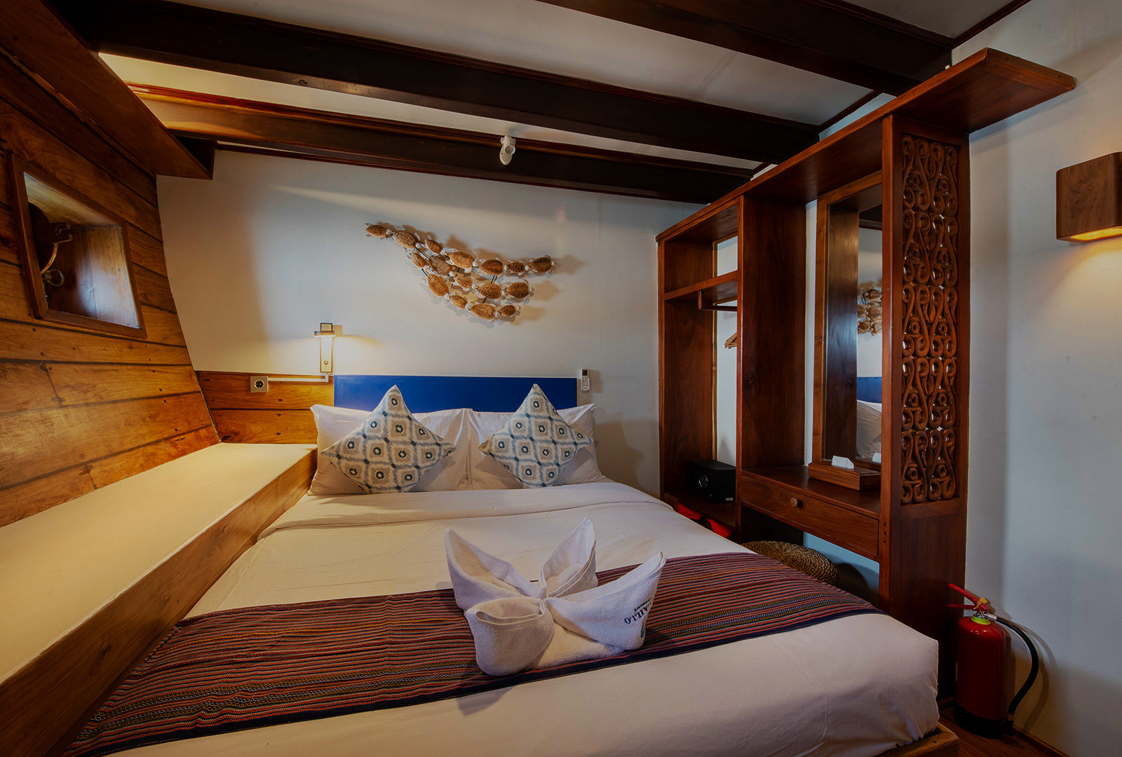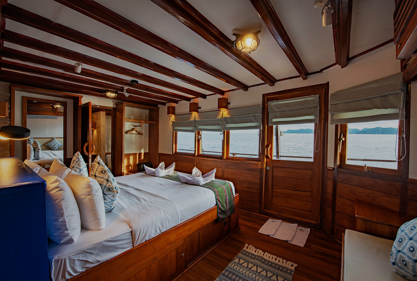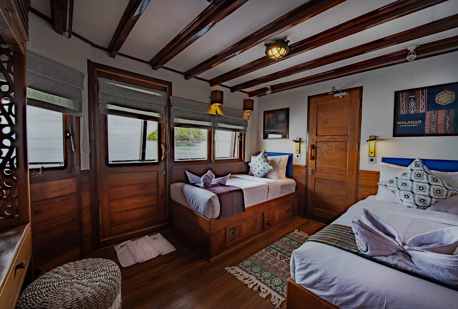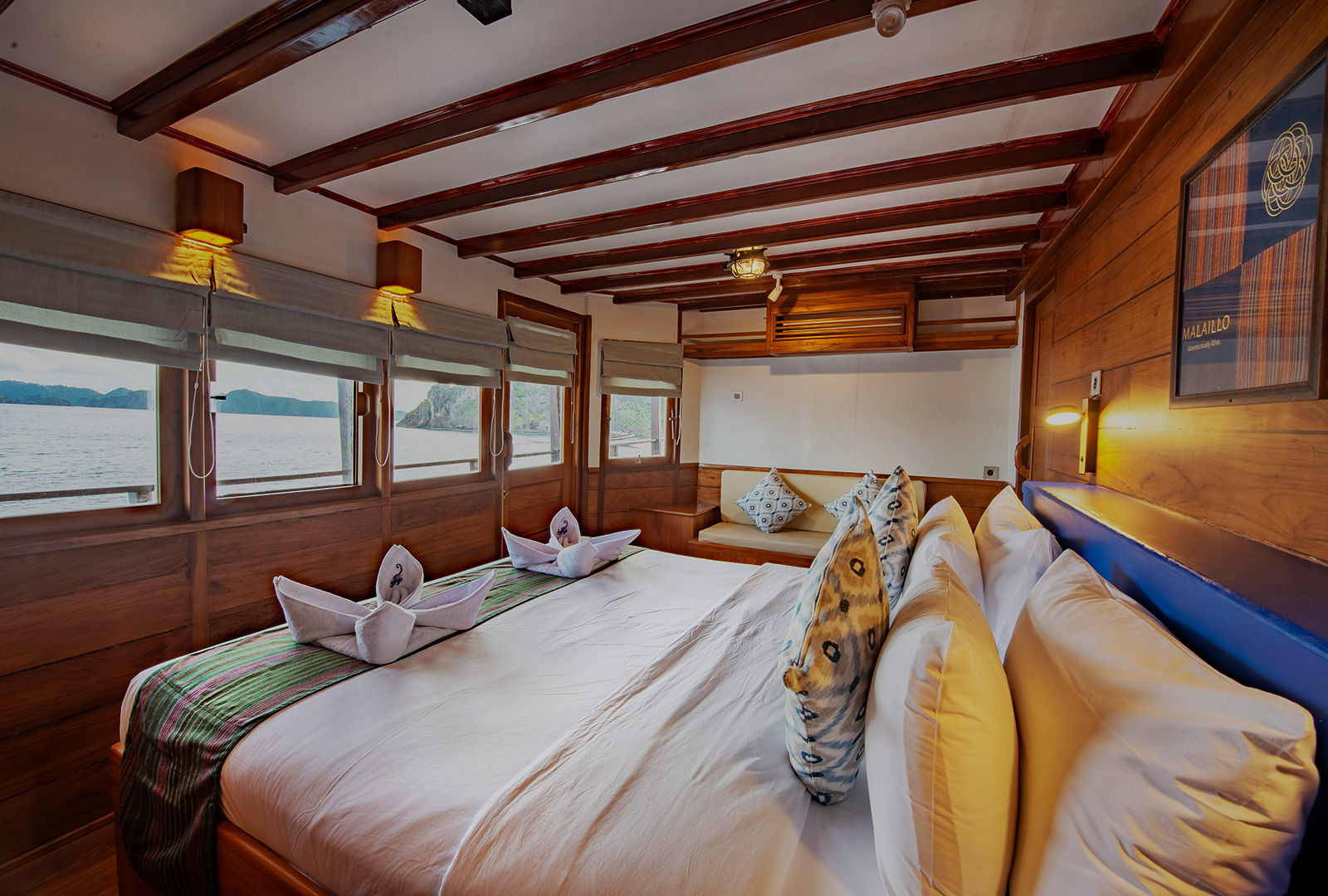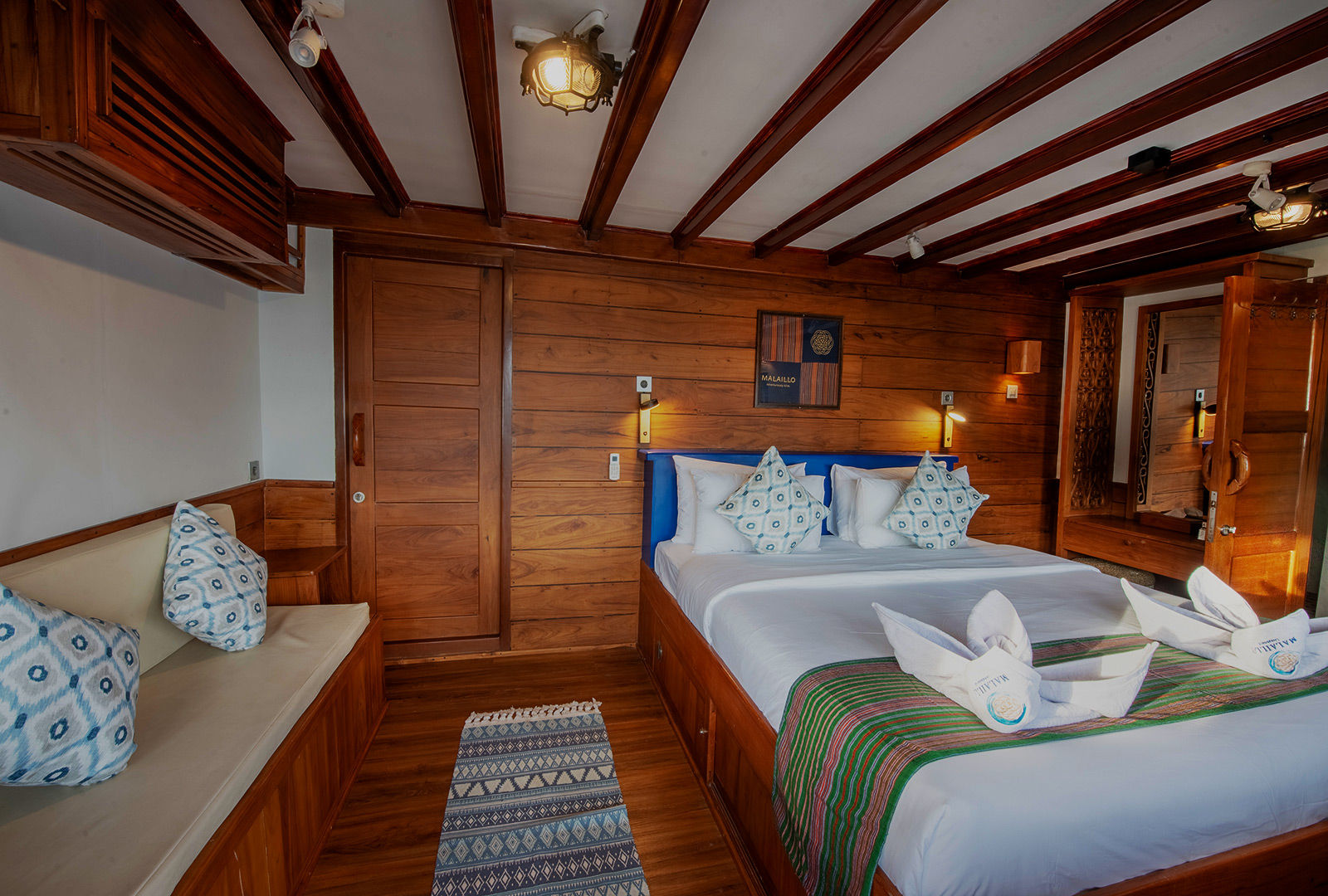 Malaillo is a 45-meter (147-foot) phinisi liveaboard accommodating 14 guests across 7 cabins: 3 doubles and 4 twins, all with private en-suite bathrooms, and individually controlled air conditioning. Spread across 3 decks, the cabins offer ample natural light and sea views, with the master suite on the upper deck. Guests can relax in various social spaces, including a cozy indoor lounge, open-air dining areas, and a large sun deck perfect for soaking up the Indonesian sunshine.