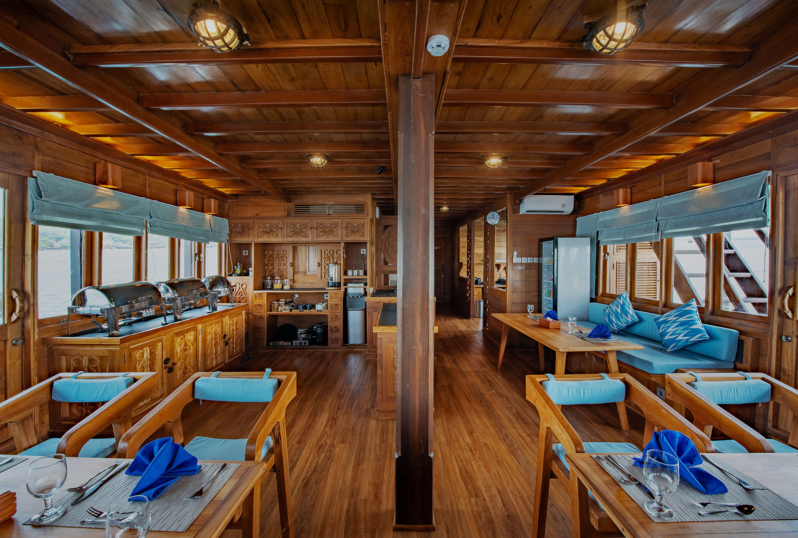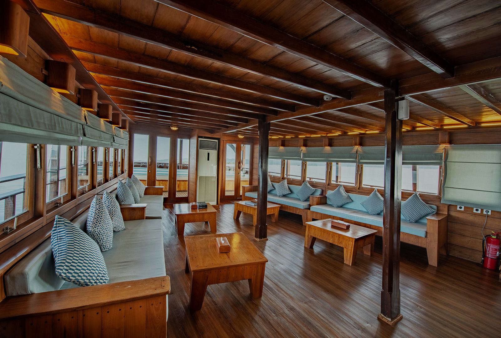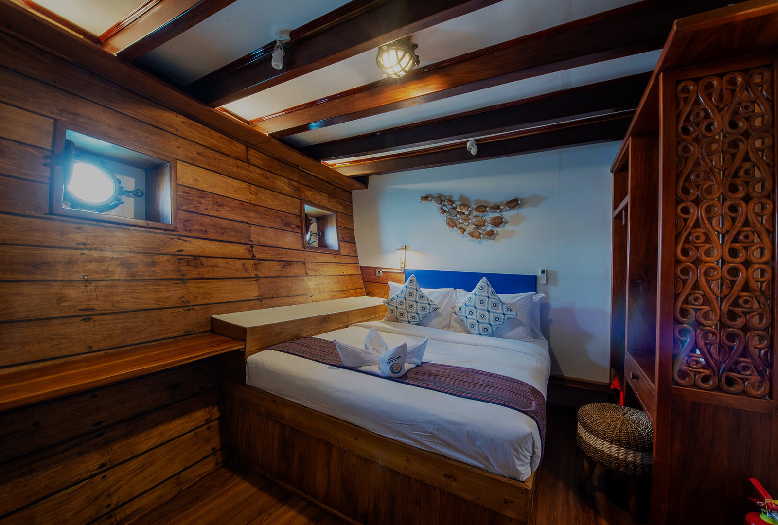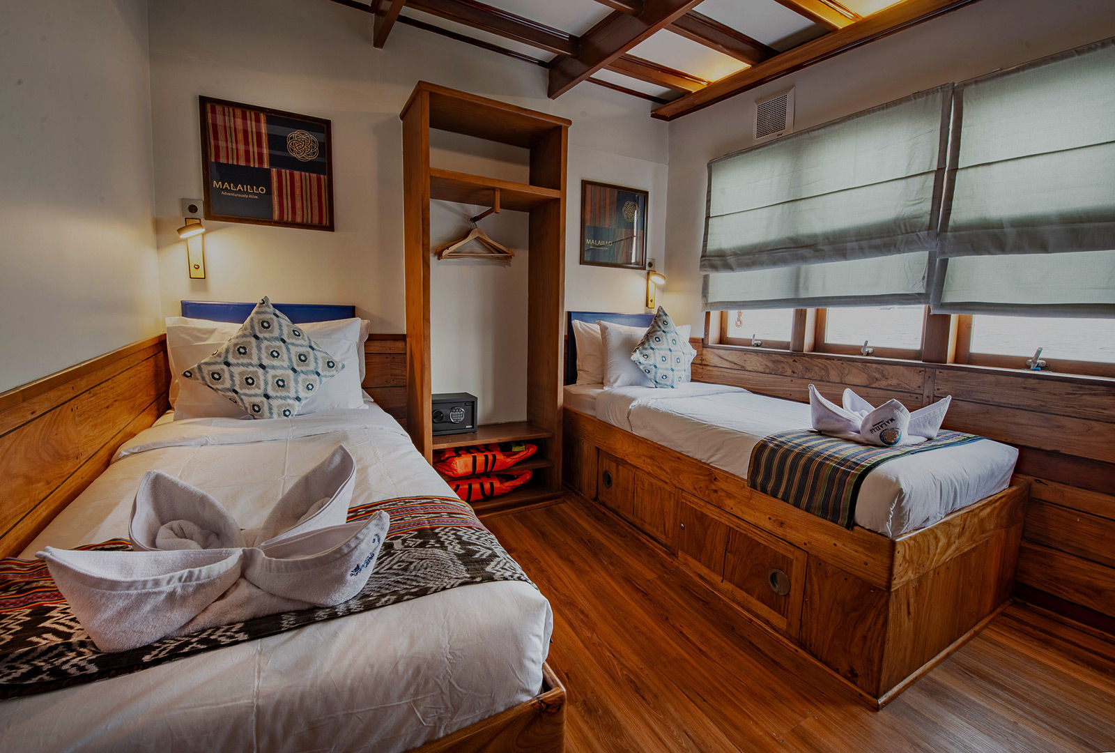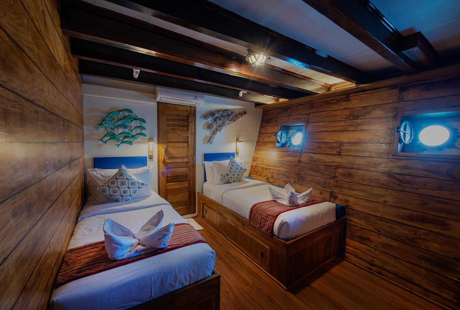 Malaillo is a 45-meter (147-foot) phinisi liveaboard accommodating 14 guests across 7 cabins: 3 doubles and 4 twins, all with private en-suite bathrooms, and individually controlled air conditioning. Spread across 3 decks, the cabins offer ample natural light and sea views, with the master suite on the upper deck. Guests can relax in various social spaces, including a cozy indoor lounge, open-air dining areas, and a large sun deck perfect for soaking up the Indonesian sunshine.