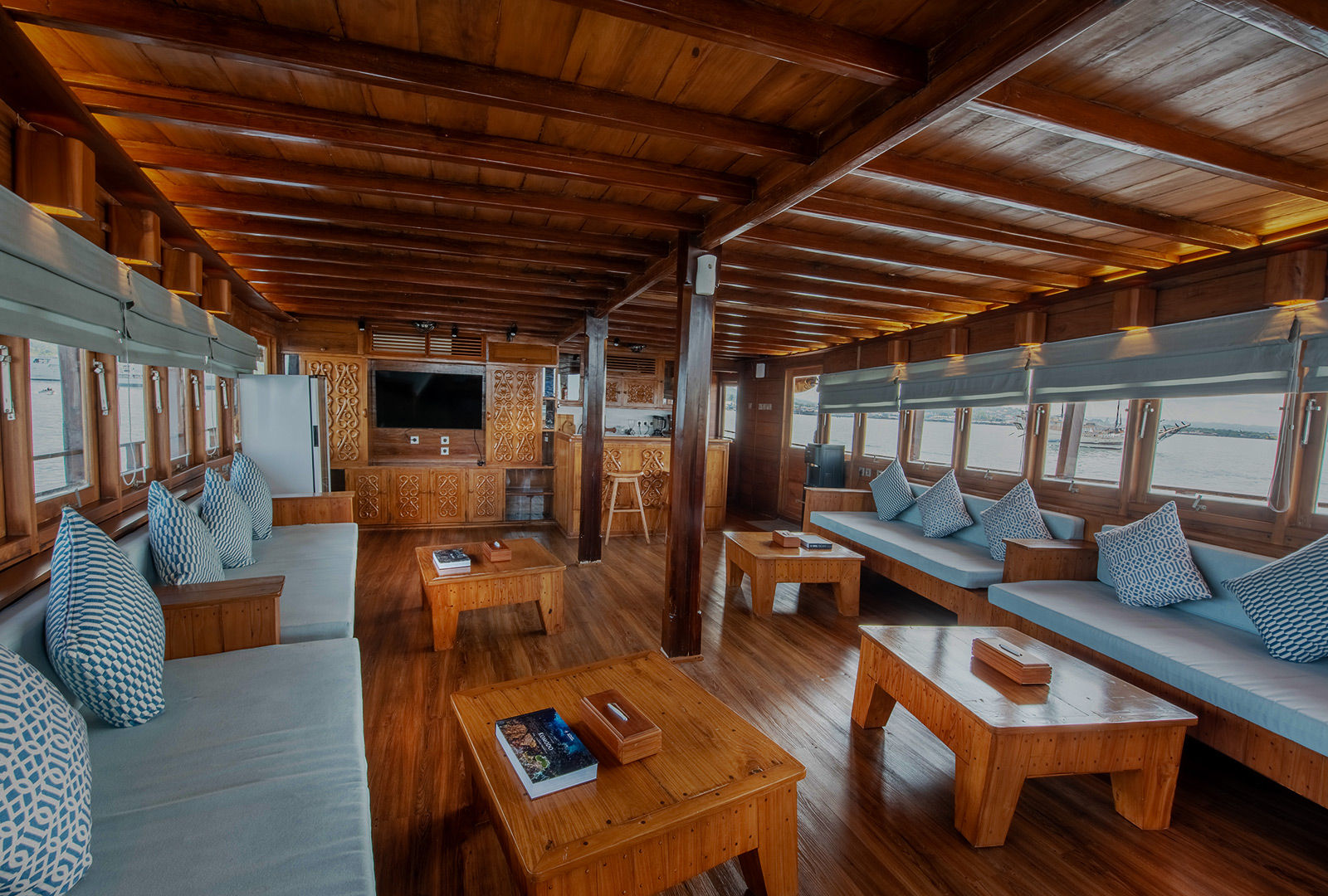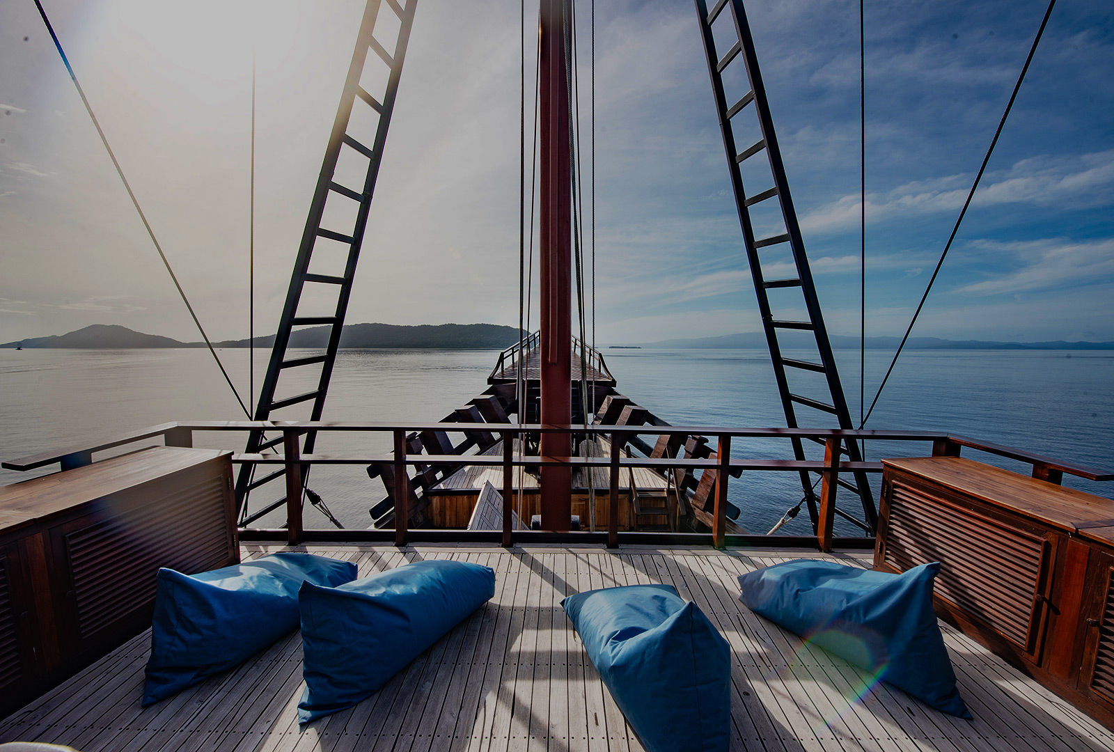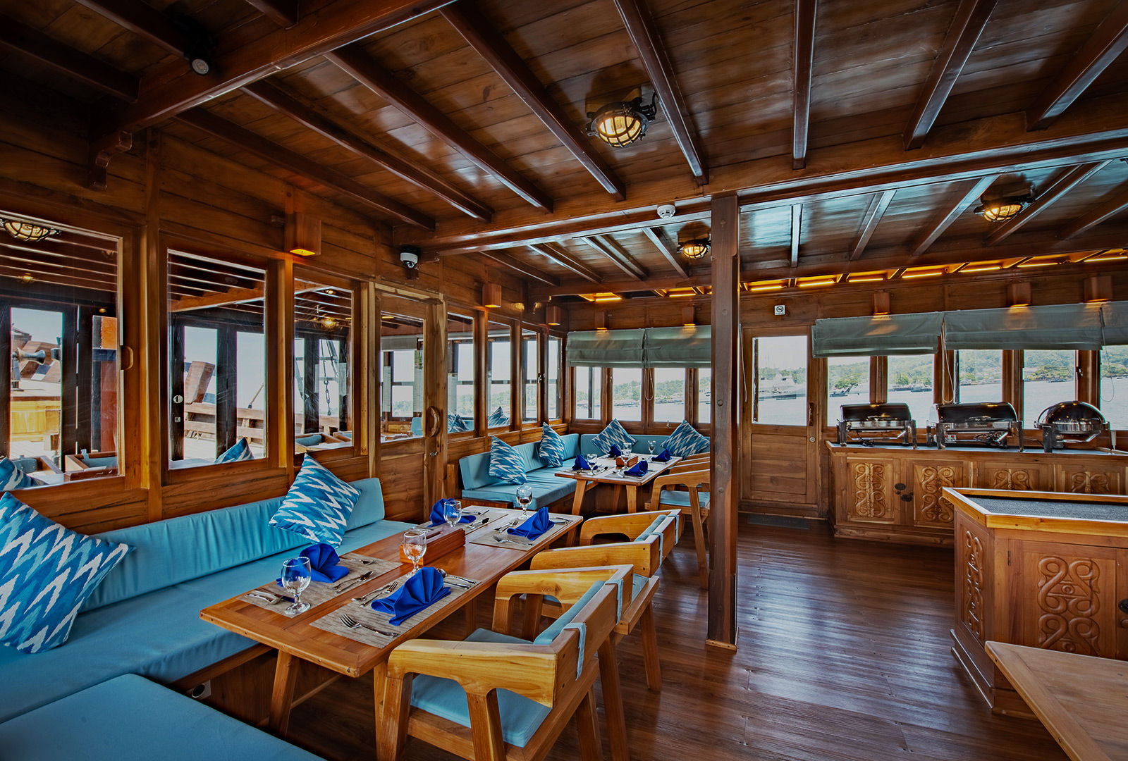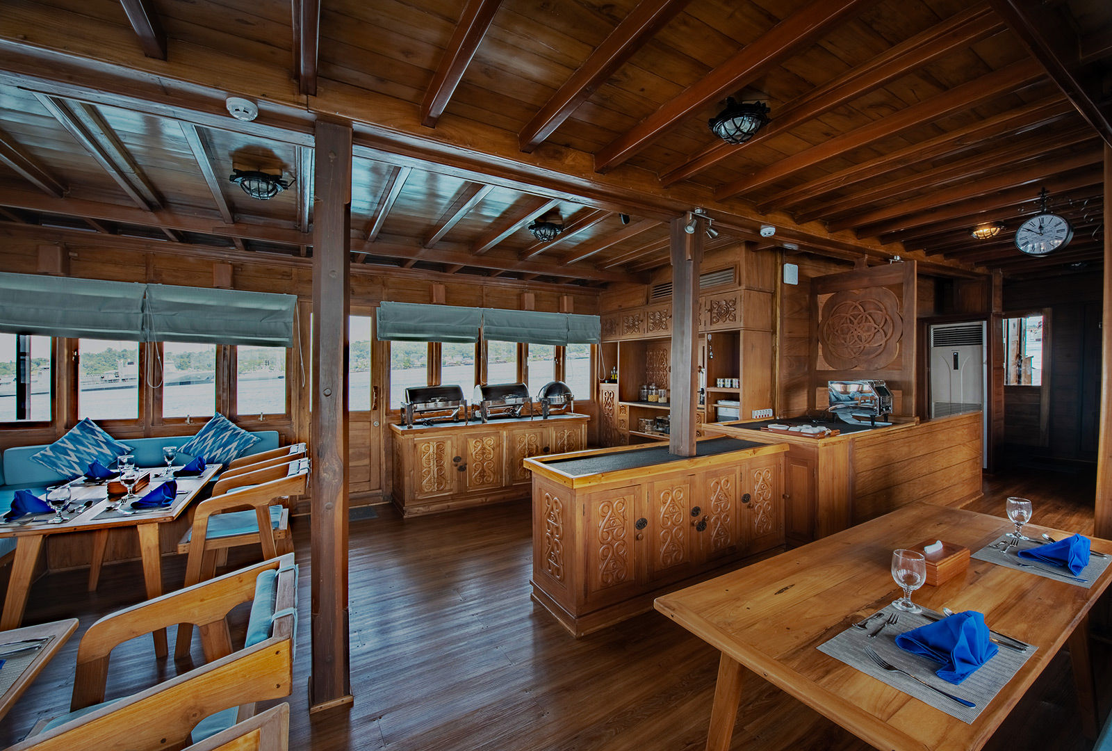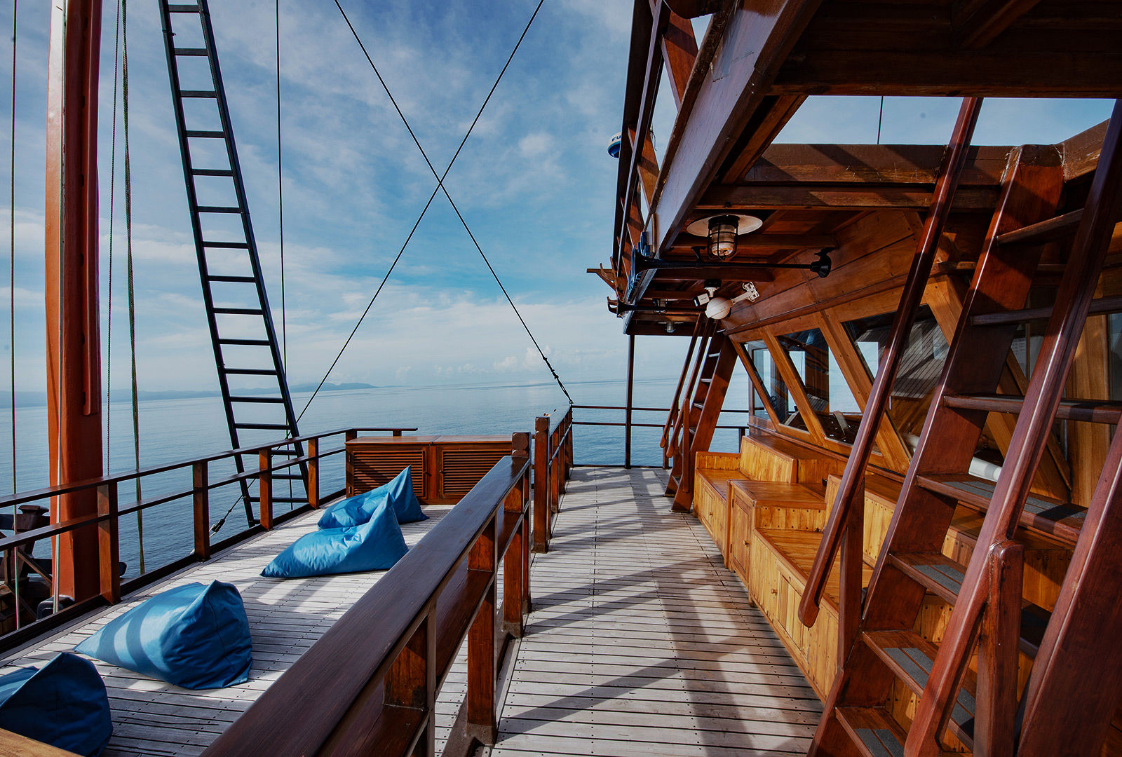 Malaillo is a 45-meter (147-foot) phinisi liveaboard accommodating 14 guests across 7 cabins: 3 doubles and 4 twins, all with private en-suite bathrooms, and individually controlled air conditioning. Spread across 3 decks, the cabins offer ample natural light and sea views, with the master suite on the upper deck. Guests can relax in various social spaces, including a cozy indoor lounge, open-air dining areas, and a large sun deck perfect for soaking up the Indonesian sunshine.
