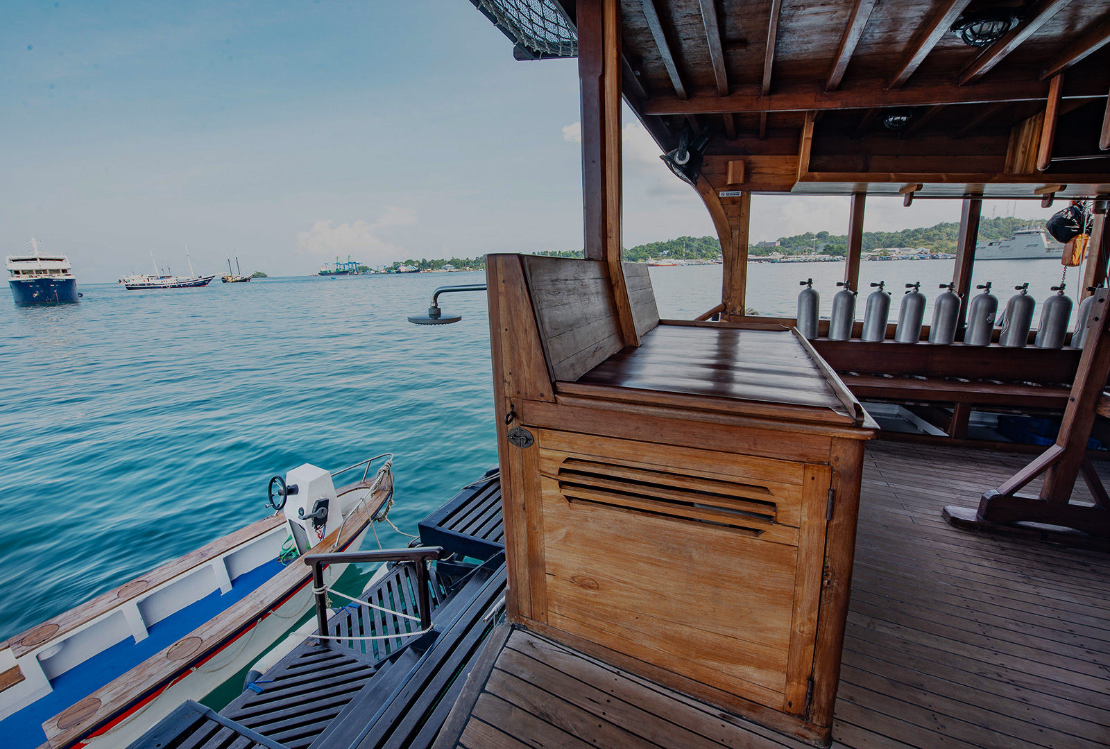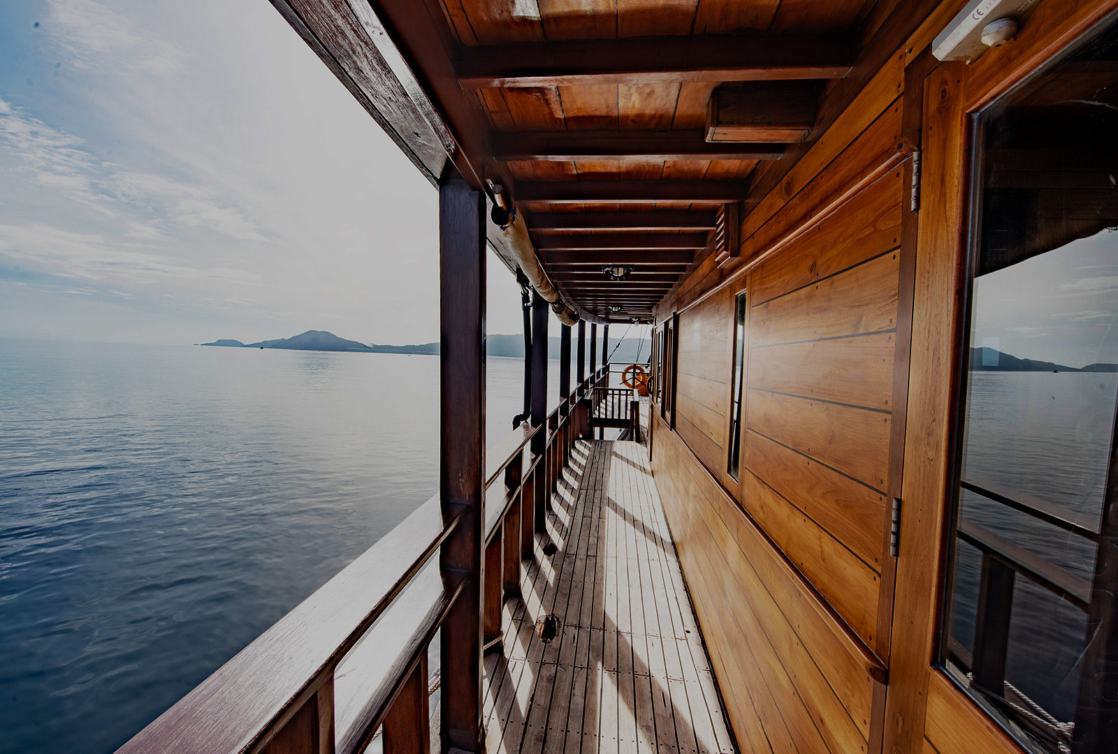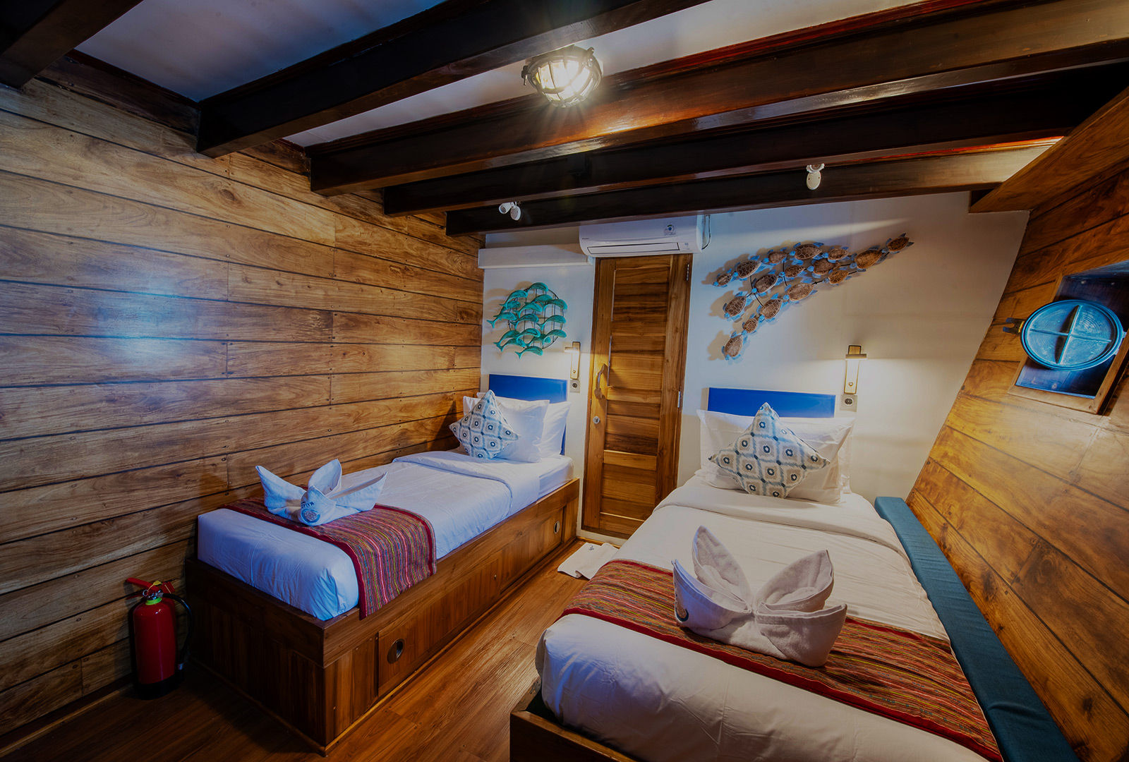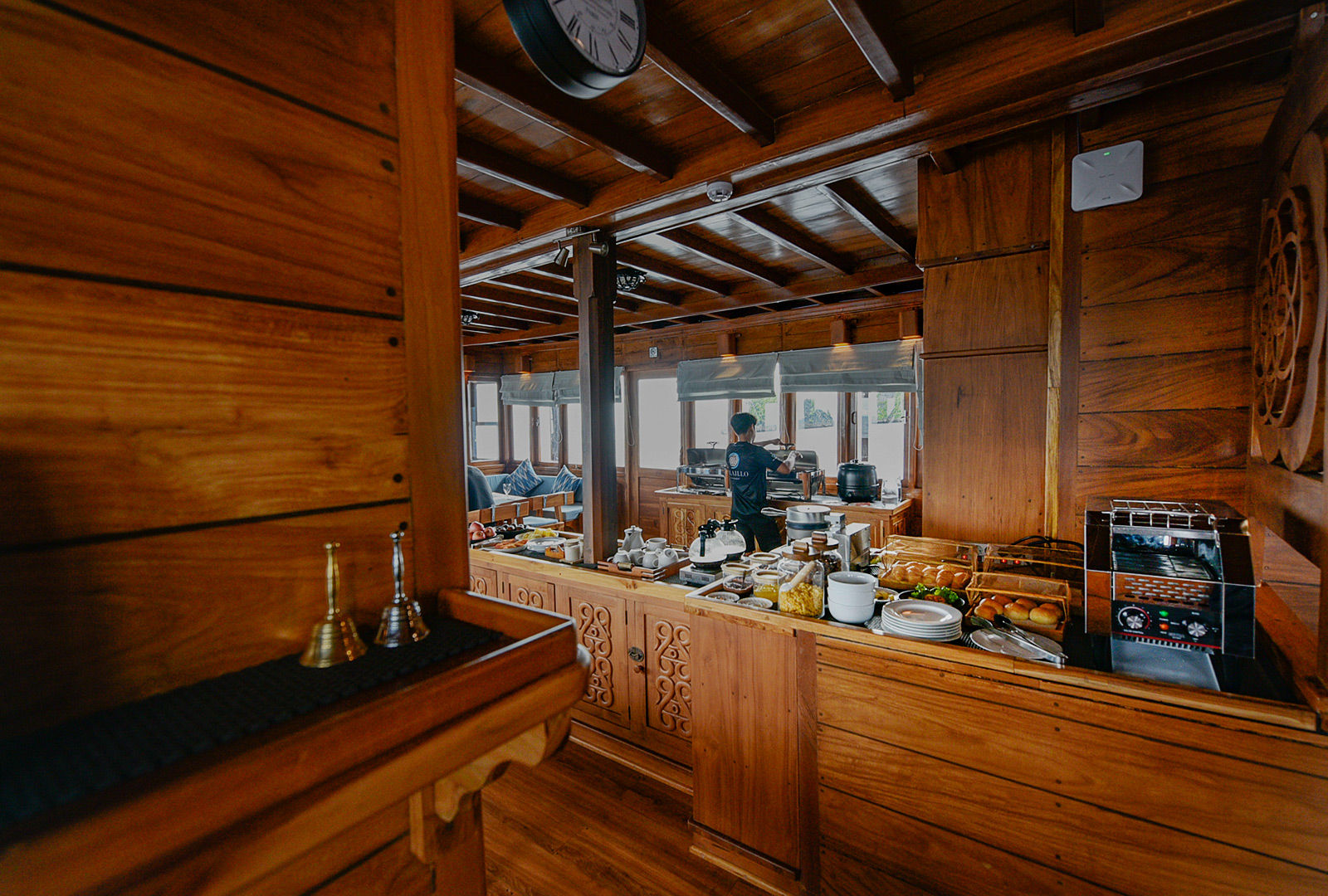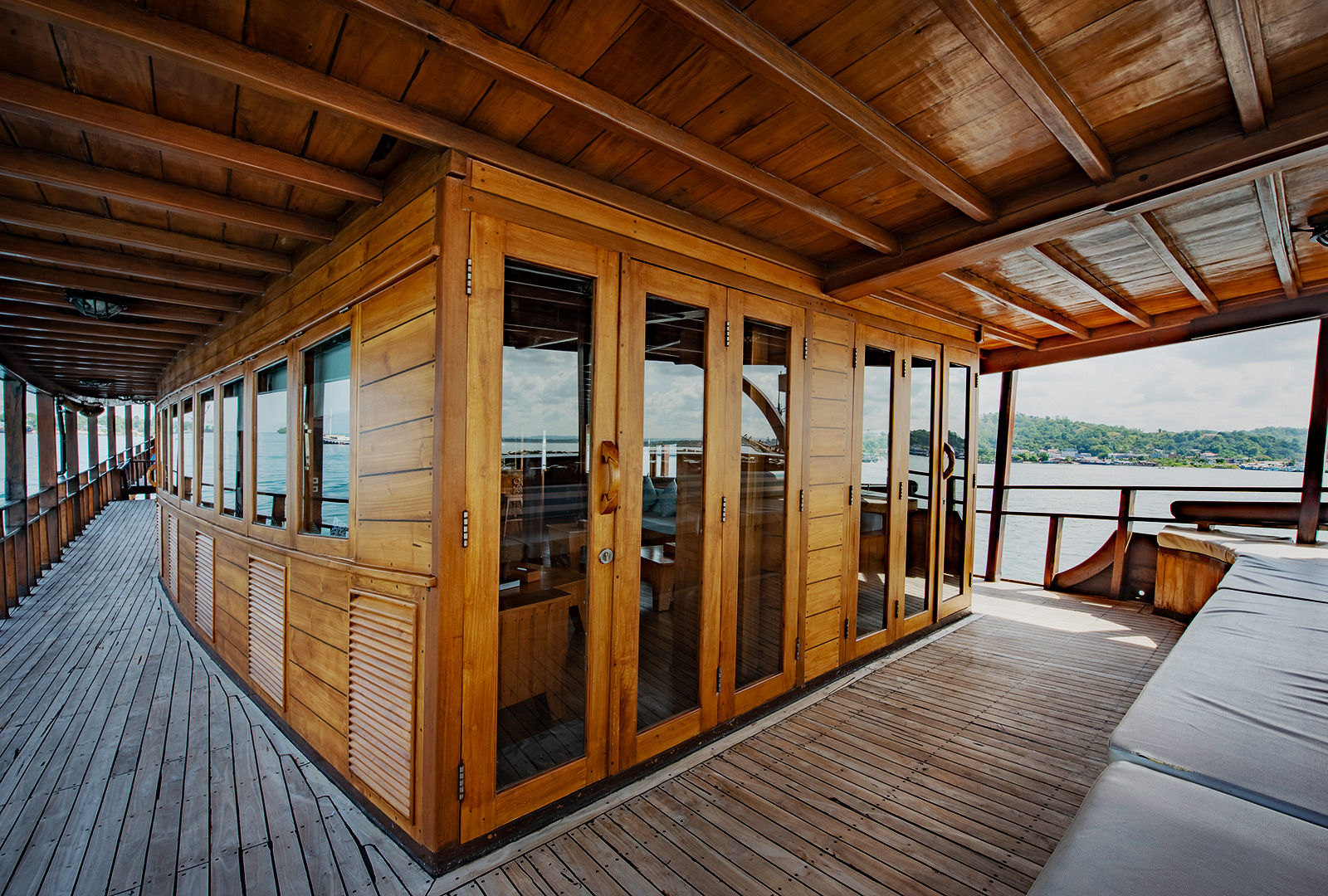 Malaillo is a 45-meter (147-foot) phinisi liveaboard accommodating 14 guests across 7 cabins: 3 doubles and 4 twins, all with private en-suite bathrooms, and individually controlled air conditioning. Spread across 3 decks, the cabins offer ample natural light and sea views, with the master suite on the upper deck. Guests can relax in various social spaces, including a cozy indoor lounge, open-air dining areas, and a large sun deck perfect for soaking up the Indonesian sunshine.