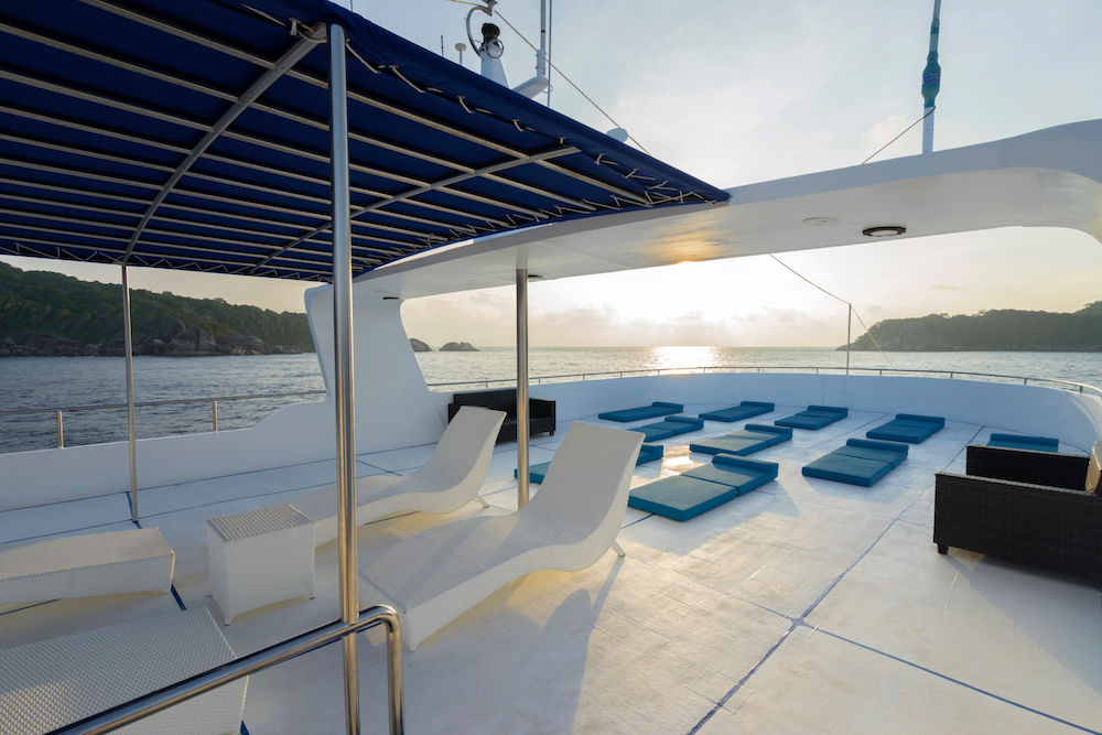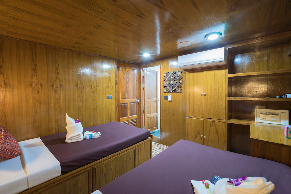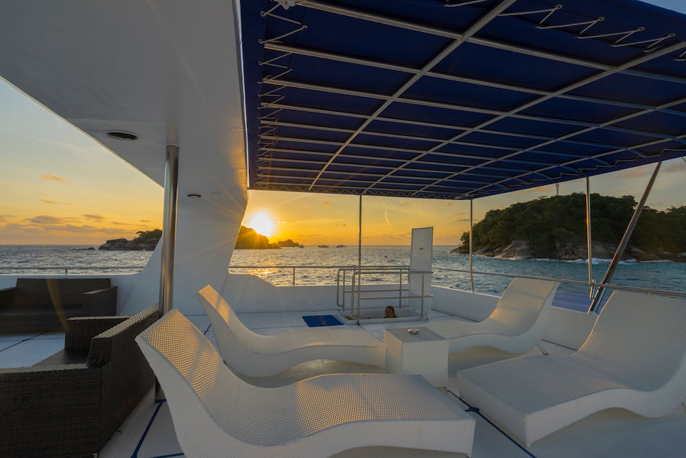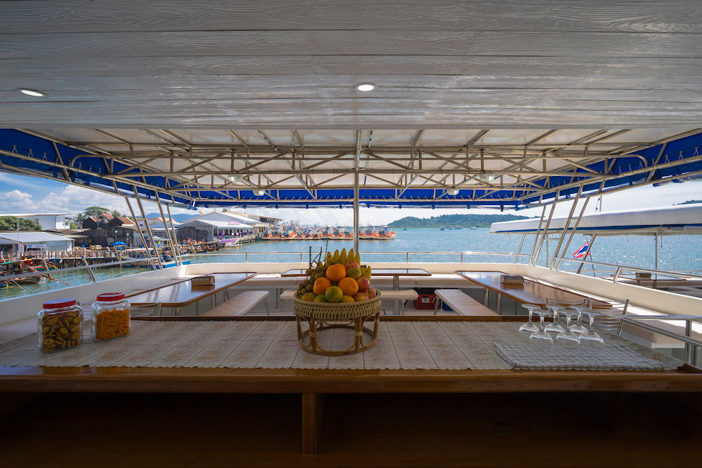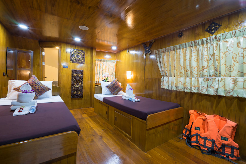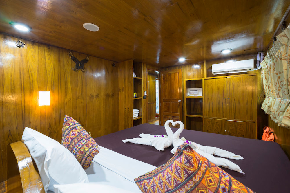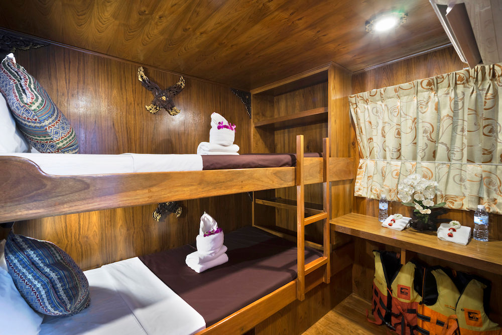 Topside, the Sawasdee Fasai, has 15 air-conditioned cabins catering to a maximum of 30 guests. Located on the main deck are 2 master cabins and 5 deluxe cabins, each with sea views and en-suite bathrooms. On the lower deck are 4 standard cabins with en-suite bathrooms and 4 budget cabins with shared bathroom facilities. There is plenty of room for relaxation with the huge sundeck, outside lounge area, indoor lounge, and refreshment bar.