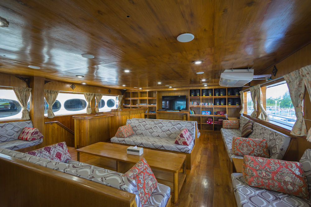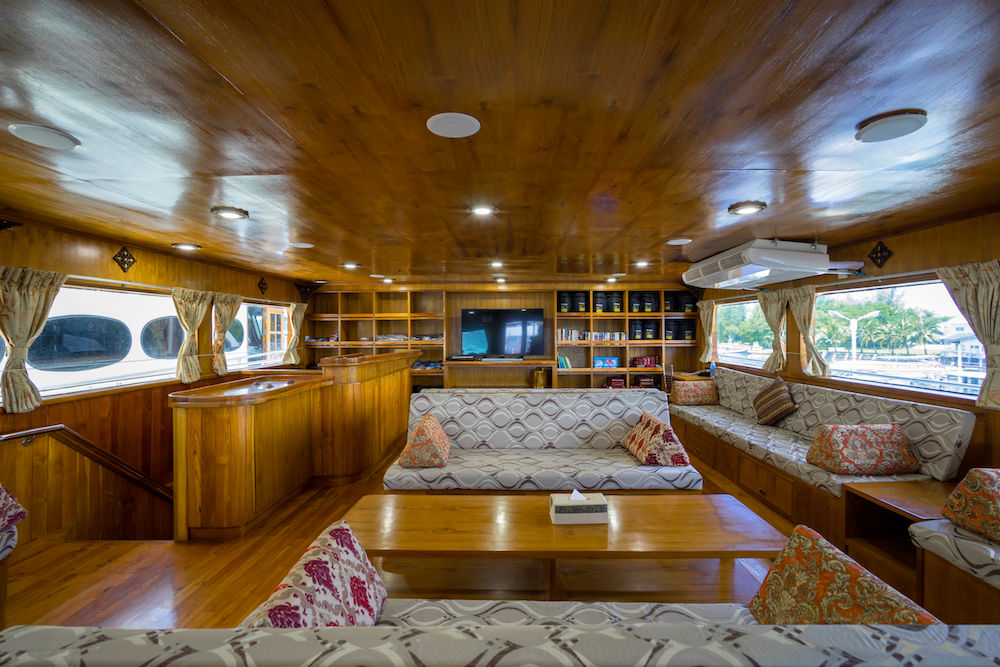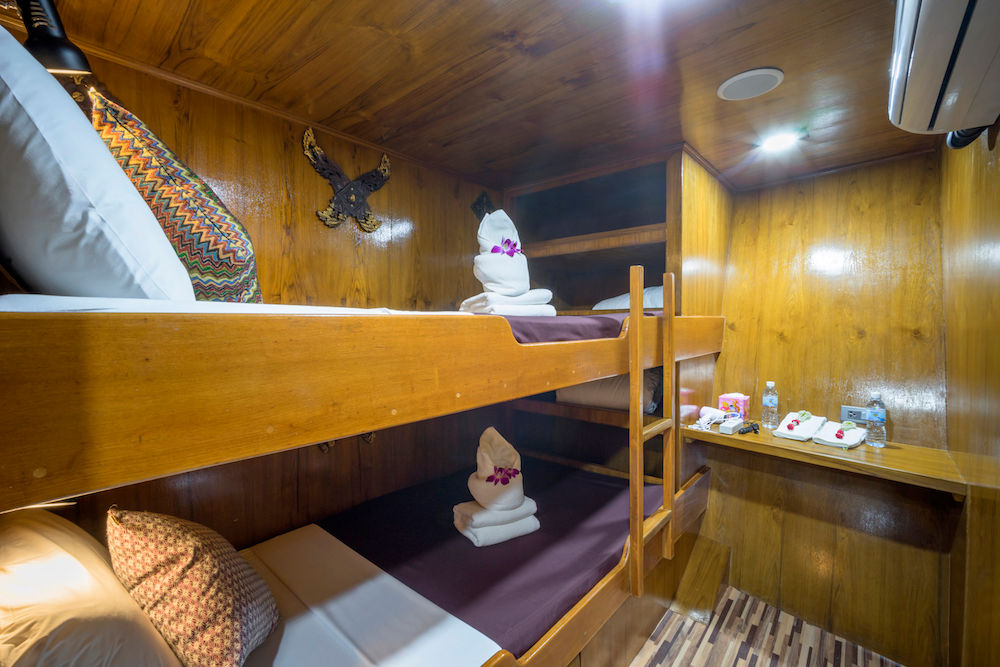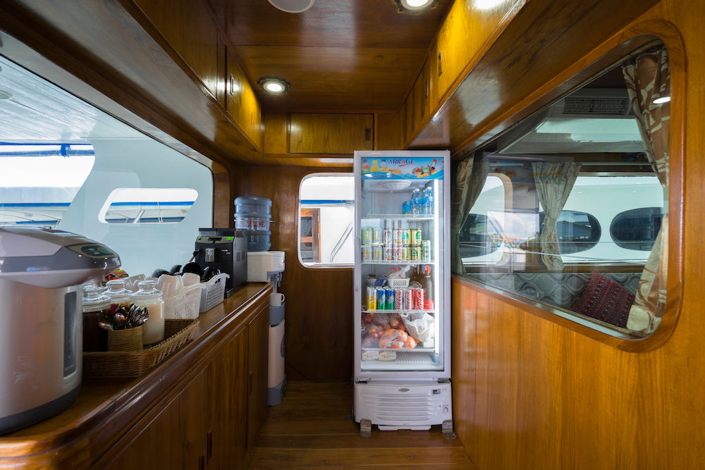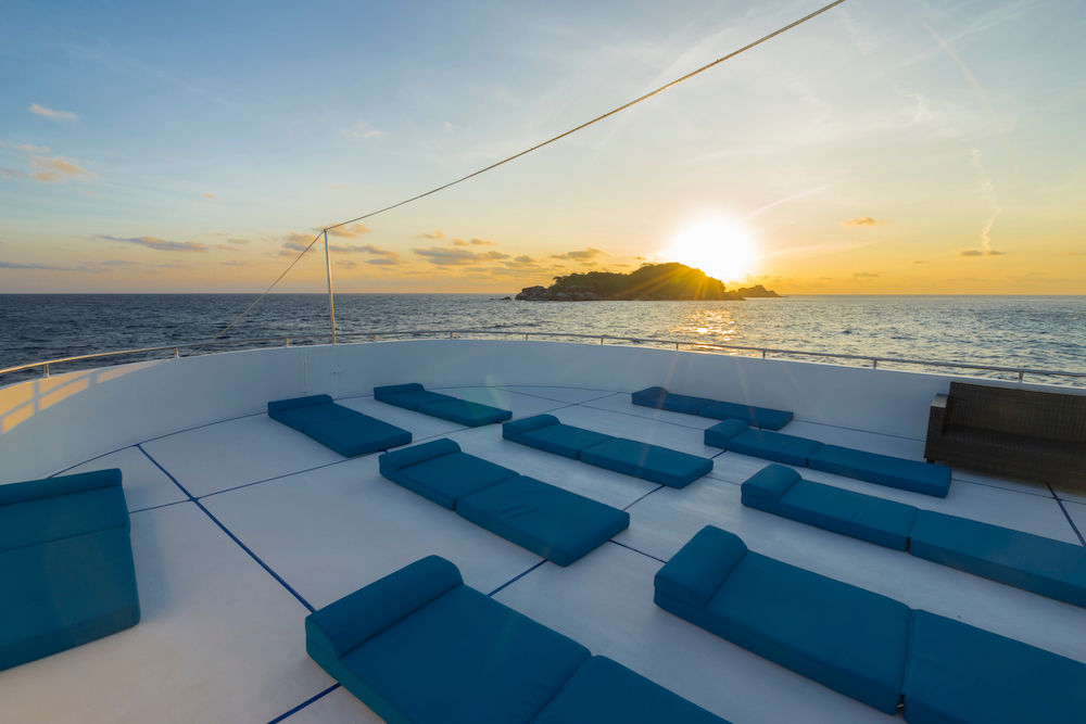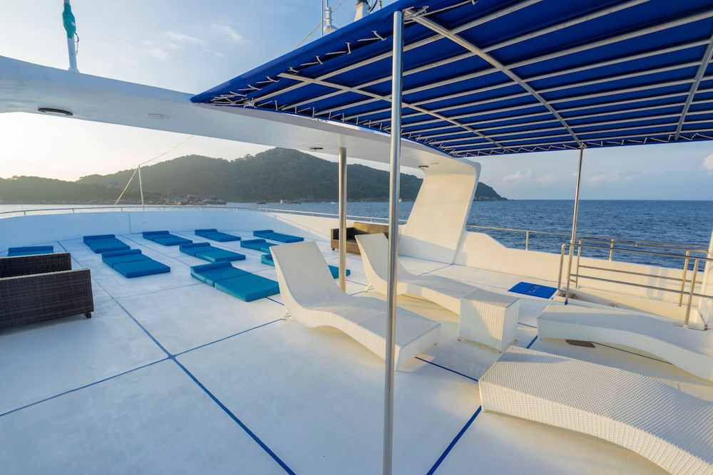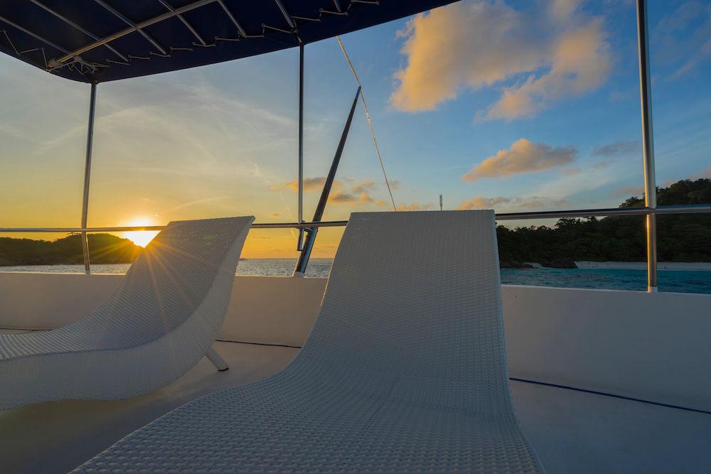 Topside, the Sawasdee Fasai, has 15 air-conditioned cabins catering to a maximum of 30 guests. Located on the main deck are 2 master cabins and 5 deluxe cabins, each with sea views and en-suite bathrooms. On the lower deck are 4 standard cabins with en-suite bathrooms and 4 budget cabins with shared bathroom facilities. There is plenty of room for relaxation with the huge sundeck, outside lounge area, indoor lounge, and refreshment bar.