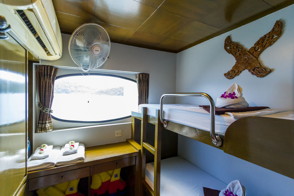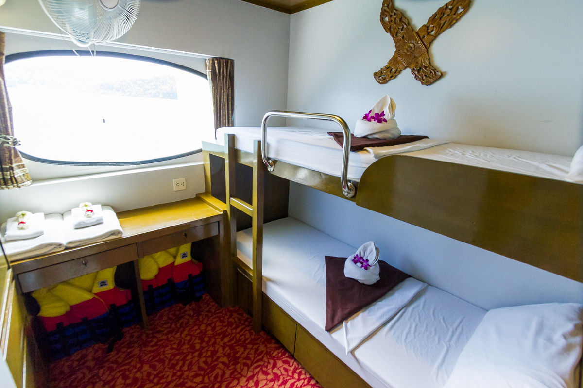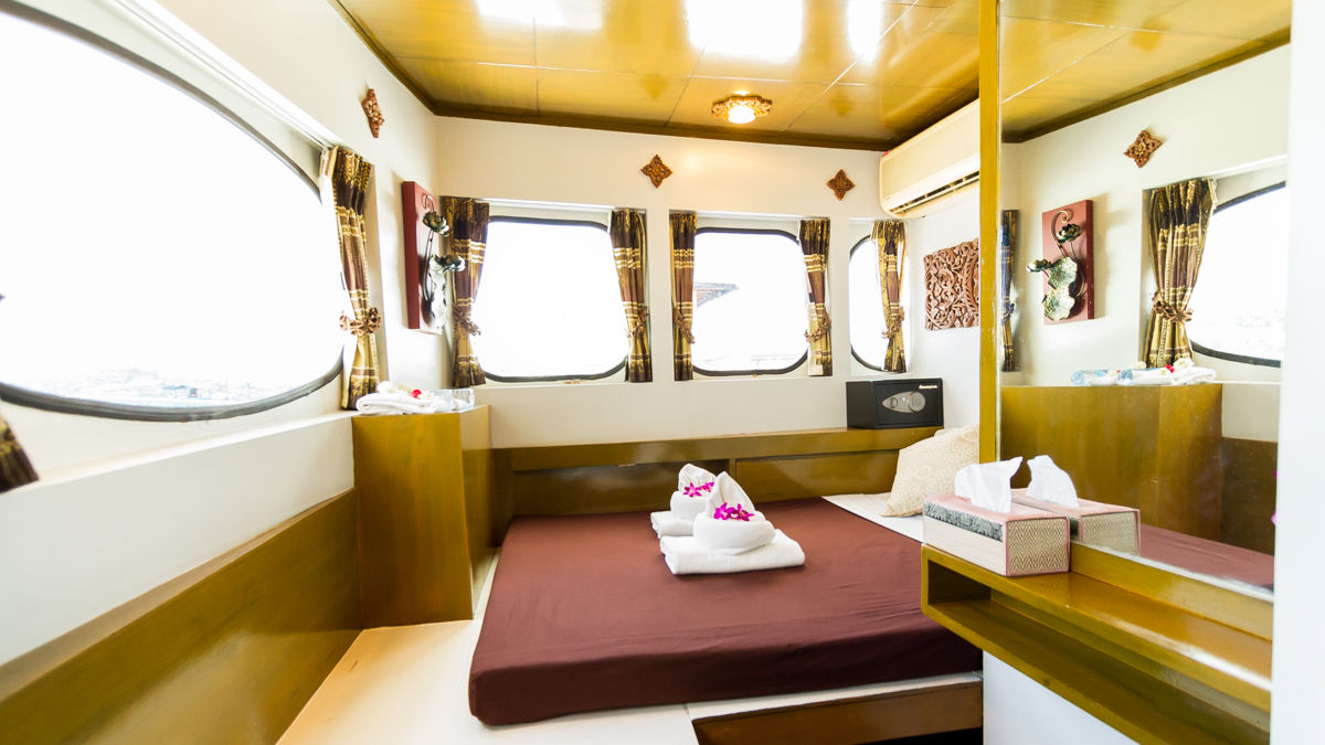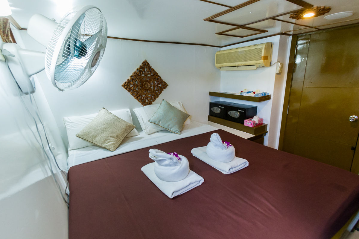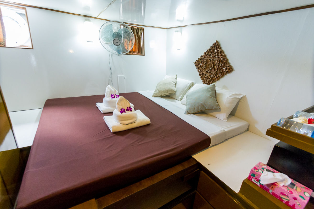 Topside, the MV Pawara Liveaboard offers 2 budget cabins with shared bathrooms and 10 cabins with en-suite bathrooms. Each cabin is air-conditioned and provides towels, toiletries, and a safety deposit box. For relaxation in between dives, guests can choose from the entertainment room equipped with a TV, DVD, sound system, karaoke, games, and more, or the sun deck with comfortable soft mattresses. In the dining room, 3 delicious Thai and International cuisine meals will be served daily, and cookies, fresh fruit, tea, coffee, and drinking water are available all day.