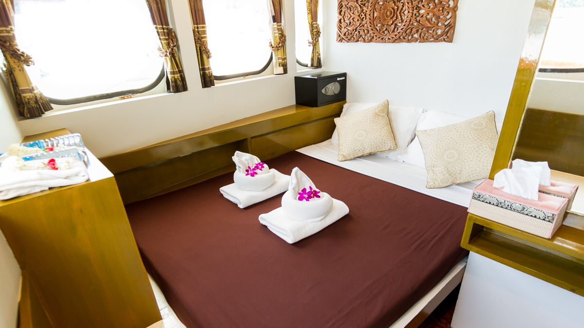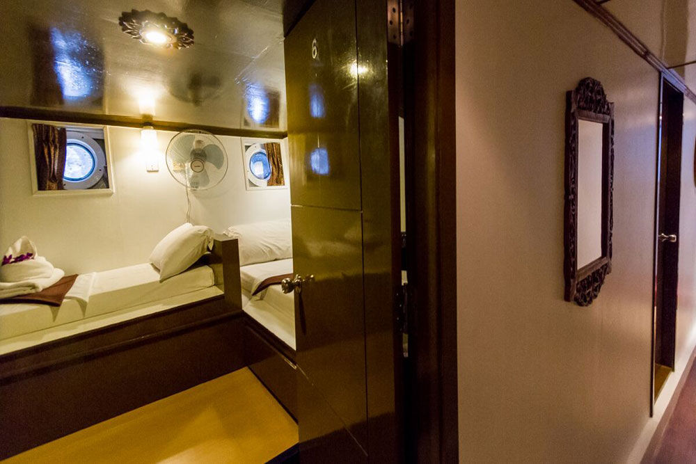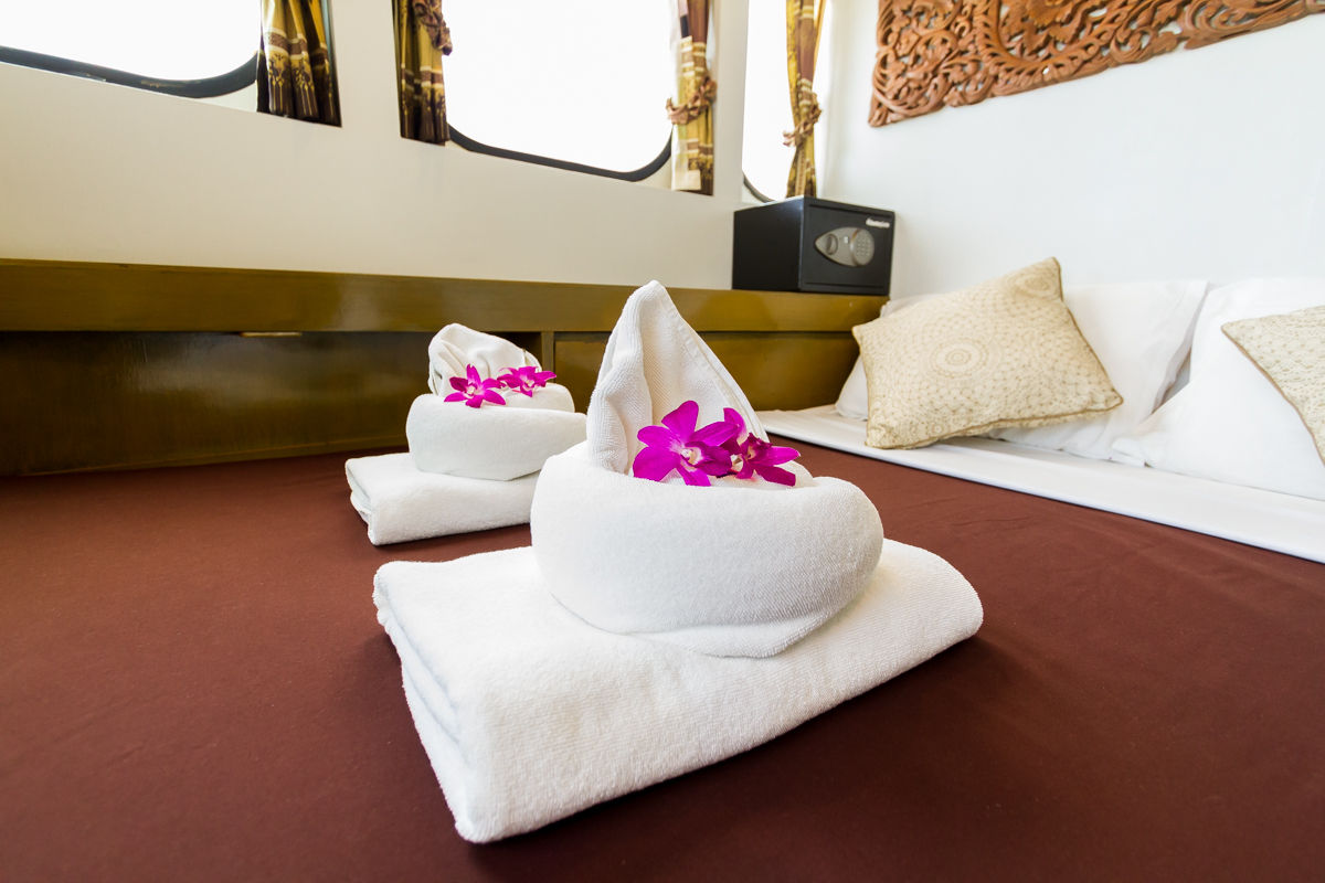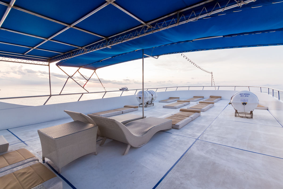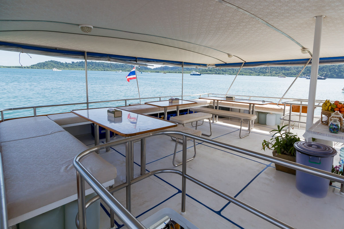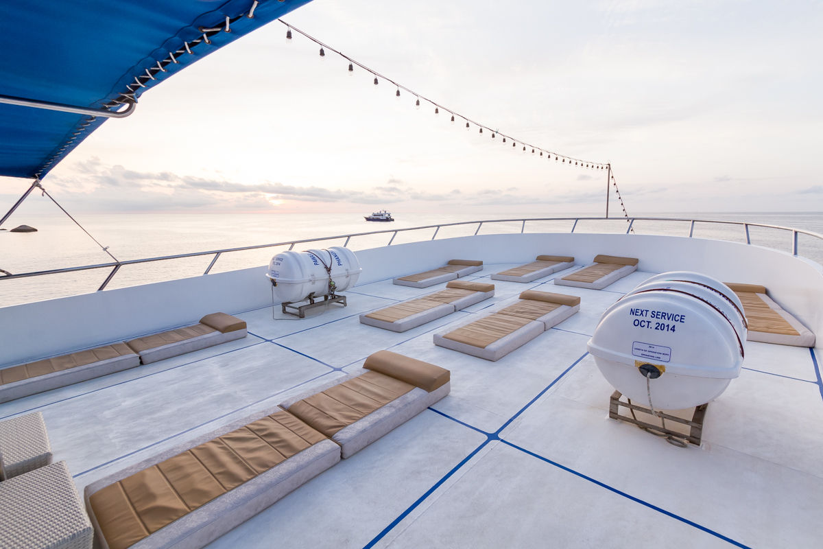 Topside, the MV Pawara Liveaboard offers 2 budget cabins with shared bathrooms and 10 cabins with en-suite bathrooms. Each cabin is air-conditioned and provides towels, toiletries, and a safety deposit box. For relaxation in between dives, guests can choose from the entertainment room equipped with a TV, DVD, sound system, karaoke, games, and more, or the sun deck with comfortable soft mattresses. In the dining room, 3 delicious Thai and International cuisine meals will be served daily, and cookies, fresh fruit, tea, coffee, and drinking water are available all day.