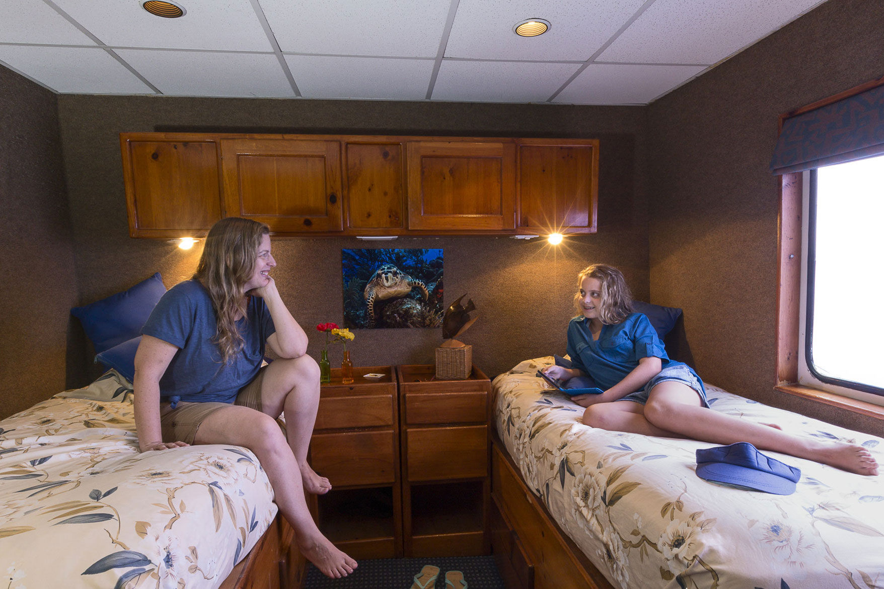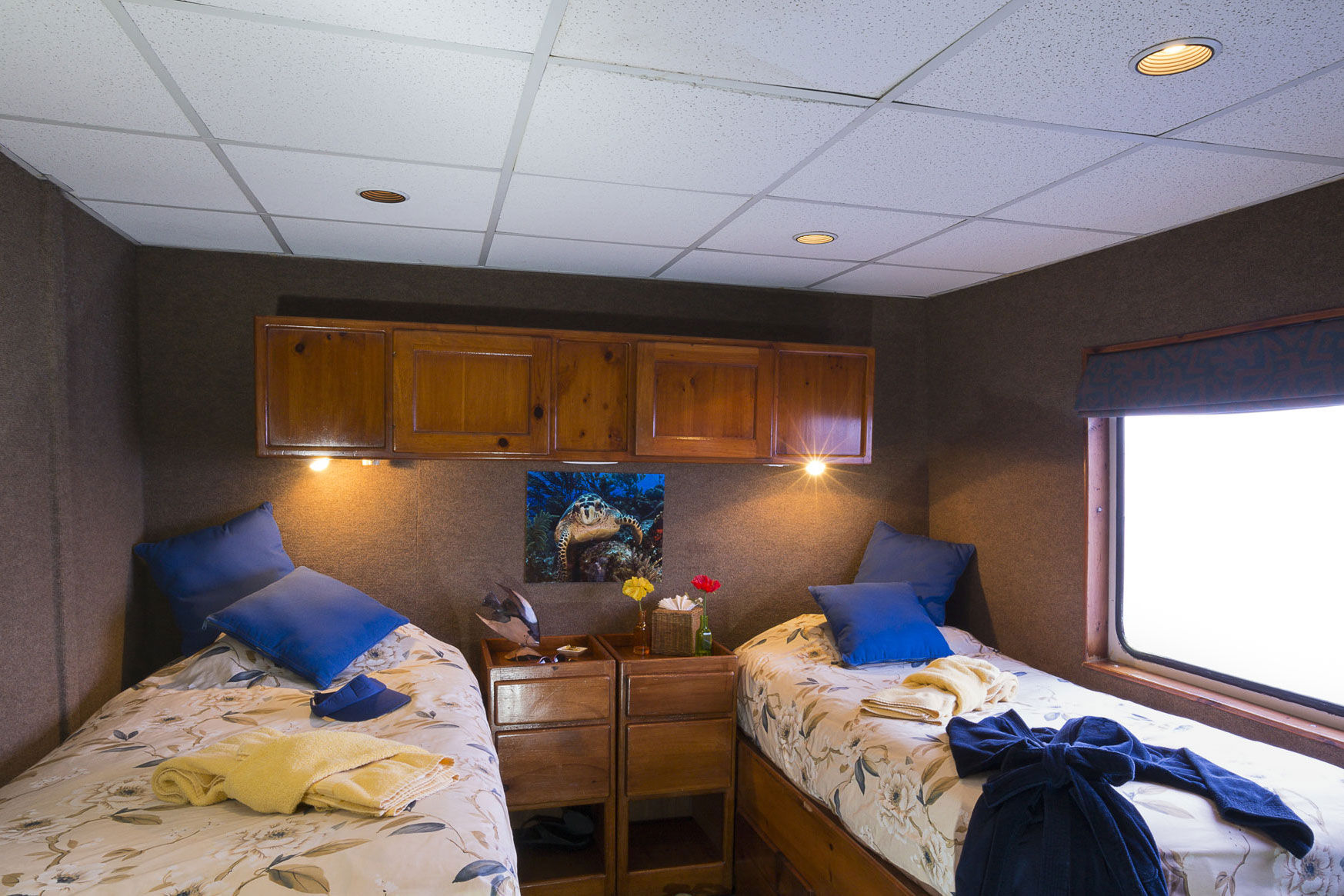 豪华的Belize Aggressor IV潜水船宿船,舒适地容纳20位客人,共有10间宽敞的客舱。在主甲板上,有七间豪华客舱,提供可合并的双床或一张特大床,还有两间配有大号床的主客舱,均设有观景窗和海景。下层甲板还设有一间配有双床或一张特大床的豪华客舱。所有客舱均设有私人浴室、独立控制的空调设备、带媒体播放器的电视监视器、衣柜、浴袍、吹风机、洗浴用品及干净的毛巾。社交区域包括一个室内空调餐厅,Belize Aggressor IV船在这里利用当地水果、蔬菜和海鲜,准备出色的美式及拉丁/加勒比风格餐点。水果汁、软饮、啤酒、葡萄酒及少量混合饮料包含在内。此外,还有一个露天休息露台、大型阳光甲板及带遮阳的鸡尾酒甲板。