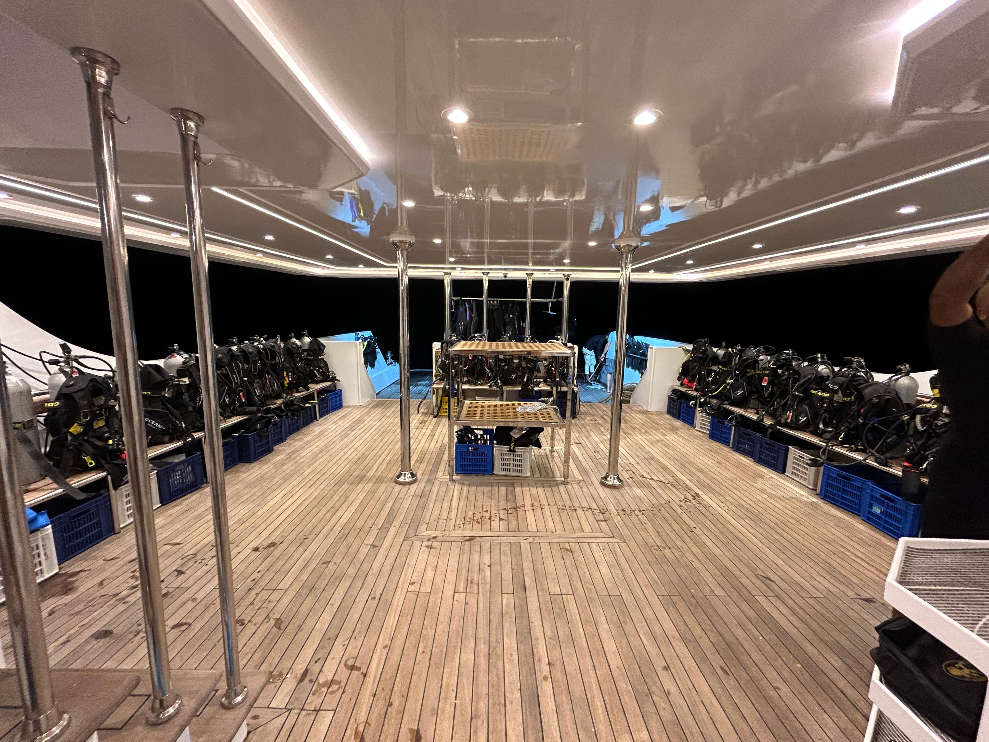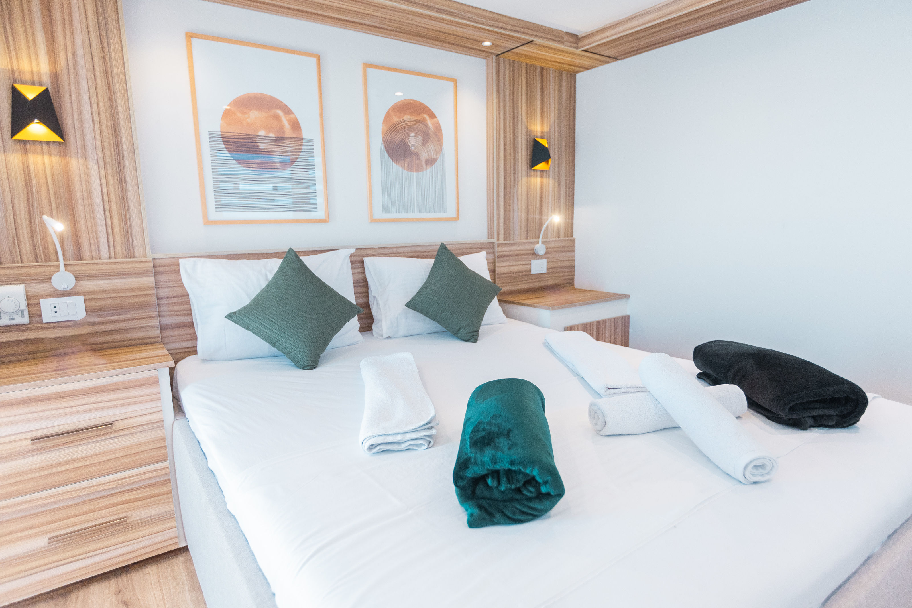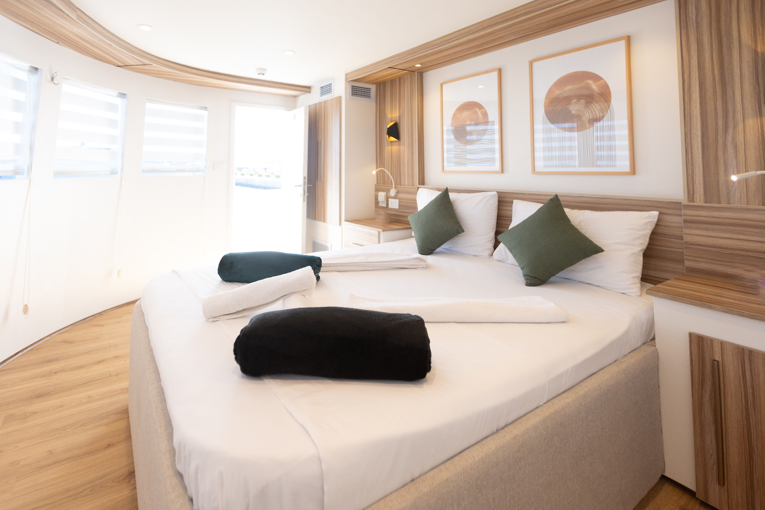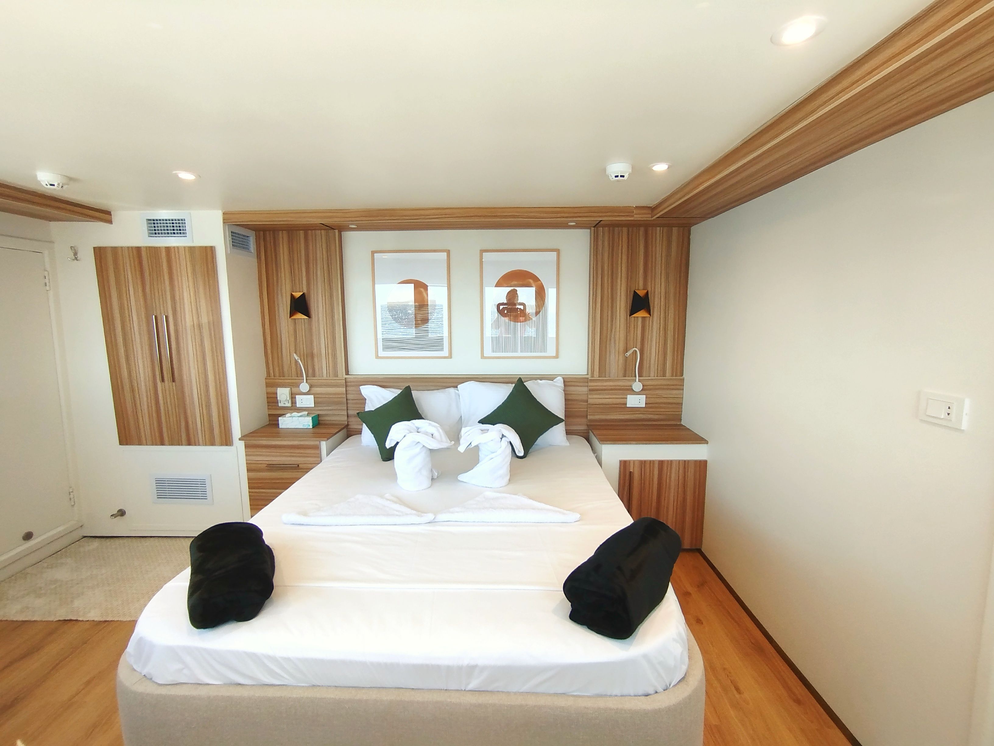 Alsuraya潜水船最多可容纳24名客人,配备现代化的设施,提供舒适便捷的体验。船上共有四层甲板,提供12个船舱,分别为双床房、单人房、上下铺房以及套房,每个舱室都设计为潜水后休息的理想场所。所有舱室位于主甲板或上层甲板,便捷的通道设计让进出更加方便。每间船舱都有大型全景窗户,也可在紧急情况下作为逃生通道。