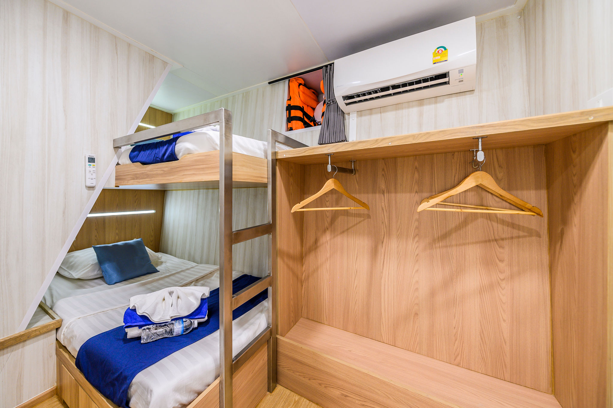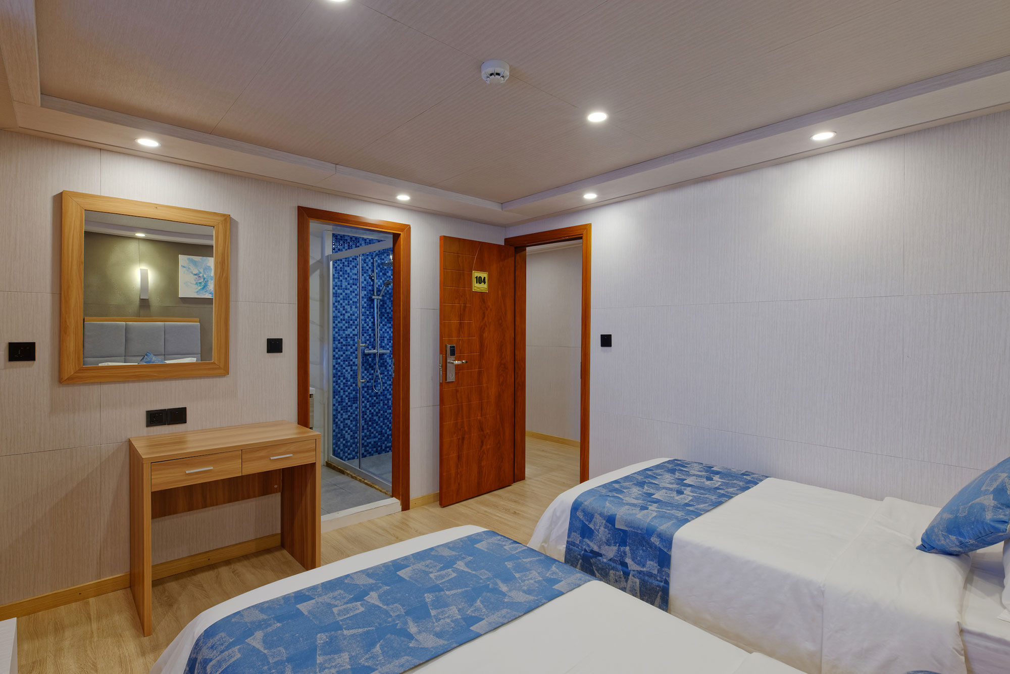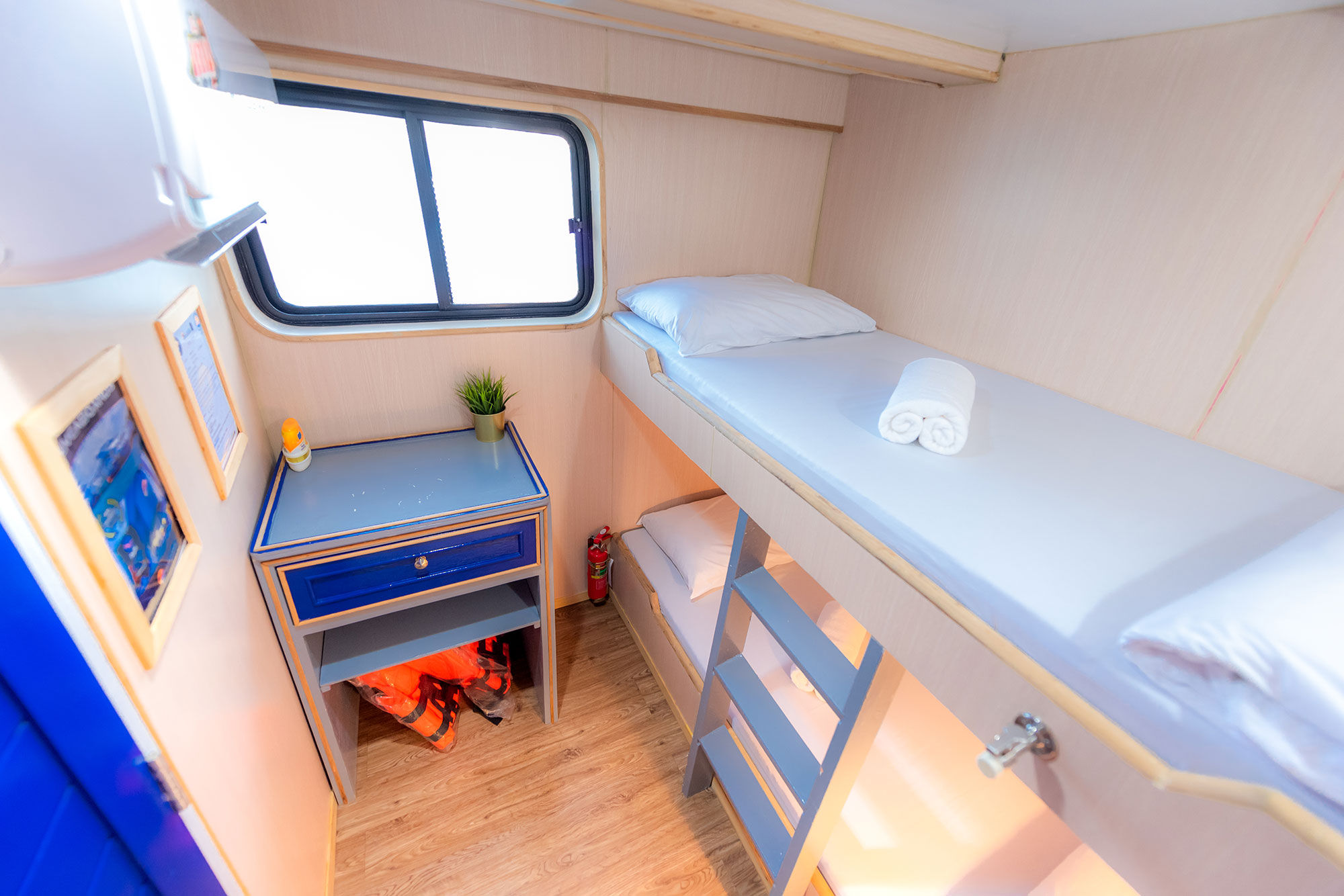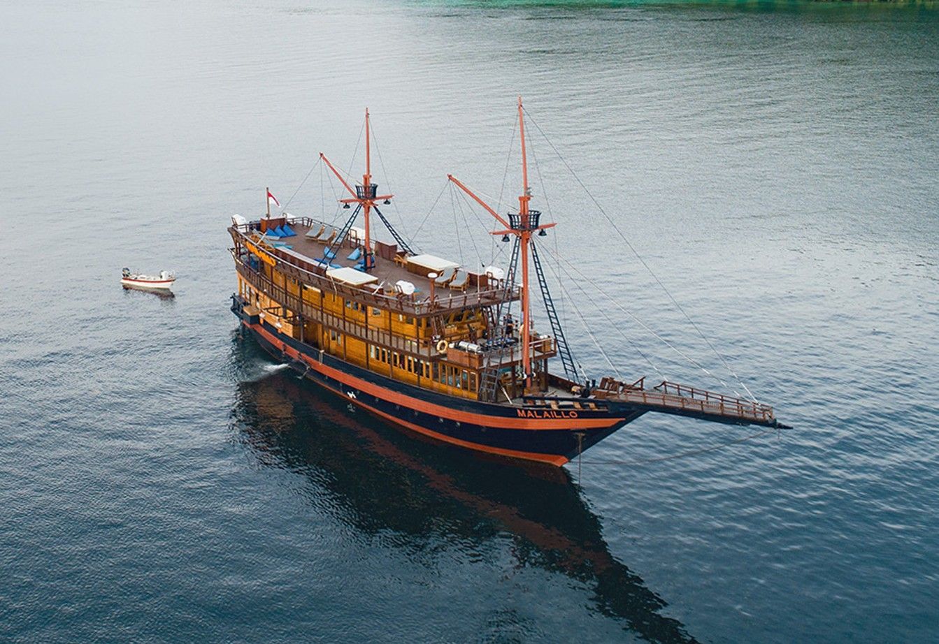 在水面上,Emperor Raja Laut潜水船是一艘传统的印尼phinisi,采用热带硬木建造,在印尼水域航行时散发出皇家气息。船上仅设有6间带独立浴室的客舱,可容纳12名宾客。有3间双床房和3间双人房,每间均配有迷你保险箱、储物空间、独立浴室和可独立控制的空调。社交区域包括全面空调的休息室,内有49英寸电视、图书馆、游戏、电影和迷你吧,全部位于与客舱同一层甲板。日光甲板位于上层甲板,配有日光和阴凉躺椅,还有一个餐桌,餐桌位于凉棚下,可提供露天用餐,同时欣赏迷人的印尼风光。